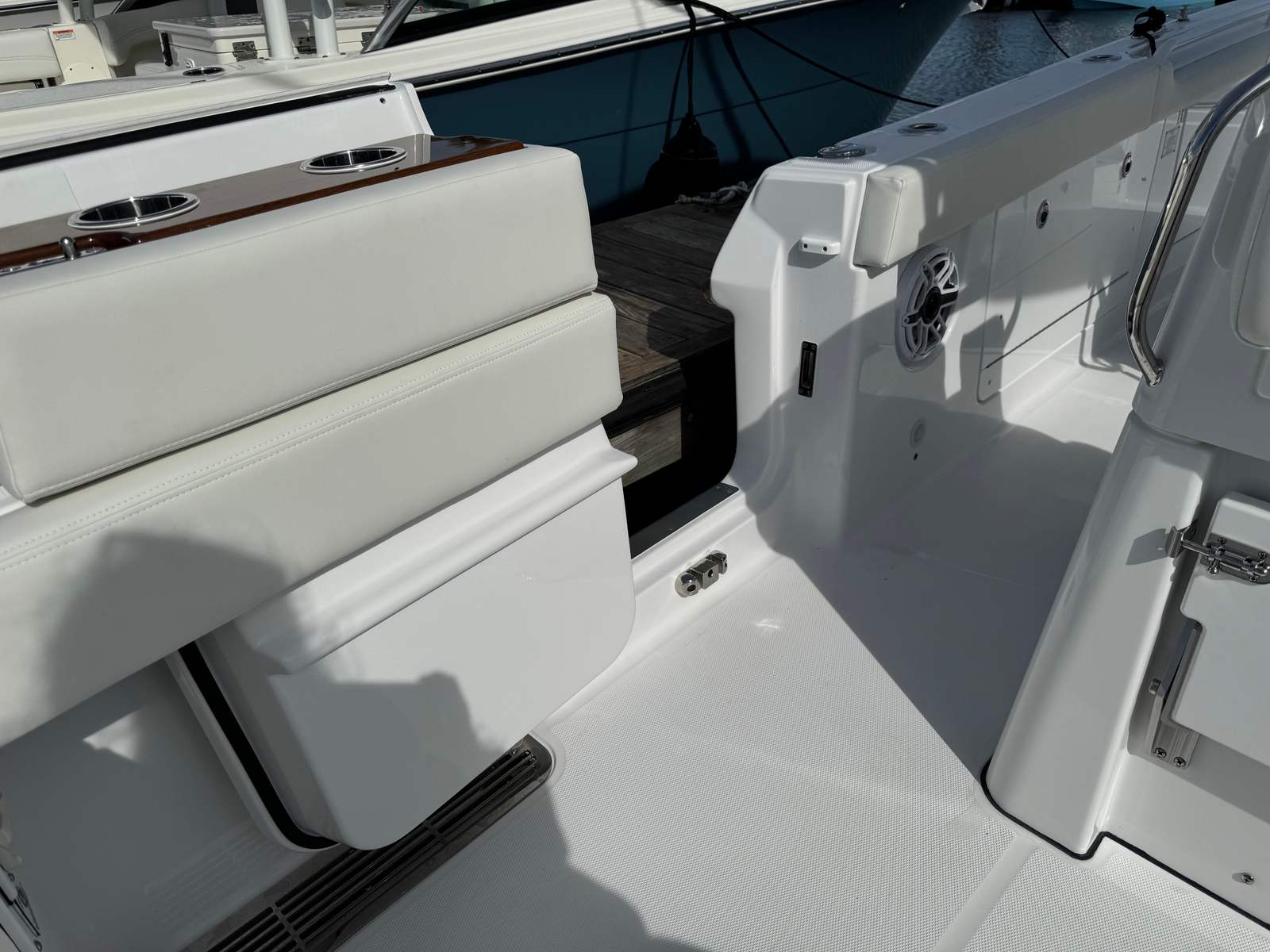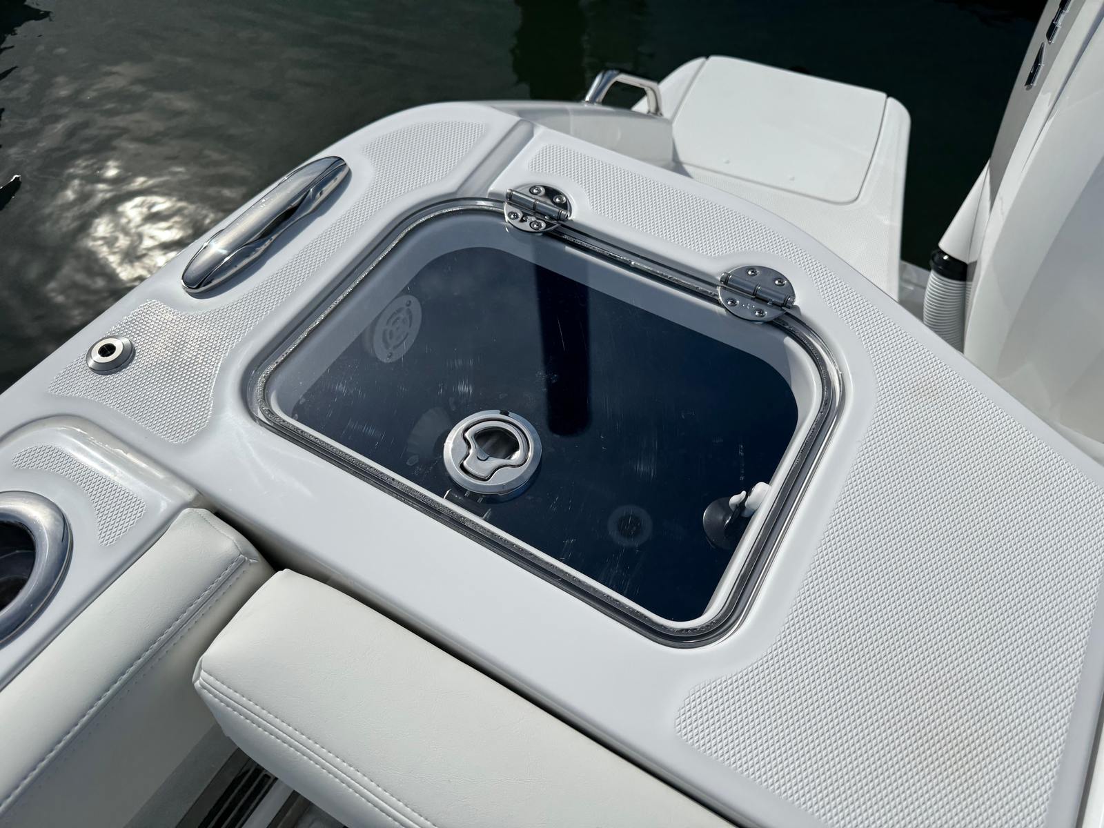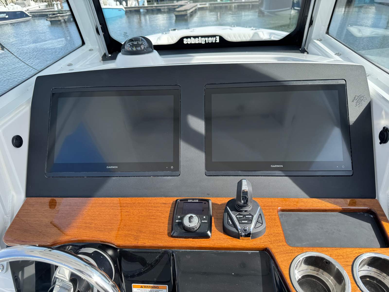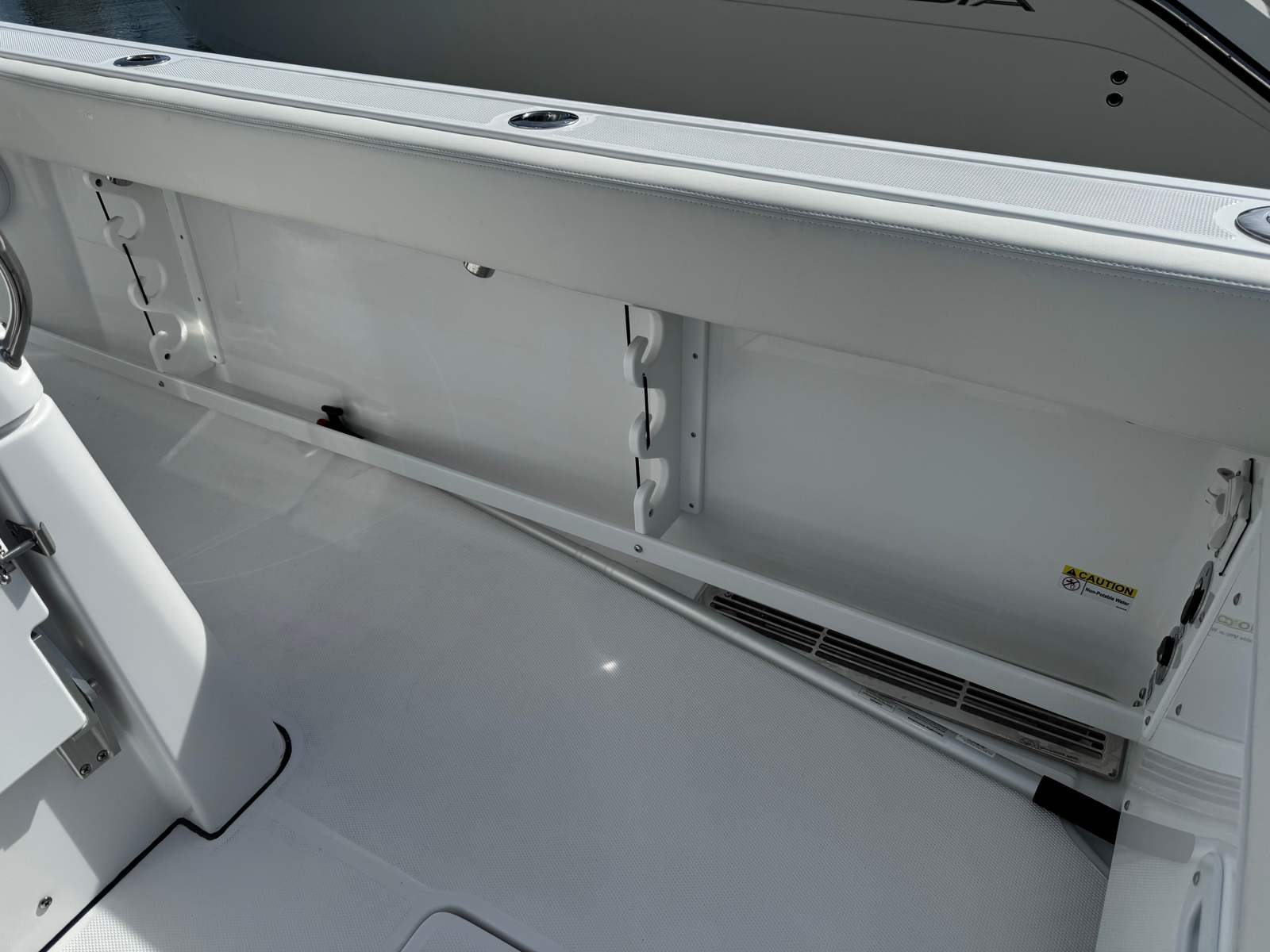The Everglades 285 CC is designed with practicality in mind, making ownership both enjoyable and hassle-free. The engine flushing system simplifies maintenance, helping to protect your investment and reduce downtime. The ladder for the side access reboarding door, with its dedicated storage, makes it easy for swimmers and divers to get back on board safely. The ample storage options, including the helm seat storage unit, keep your gear organized and within reach.Docking and maneuvering are made simple with the Yamaha joystick and autopilot systems, allowing even novice boaters to handle the 285 CC with confidence. The efficient twin engines provide a balance of power and fuel economy, so you can spend more time on the water and less time at the fuel dock.
