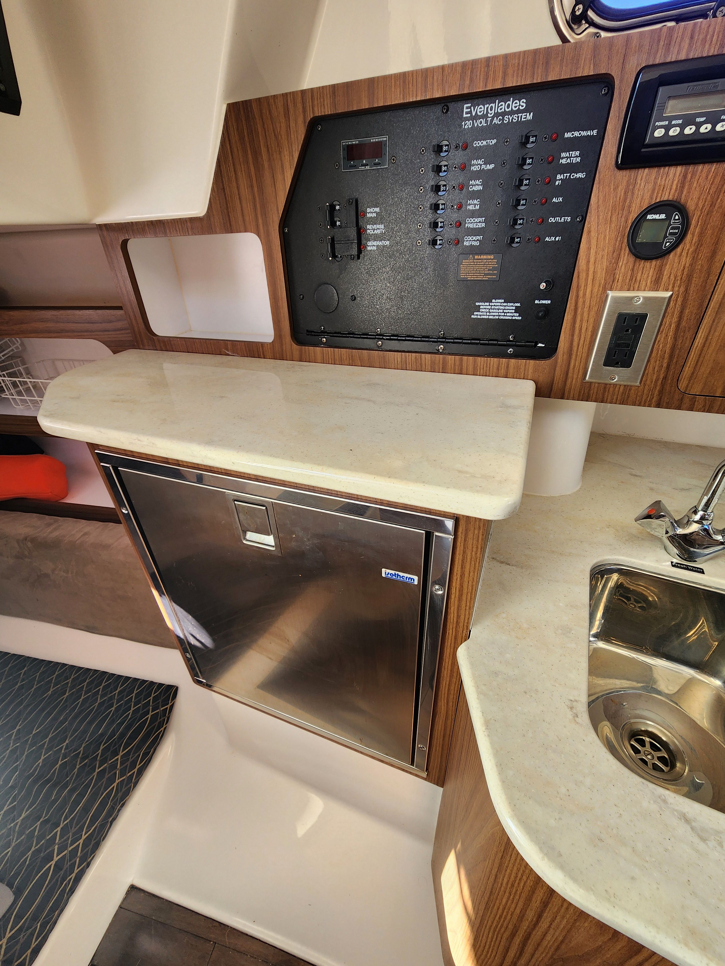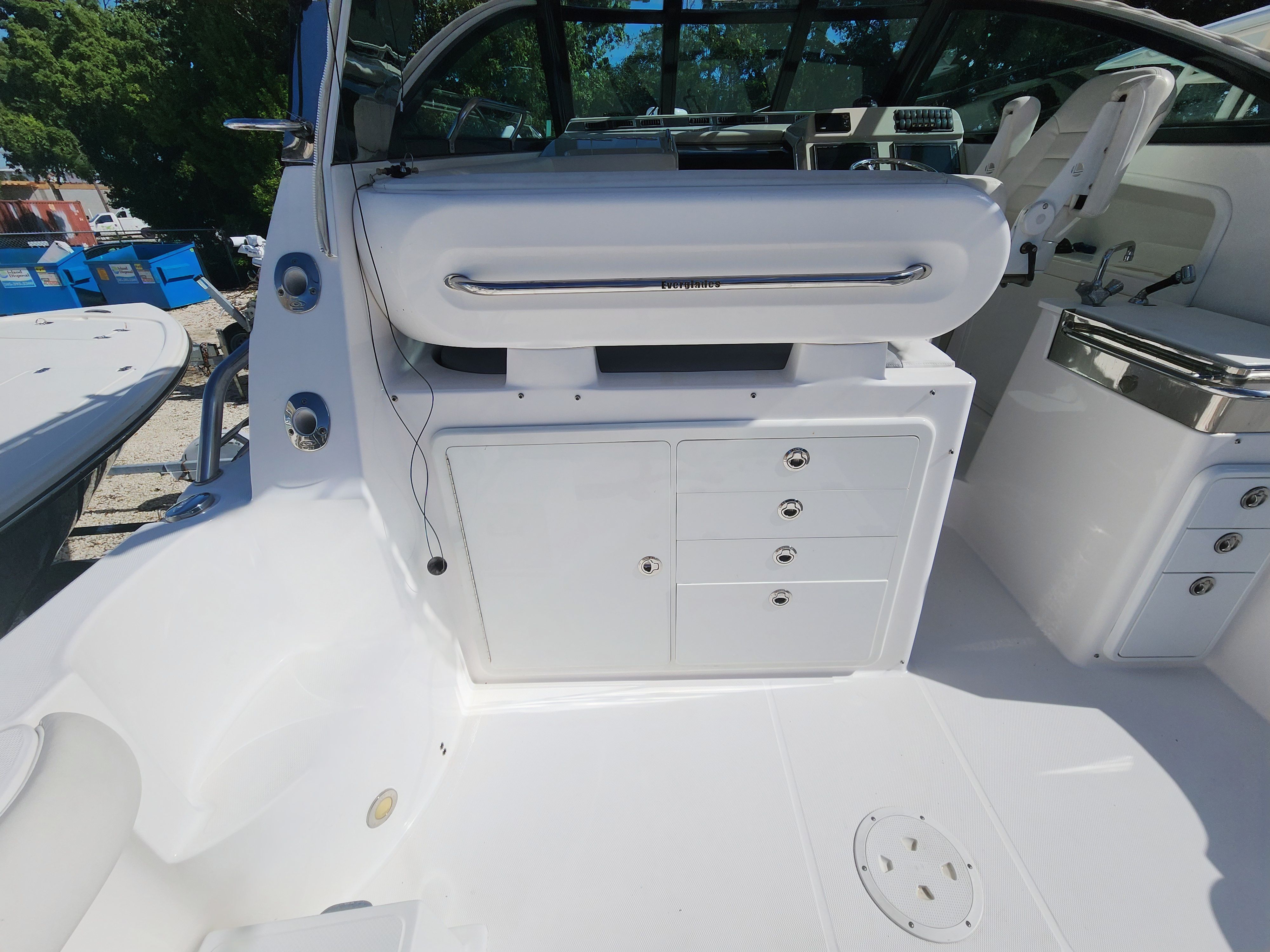 The Everglades 320 EX is loaded with features that enhance both its fishing capabilities and onboard comfort. As an offshore boat for sale, it’s designed to meet the needs of serious anglers while also catering to those who appreciate luxury and convenience. The spacious cockpit provides plenty of room for casting lines and reeling in the catch of the day, while the well-designed helm offers excellent visibility and intuitive controls for stress-free navigation. The 32-foot length ensures generous deck space, making it easy to move around and enjoy all the amenities this Everglades boat for sale has to offer.