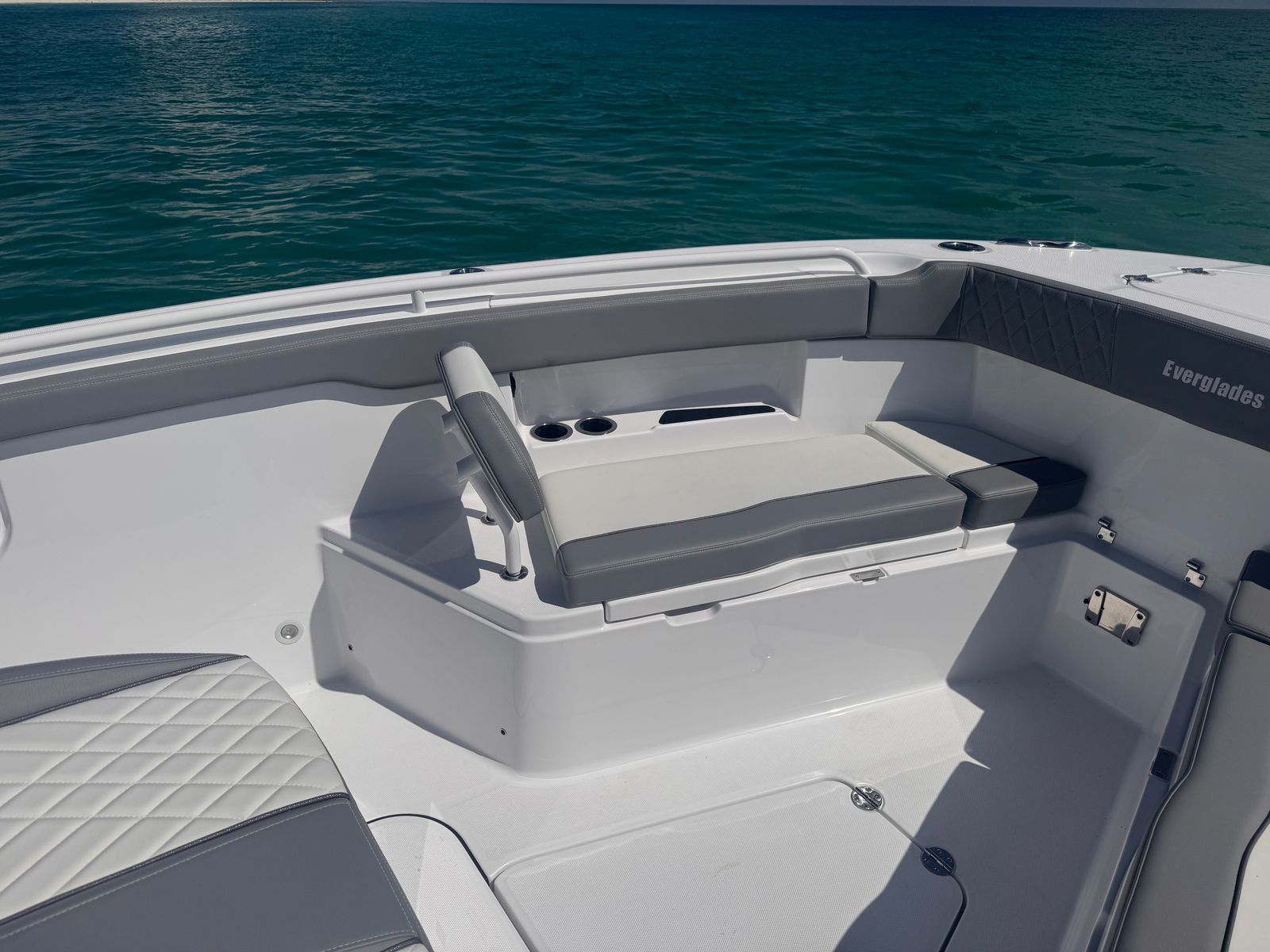 The Everglades 375 CC is loaded with premium features designed to enhance comfort, convenience, and functionality. The Electrical Convenience Package ensures that all your electronic needs are met, while the interior cabinet color in Sanibel adds a touch of elegance to the onboard environment. The Flint Gray upholstery offers both durability and style, creating a welcoming atmosphere for guests.Protection from the elements is provided by the comprehensive Canvas Package, which includes covers for the console, forward console seat, helm seat, bow seating accent and backrest, as well as the mezzanine seat or rigging station. The white canvas color complements the boat’s overall aesthetic, maintaining a clean and modern look.For anglers and entertainers alike, the Chiller Plate Package is a standout feature, keeping your catch or refreshments perfectly chilled in the mezzanine tub and transom fish box. The Engine Flushing System for all three engines simplifies maintenance, ensuring your investment remains in top condition. The helm seat upgrade features three Release teak ladder back helm seats with sliders, replacing the standard triple Pompanette seats for enhanced comfort and support during long days on the water.