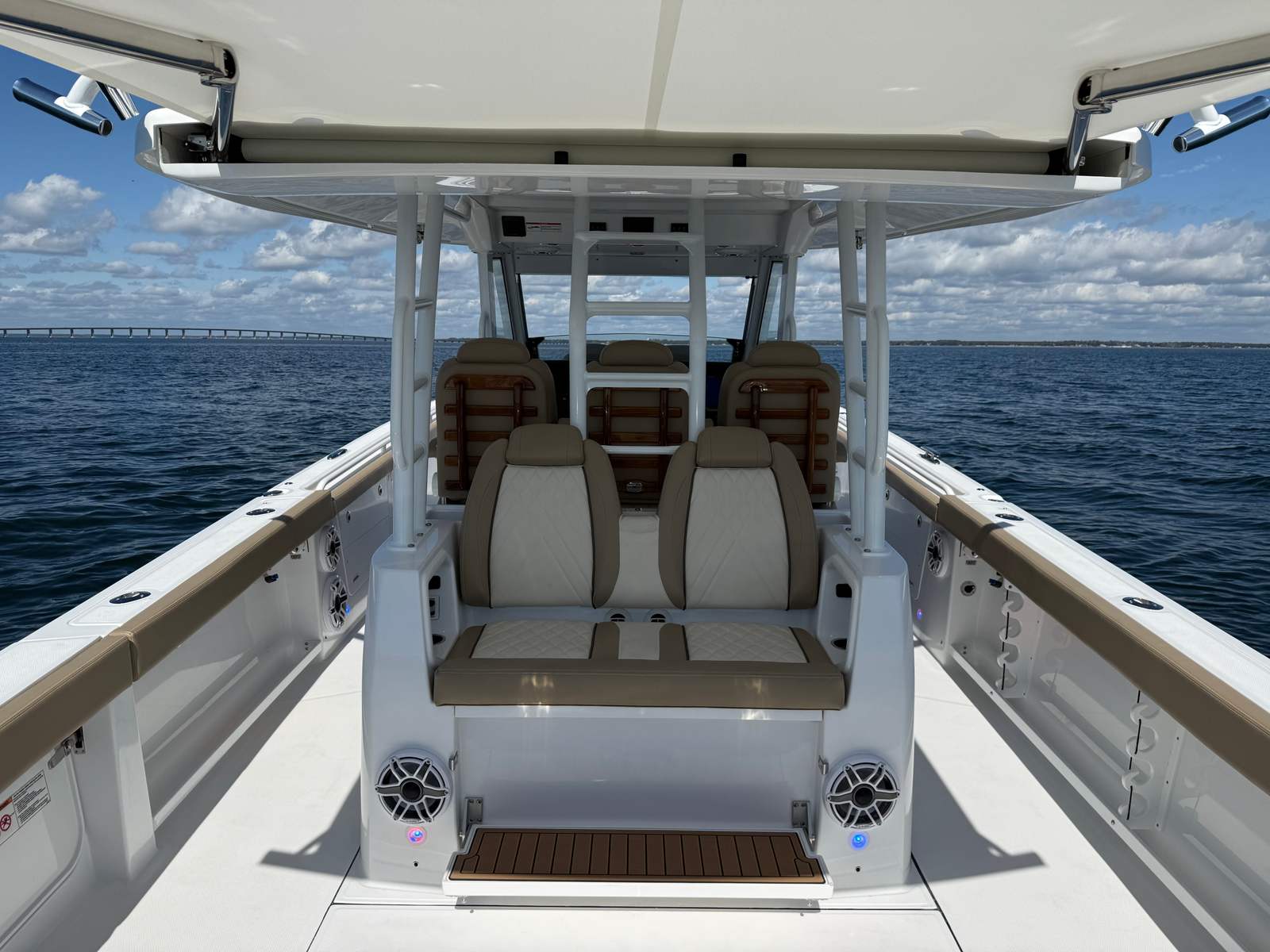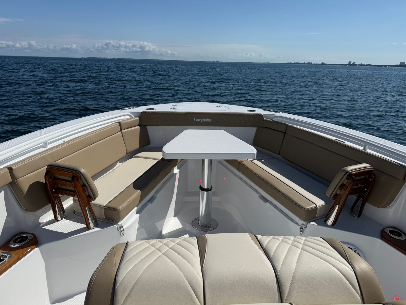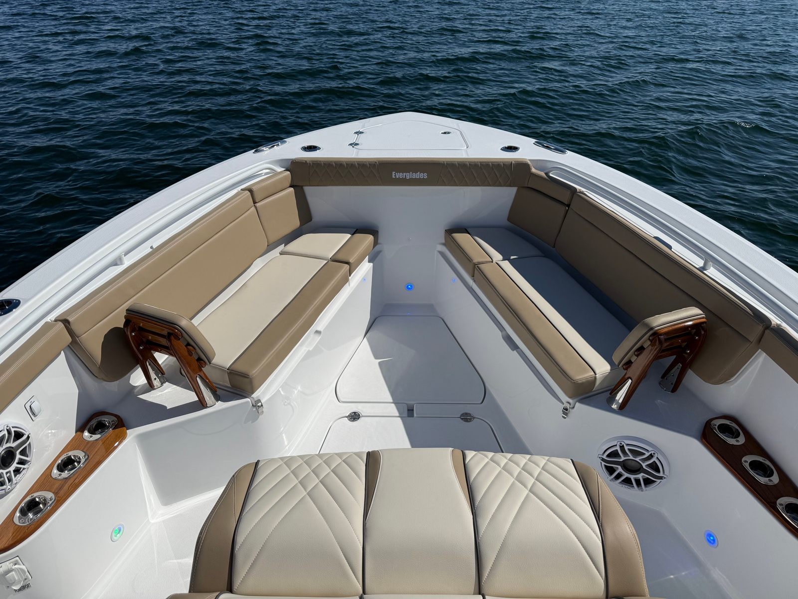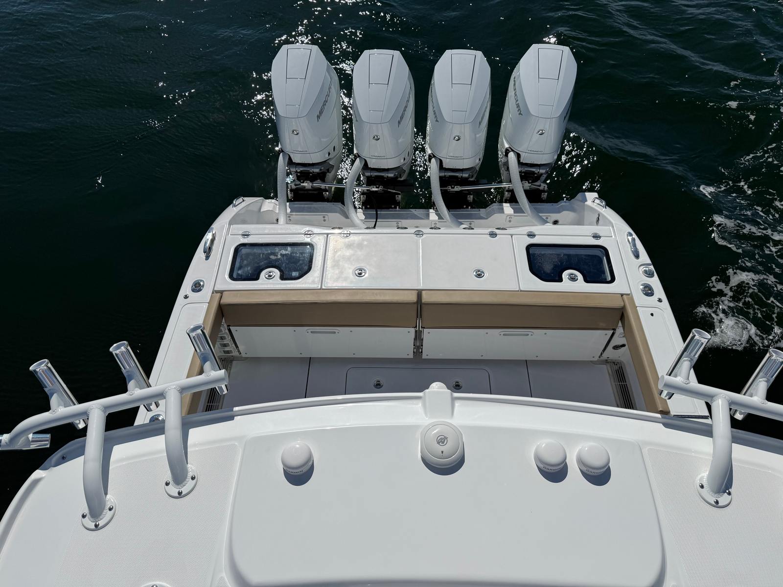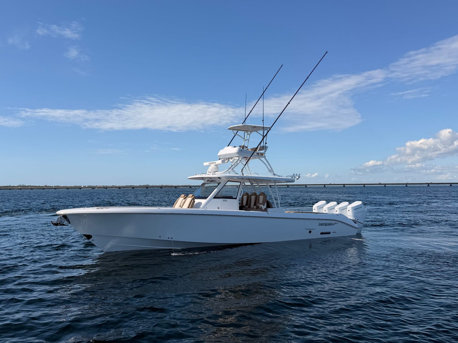 At the heart of the Everglades 395 CC is a powerhouse of performance. Equipped with quad Mercury 425 V10 engines, this center console boat boasts an impressive 1,700 horsepower. The advanced Mercury engines are finished in sleek white, perfectly complementing the boat’s sophisticated aesthetic. With the inclusion of autopilot and joystick controls, both at the main helm and the upper station, navigating tight marinas or docking becomes effortless and precise. The Everglades 395 CC is engineered for speed, agility, and reliability, ensuring you reach your favorite destinations quickly and safely, no matter the conditions.