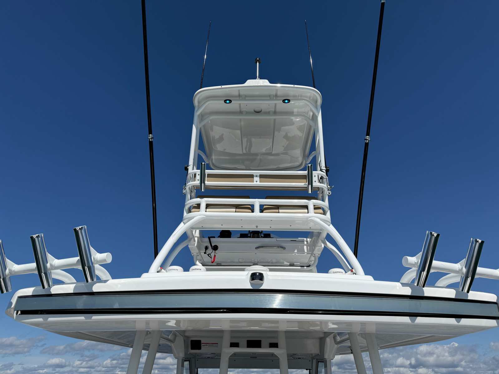 - Upper Station - w/ auto pilot and joystick, sun top, 2 drink holders, folding helm seat bolsters, stainless steel grab rail, glove box, Garmin GHS 11 handset, Garmin 8616 additional screen
