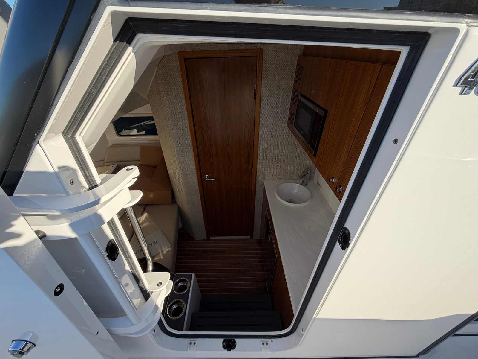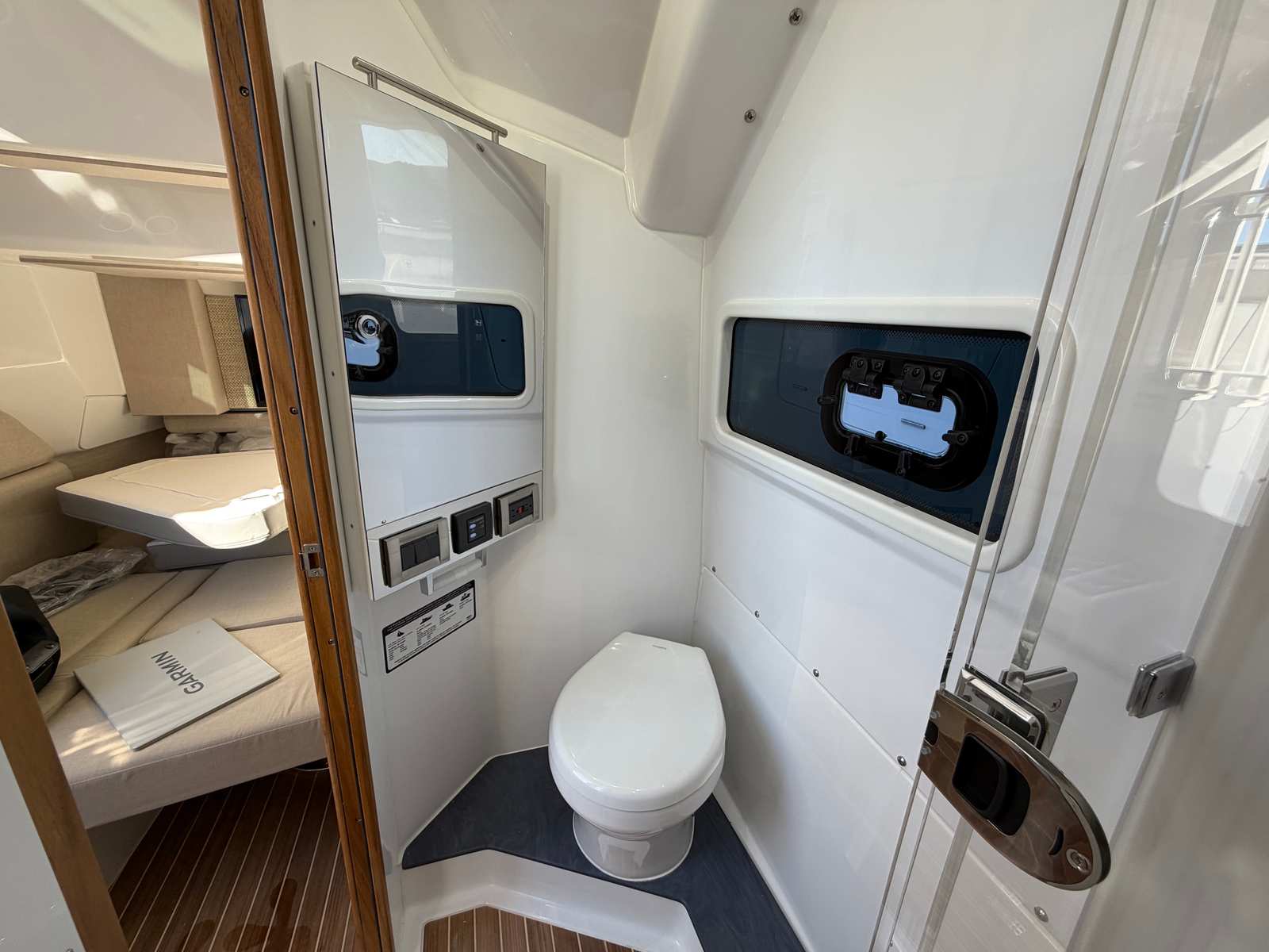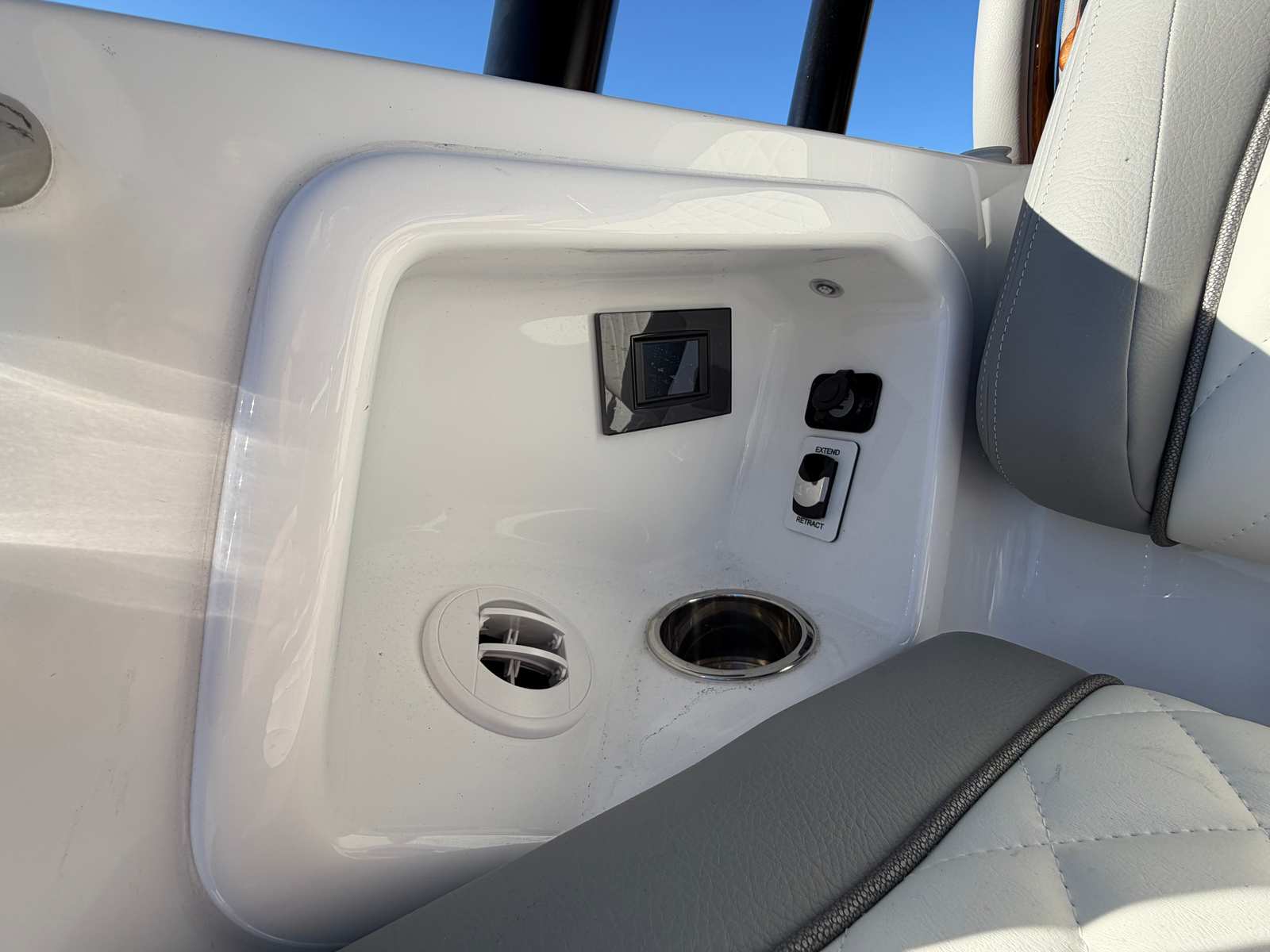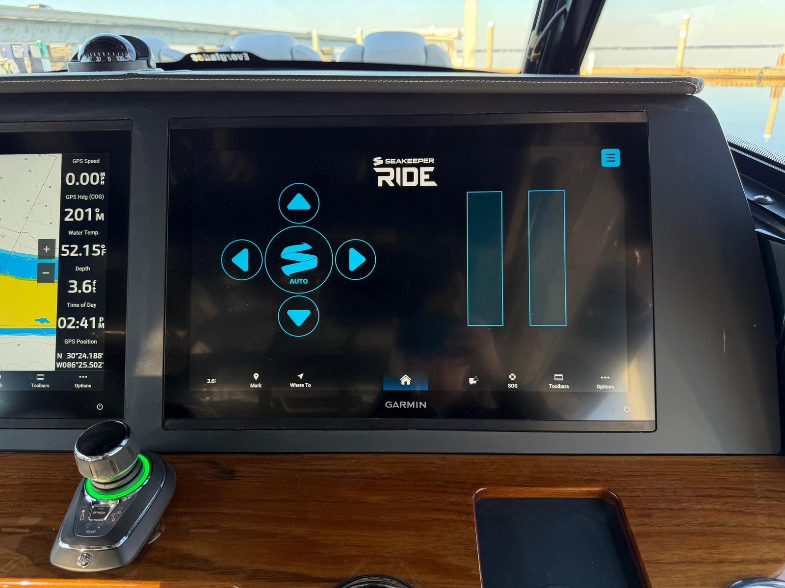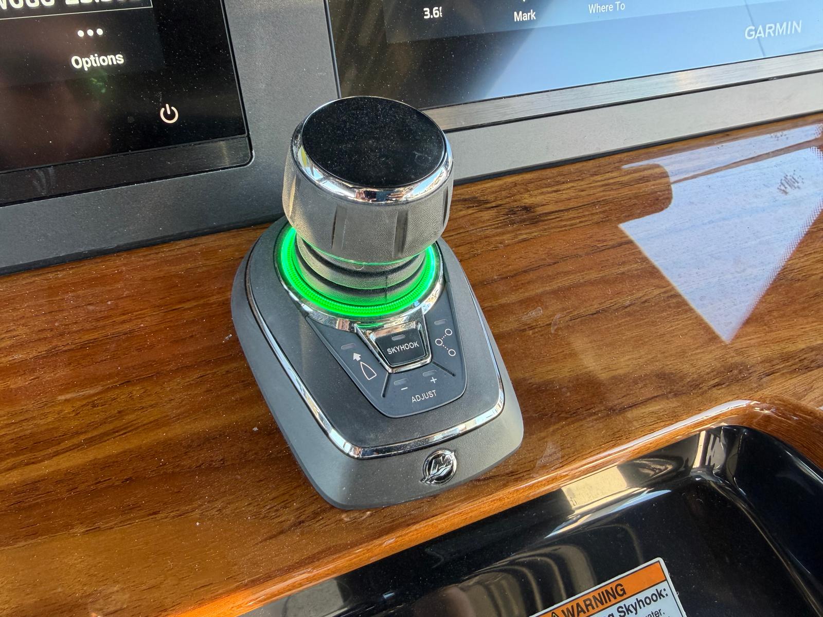 - Full Upper Station - w/ auto pilot and joystick, sun top, 2 drink holders, folding helm seat bolsters, stainless steel grab rail, glove box, Garmin GHS 11 handset, Garmin 8616 additional screen