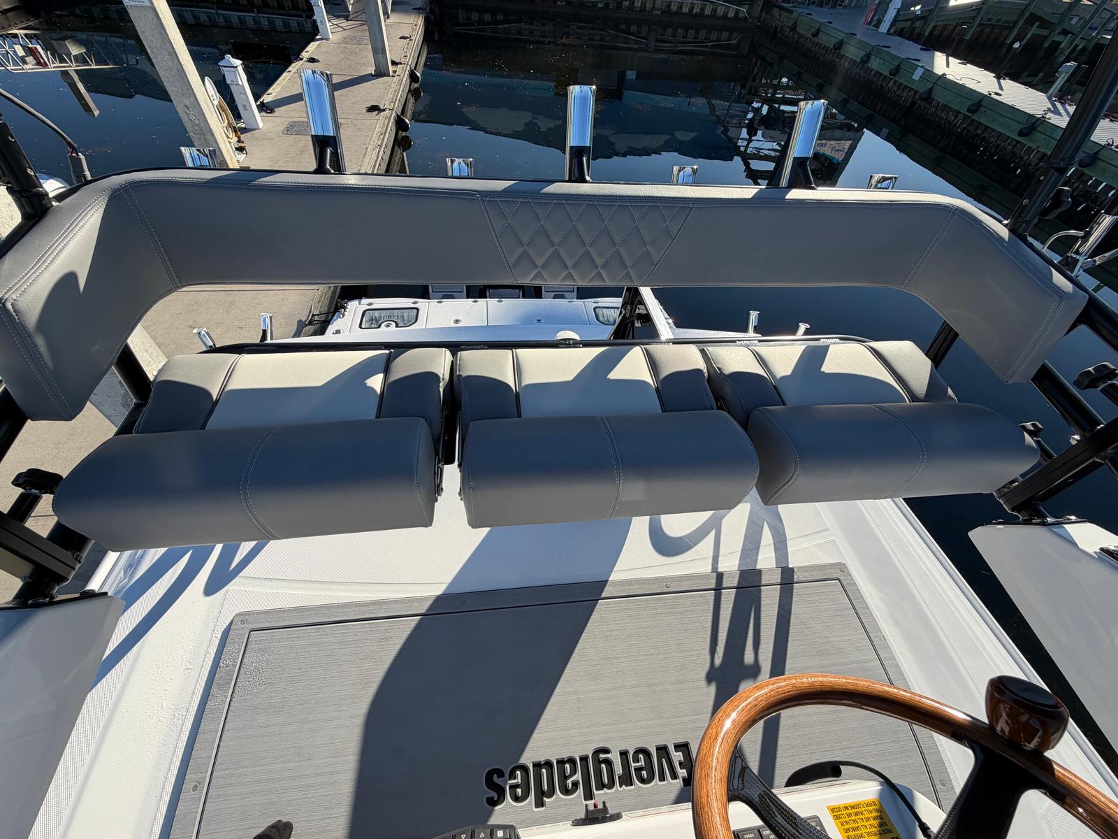 The Everglades 455 CC is packed with premium features that elevate your time on the water. The full upper station includes a sun top for shade, two drink holders for convenience, folding helm seat bolsters for comfort, a stainless steel grab rail for safety, and a glove box for secure storage. The helm is equipped with a Garmin GHS 11 handset and an additional Garmin 8616 screen, providing advanced navigation and communication capabilities. The interior cabinet color is Ocean (Teak & Holly), adding a touch of elegance to the cabin space, while the Flint Gray upholstery offers a modern and inviting atmosphere.A comprehensive canvas package is included, featuring covers for the forward console seat, console, helm seat, mezzanine seat, bow seats, second row, and forward rod/cup holders. These covers help protect your investment and keep the boat looking pristine. The upper station, seat, and console are all thoughtfully designed for maximum comfort and utility, ensuring that every outing is enjoyable and stress-free.