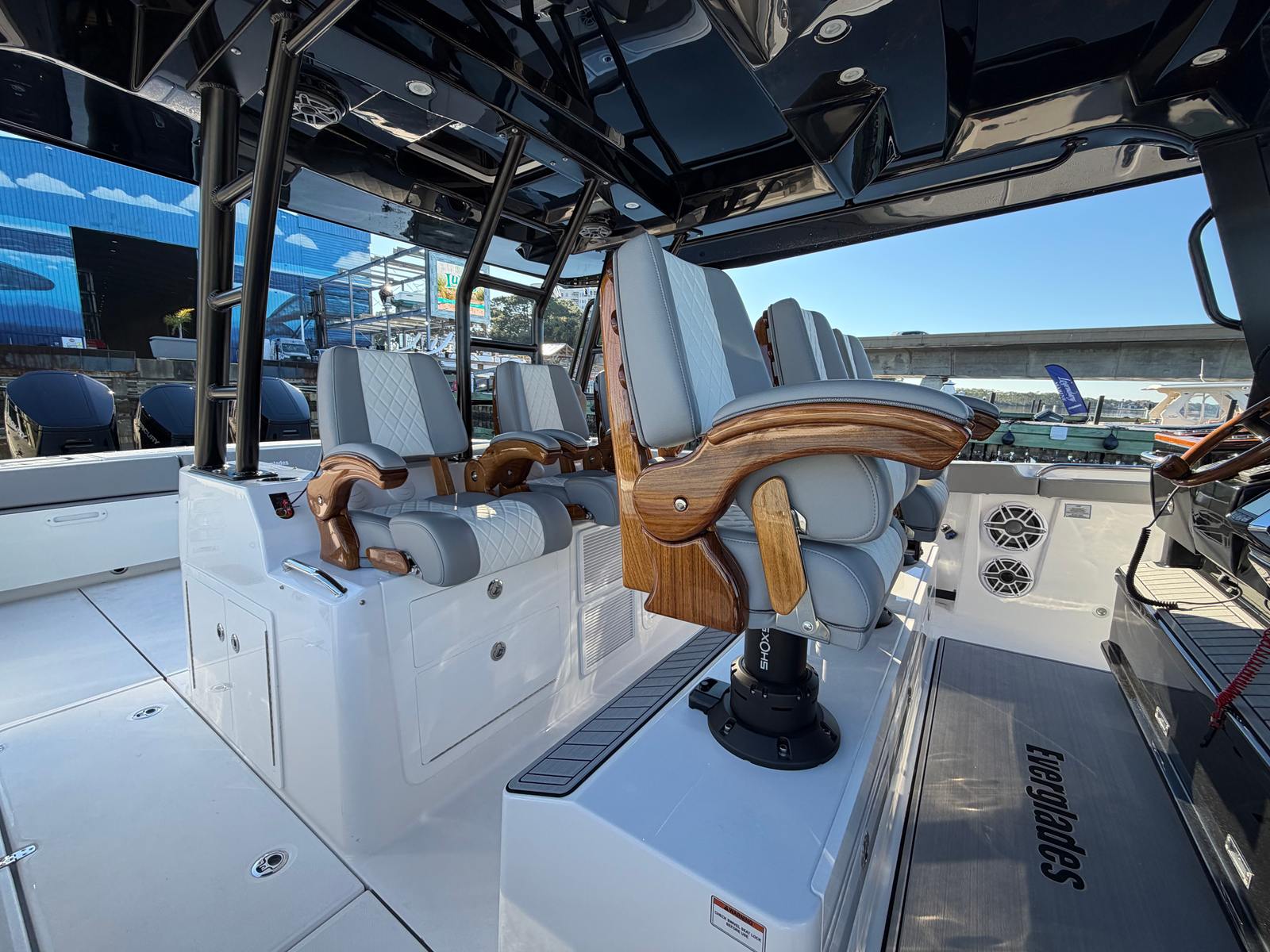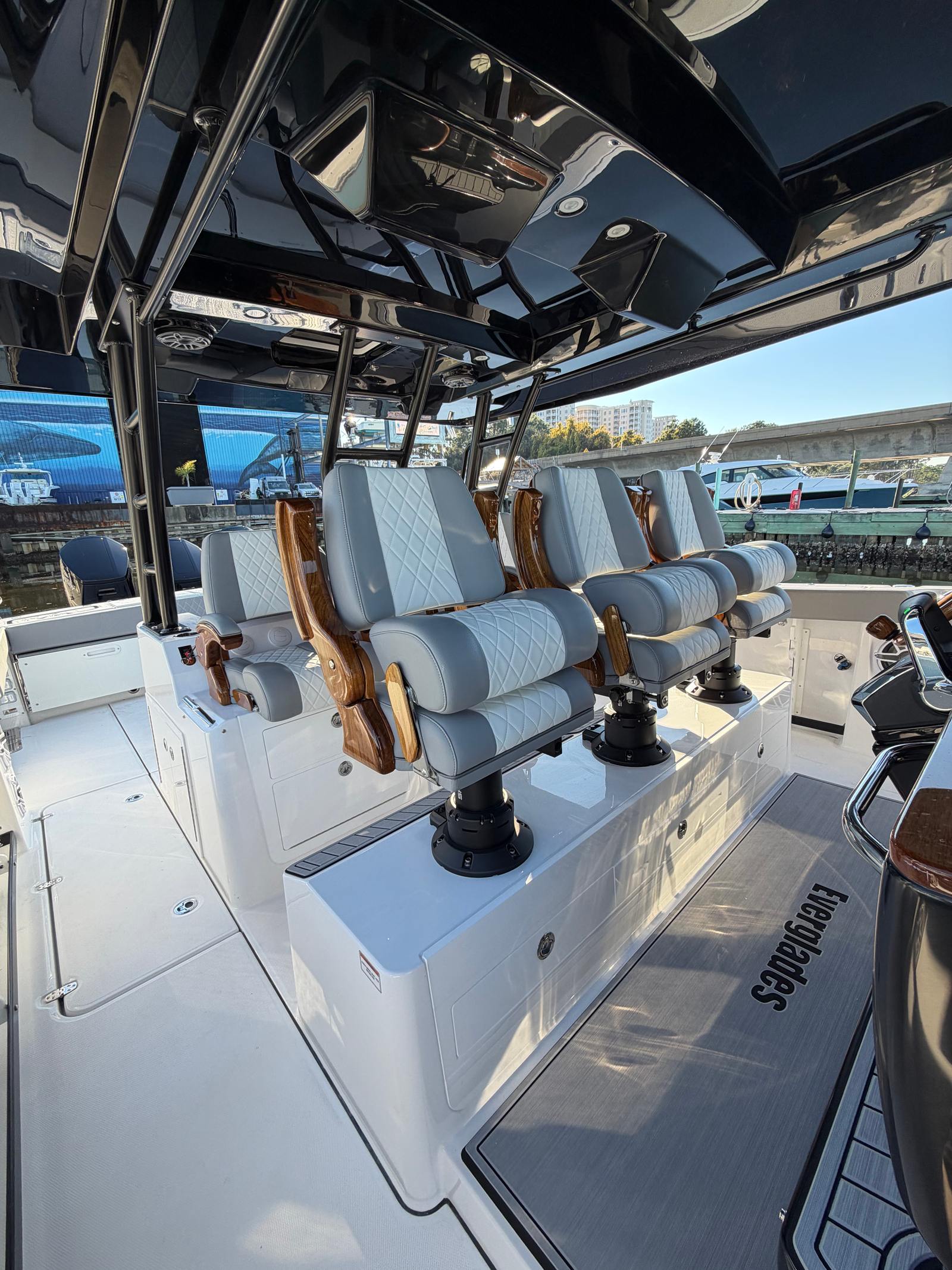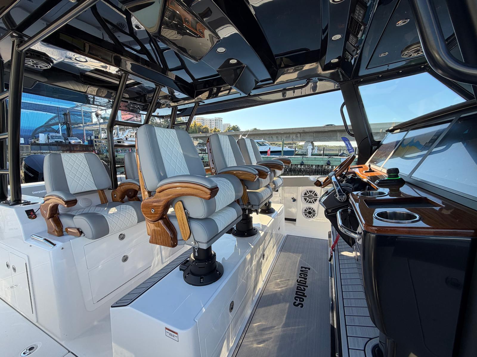 Powering the Everglades 455 CC are three Mercury 600 V12 Verado engines, delivering a combined 1800 horsepower. This triple-engine setup provides exhilarating speed, smooth acceleration, and reliable performance for all your boating adventures. The advanced Mercury engines are renowned for their efficiency, quiet operation, and robust power, making them ideal for both offshore excursions and leisurely cruises. With joystick and autopilot controls, maneuvering this center console boat is effortless, whether you’re docking in tight spaces or navigating open waters. The full upper station, equipped with autopilot and joystick, offers superior visibility and control, ensuring a seamless and enjoyable piloting experience.