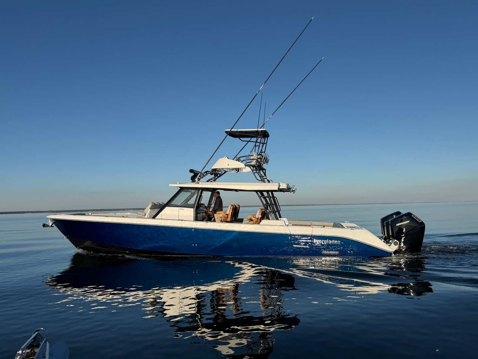 The Everglades 455 CC is designed with practicality in mind, making ownership both enjoyable and convenient. The joystick and autopilot systems simplify docking and navigation, reducing stress and allowing you to focus on the fun. The ample storage options, including the glove box and covered seating areas, keep your gear organized and protected from the elements. The durable canvas package helps maintain the boat’s pristine condition, while the high-quality upholstery and cabinetry ensure lasting beauty and comfort.Fuel efficiency is enhanced by the advanced Mercury engines, allowing you to spend more time on the water and less time refueling. The robust construction and premium materials provide peace of mind, knowing that your investment is built to withstand the rigors of marine environments. Whether you’re planning a weekend getaway or a spontaneous day trip, the Everglades 455 CC is ready to accommodate your needs with style and reliability.