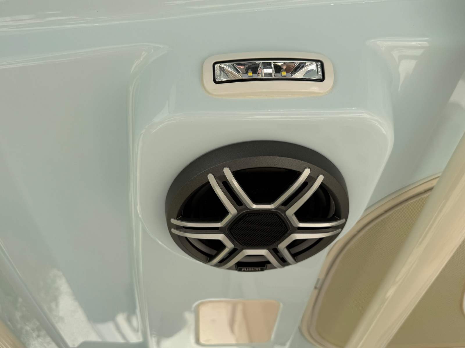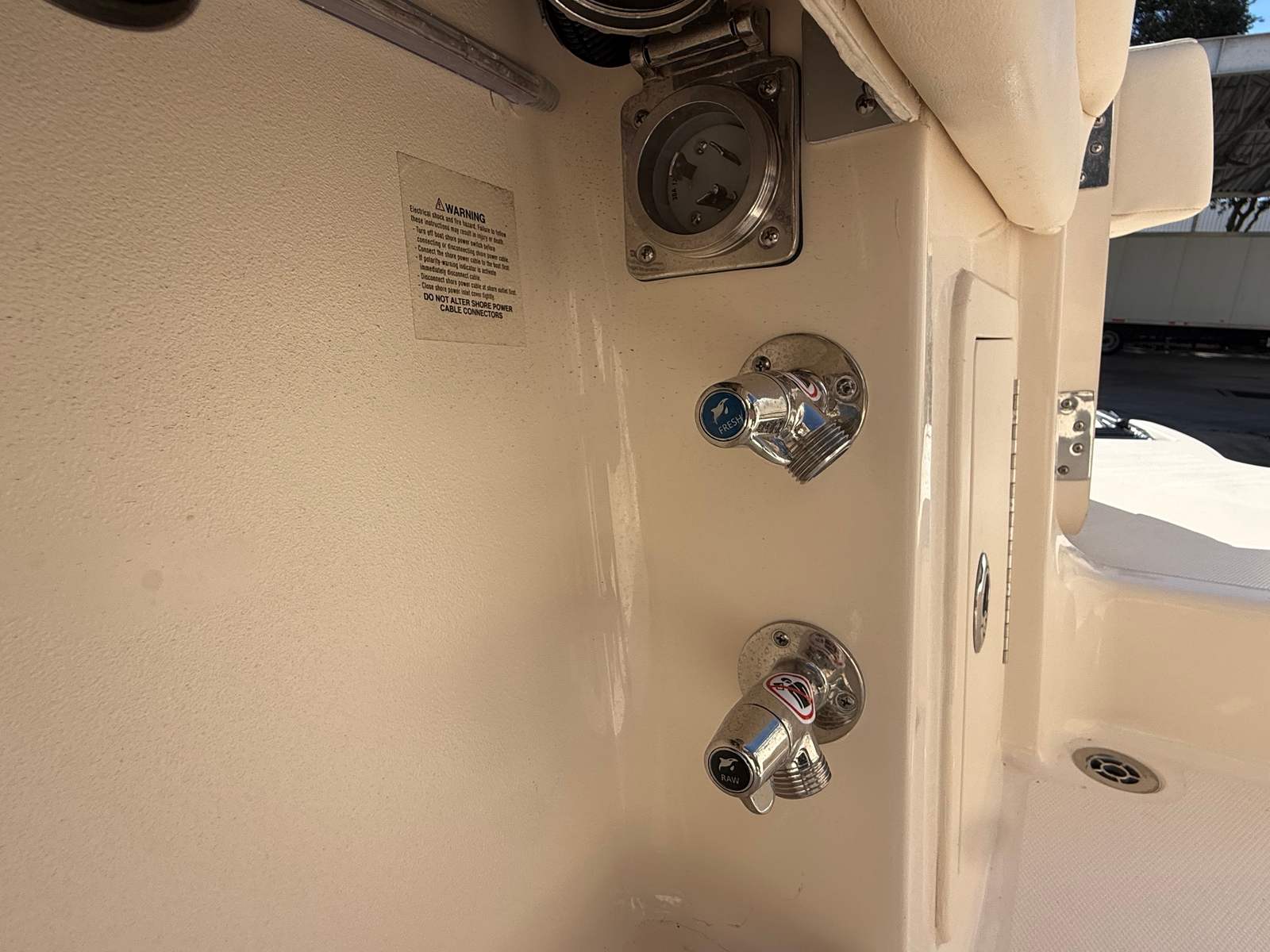 Step aboard and discover a suite of special features designed to elevate your boating experience. The bow thruster offers effortless docking and tight maneuvering, while the bow fiberglass table provides a perfect spot for socializing or enjoying a meal with friends and family. The cockpit step on the starboard side ensures easy access and movement throughout the vessel, enhancing safety and convenience.Illuminate your evenings with three underwater lights, creating a captivating ambiance for nighttime cruises or dockside gatherings. The Ocean Mist Blue gel coat not only adds visual appeal but also speaks to the boat’s premium quality. For sun protection and comfort, the electric Sure Shade top in Oyster color, paired with the Jit Top underside in Ocean Mist, delivers shade and style in equal measure. Anglers will appreciate the integrated trolling motor, expanding your fishing capabilities and making the Canyon 326 a true multi-purpose Center Console boat for sale.