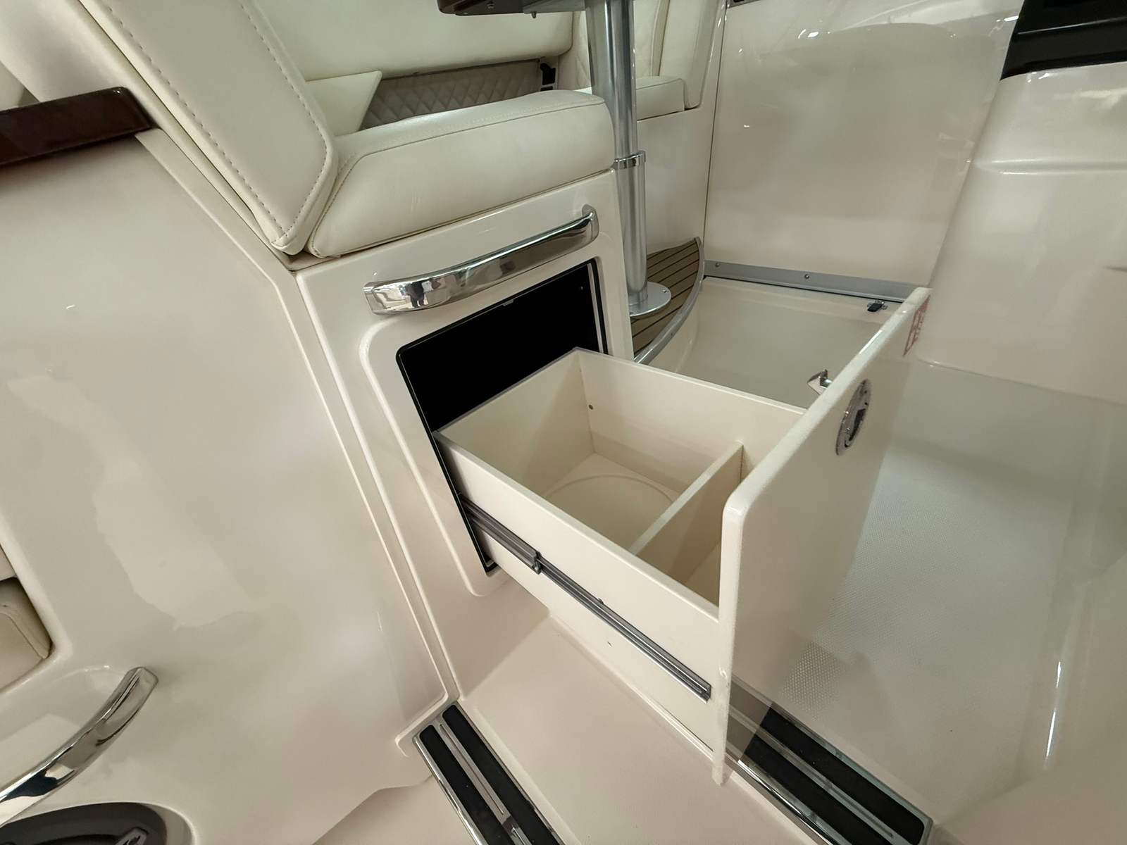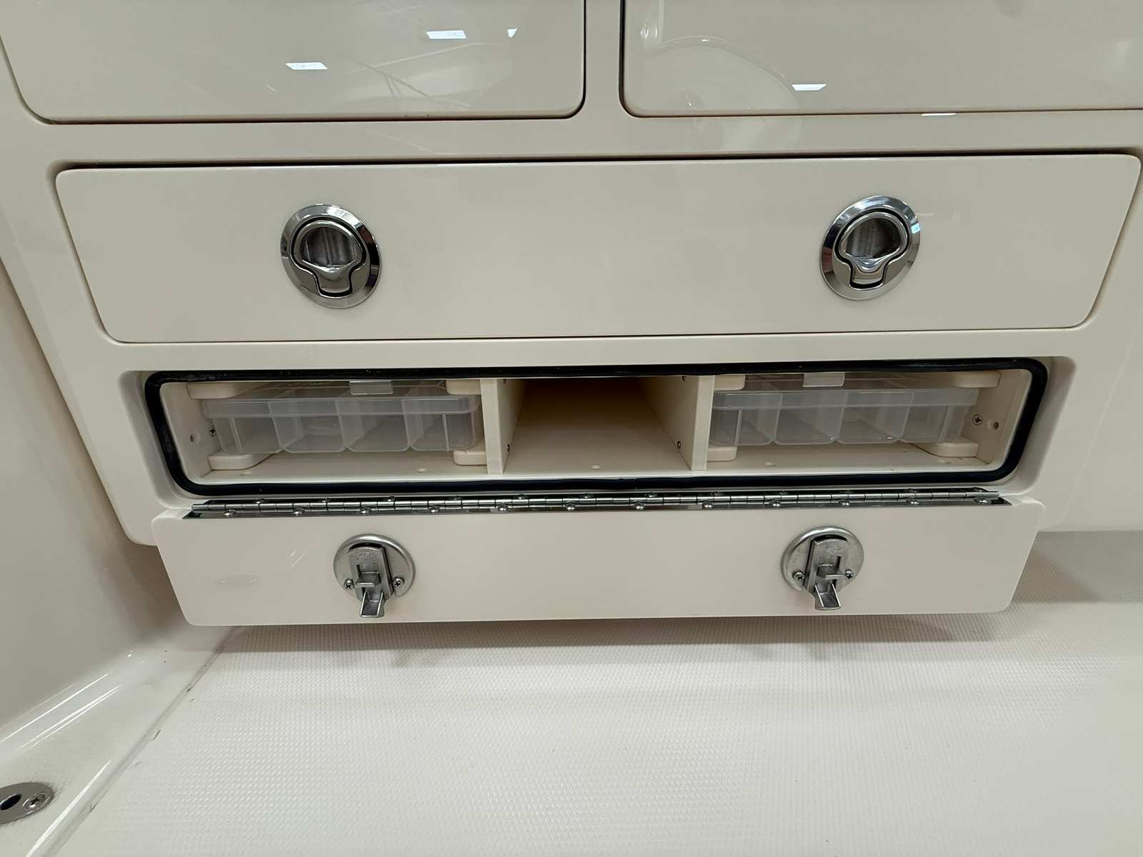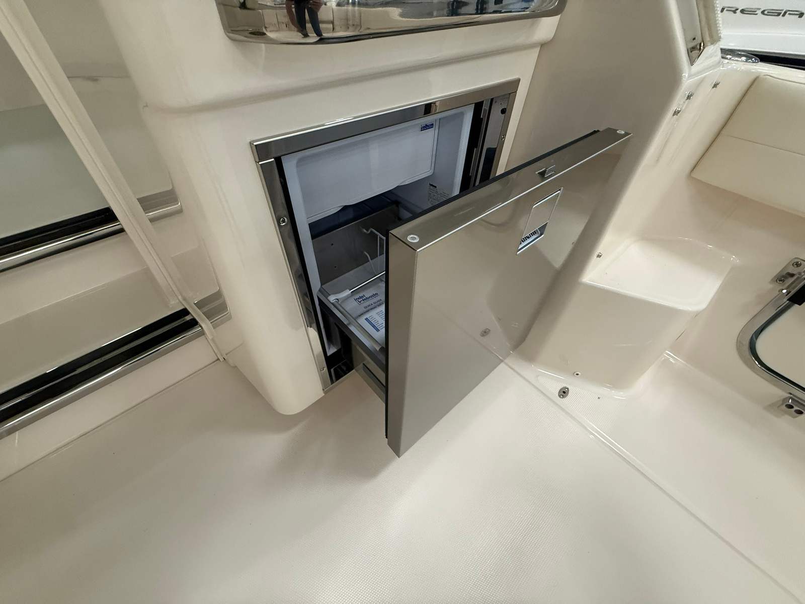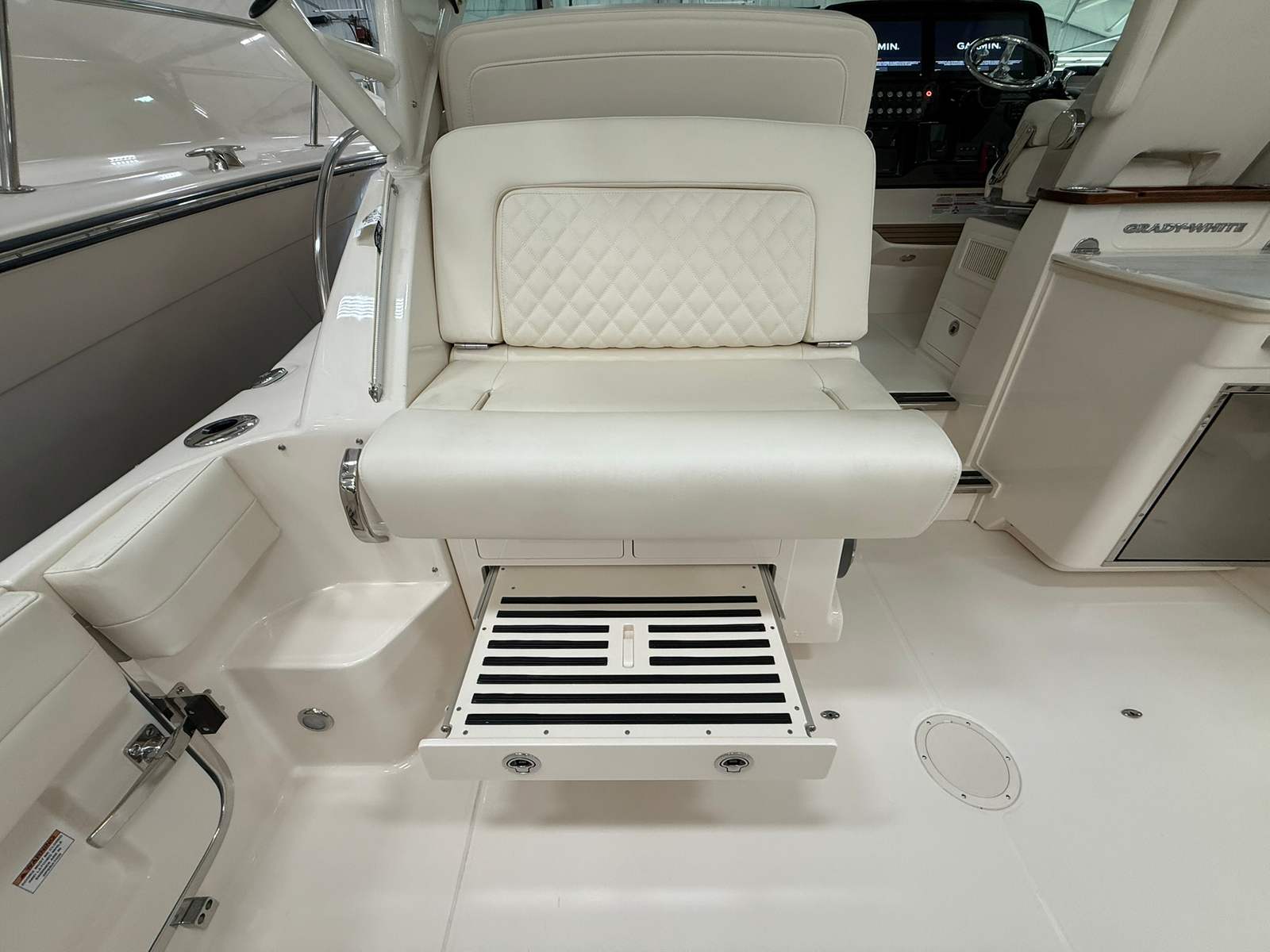 The Grady-White Express 340 is as practical as it is luxurious. Its 33.5-foot length strikes the perfect balance between spaciousness and maneuverability, making docking and storage straightforward and stress-free. The efficient triple Yamaha F350XSB engines are engineered for reliability and ease of maintenance, ensuring that you spend more time enjoying the water and less time worrying about upkeep. The Seakeeper 3 HD stabilization system not only enhances comfort but also contributes to safety, providing a stable platform for all your activities. The cockpit refrigerator is ideal for storing drinks and snacks, making it easy to entertain guests or keep your family fueled for a day of fun. The custom Loose Style Line Tape and Ocean Mist Blue gel coat ensure your boat stands out, while also protecting its exterior for years to come.