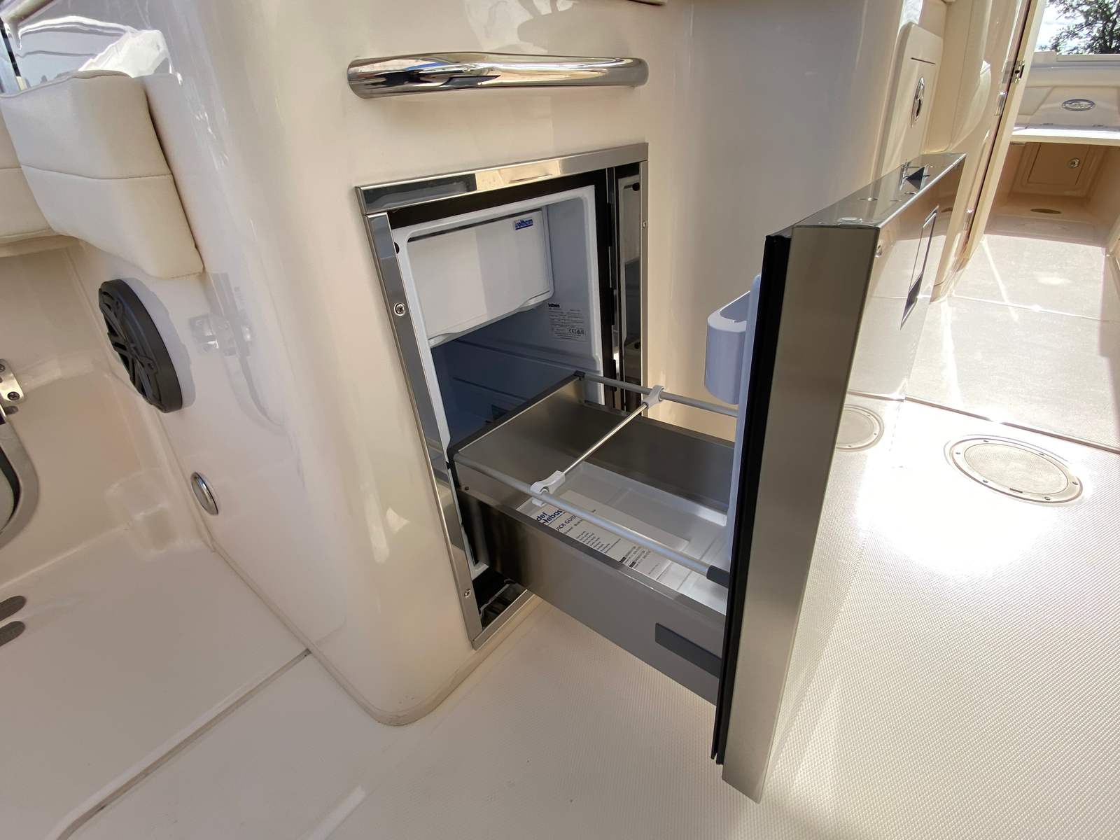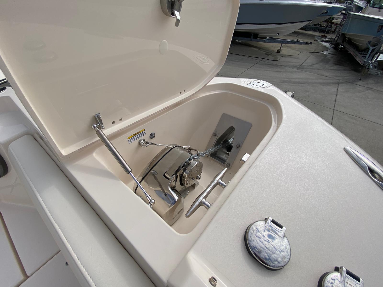 The 2026 Grady-White Freedom 285 is loaded with premium features designed to enhance your boating experience. The install silver logos add a touch of sophistication, while the side bar with Corian countertop and integrated sink provides a convenient space for preparing snacks and drinks. The sun platform insert with cushion creates a comfortable lounging area, perfect for soaking up the sun or relaxing with a good book. The refrigerator in the bar ensures your refreshments stay cool and easily accessible throughout the day.For those who love to entertain or enjoy evening cruises, the three underwater lights create a captivating ambiance, illuminating the water and adding a touch of elegance to your outings. The electric Sure Shade top in Oyster offers adjustable shade at the touch of a button, providing relief from the sun when you need it most. The ivory bow shade extends your comfort options, allowing you to create a cool, shaded retreat at the front of the boat.