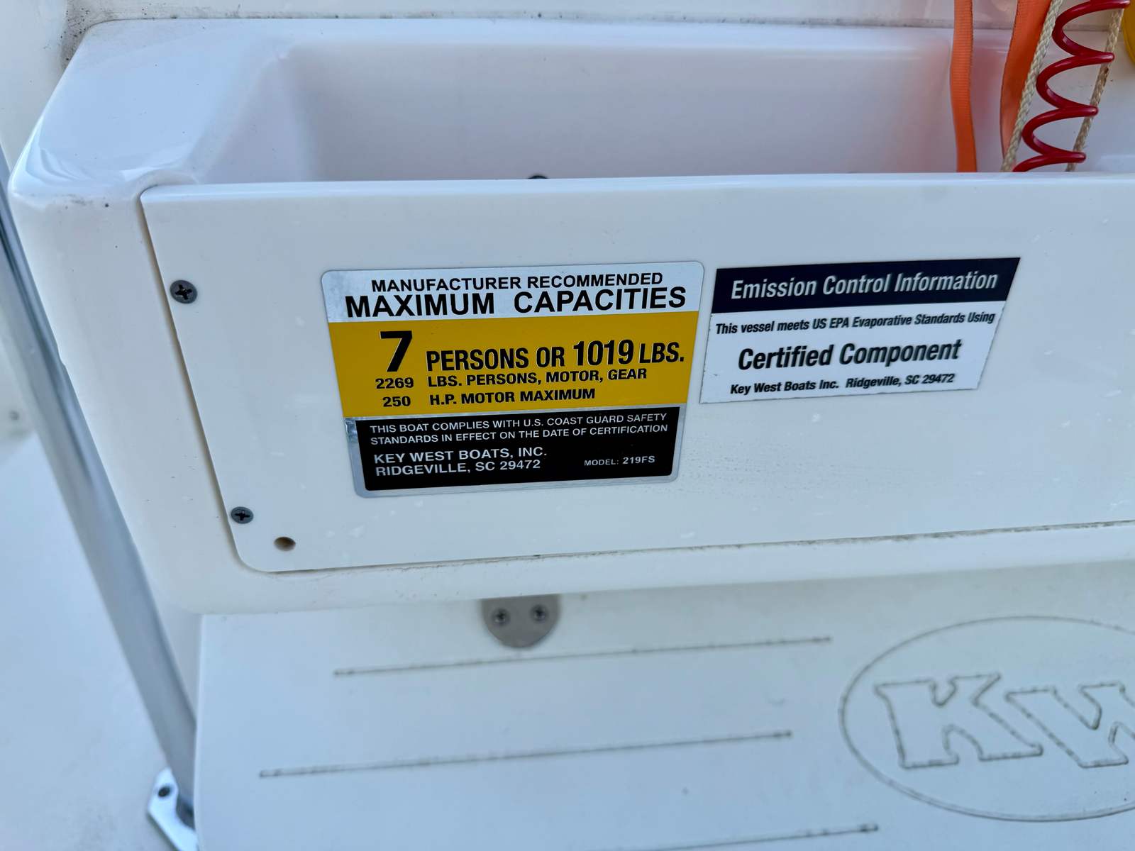 Powering the Key West 219 FS is a robust 200-horsepower engine, delivering impressive acceleration and smooth cruising capabilities. Whether you are navigating coastal waters, exploring inland lakes, or heading offshore for a day of fishing, this Center Console boat offers the performance you need for a variety of adventures. The engine’s low hours ensure dependable operation and plenty of life ahead, making this Key West boat for sale a smart investment for those who value both power and longevity. The 200-horsepower setup strikes the perfect balance between fuel efficiency and exhilarating speed, allowing you to enjoy extended outings without compromise.