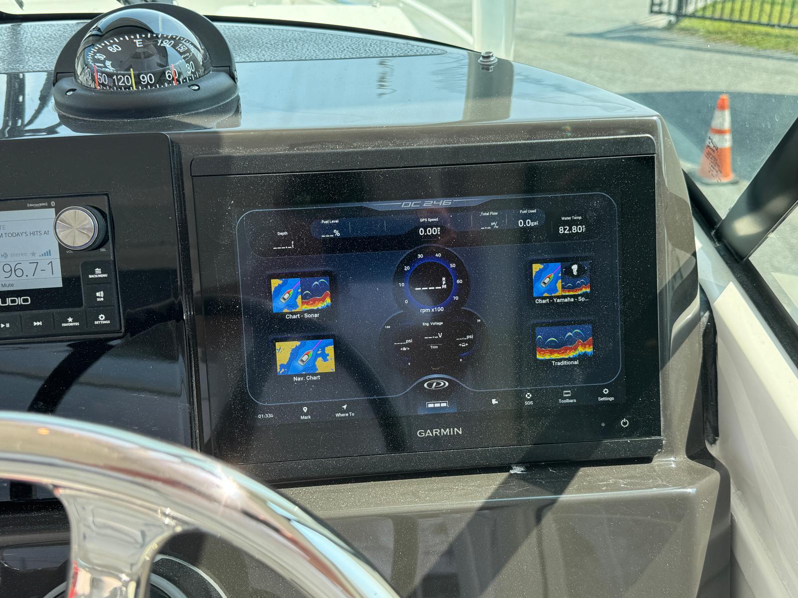 - Garmin Electronics Package (GPSMAP 8612XSV, B75M 0-7 Degree 600 watt CHIRP Transducer, NMEA 2000 Starter kit, Pursuit Custom Dash Panel, VHF Radio) (requires stereo option)