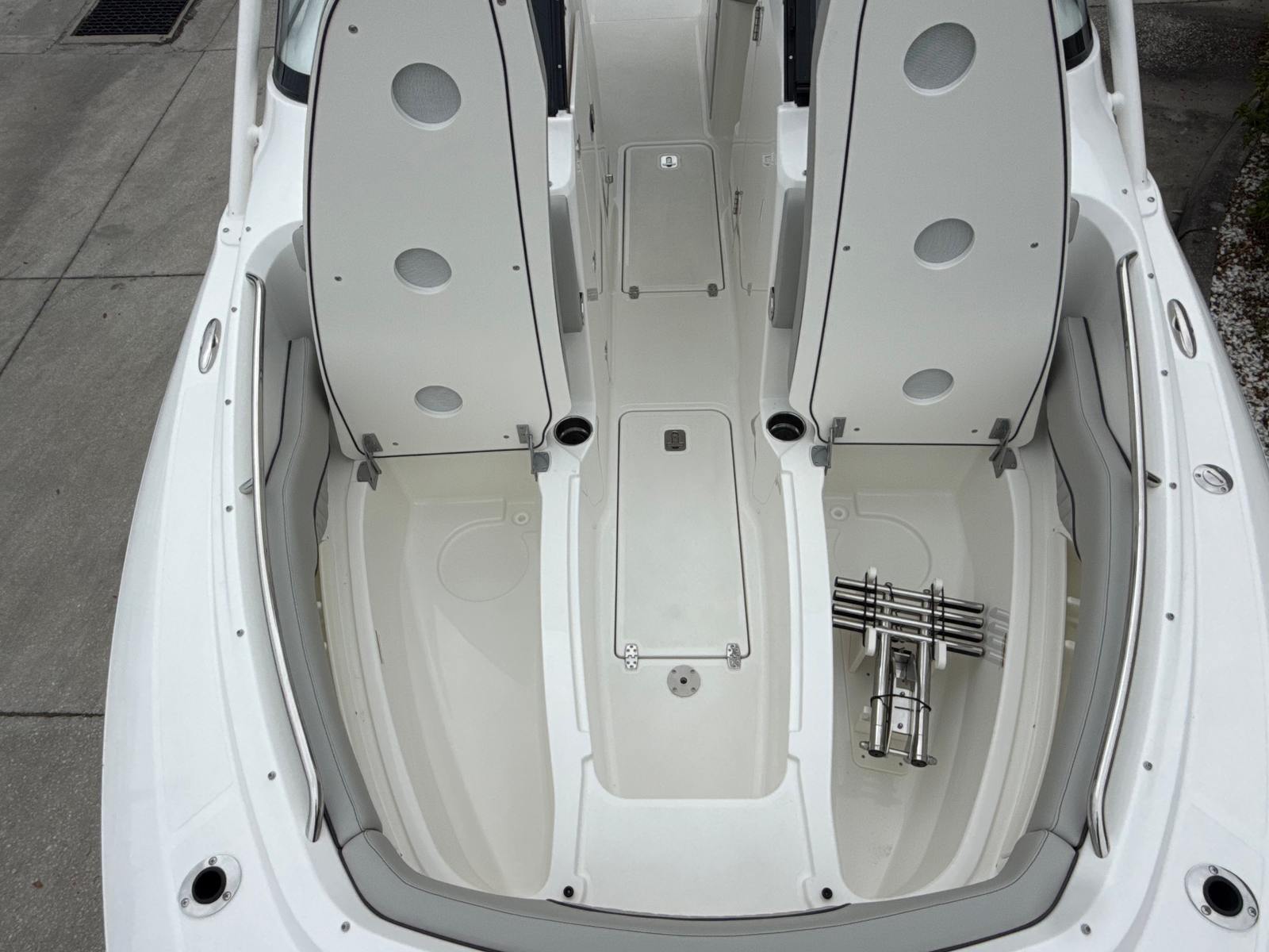 Beyond its impressive style and performance, the Pursuit DC 286 is designed with practical boating needs in mind. The 30-foot length strikes an ideal balance between spaciousness and maneuverability, making it easy to handle in a variety of settings. The Yamaha Joystick Control system simplifies docking, allowing even less experienced boaters to approach slips and docks with confidence.The dedicated storage solutions, such as the bow sun pad filler cushion compartment, help keep the deck organized and clutter-free. The stainless steel refrigerator/freezer is perfect for storing drinks and snacks, ensuring you are always prepared for a day on the water. The 30 Amp dockside power with ELCI protection provides peace of mind, knowing your electrical systems are safeguarded and reliable.