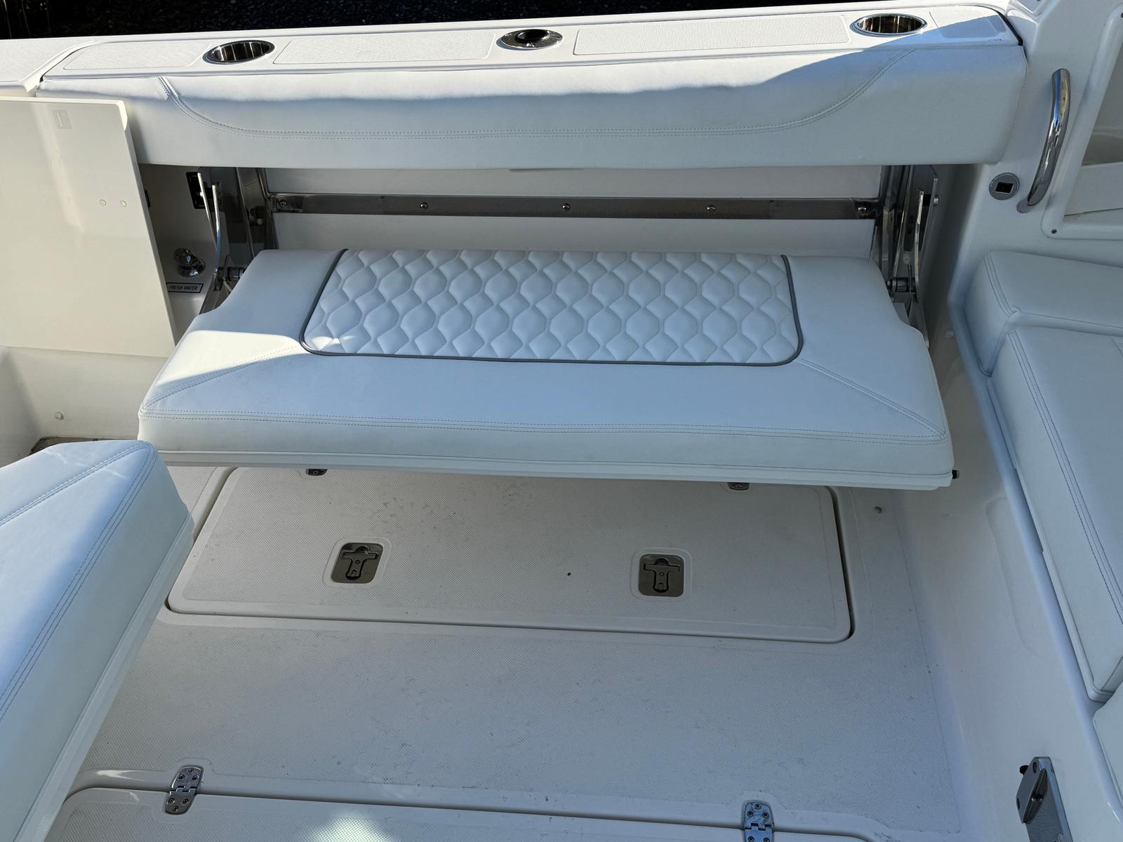 Performance: Powering the Pursuit 326 DC are two robust engines, delivering a combined 700 horsepower. This impressive setup provides exhilarating acceleration, smooth cruising, and reliable handling in a variety of conditions. Whether you’re navigating coastal waters or exploring inland lakes, the Pursuit 326 DC’s performance capabilities ensure a responsive and enjoyable ride. The dual engine configuration also enhances maneuverability and safety, giving you confidence during docking, anchoring, and high-speed runs. With this level of power, you can effortlessly reach your favorite destinations and enjoy water sports, fishing, or leisurely cruises with ease.