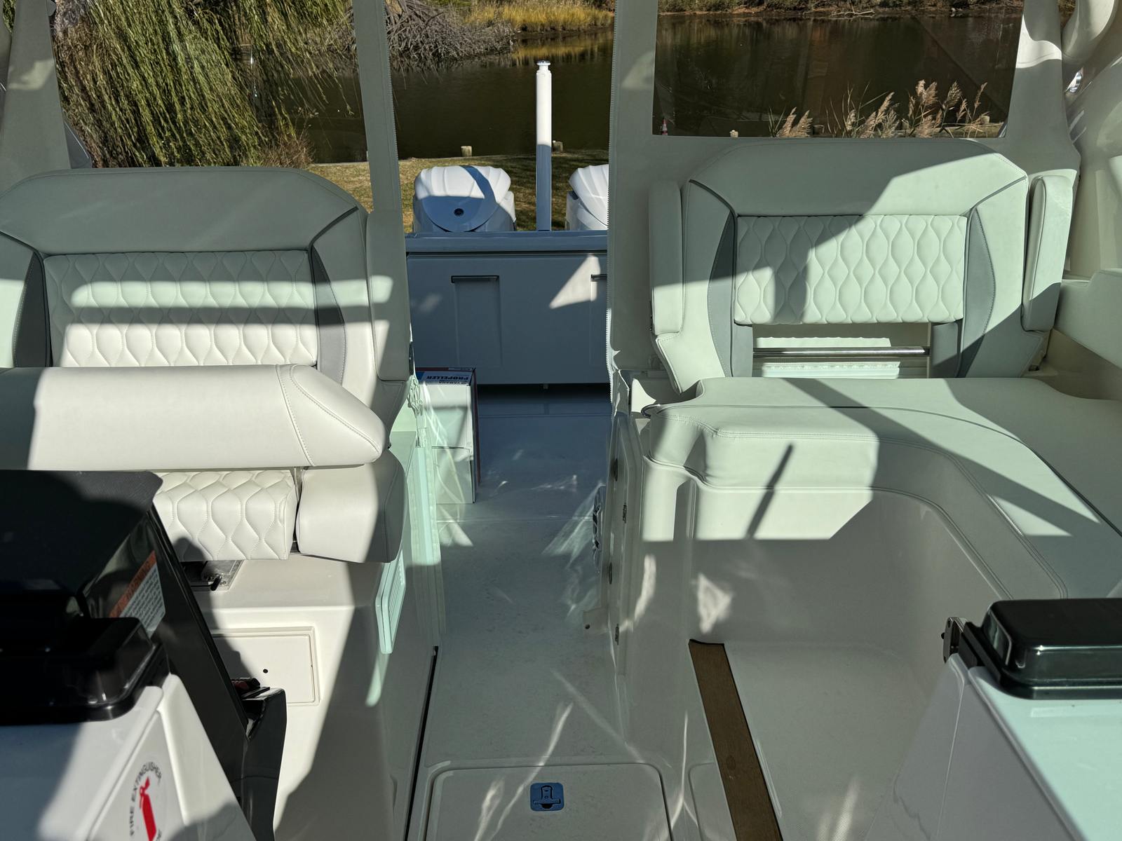 - Twin Yamaha Digital F350 V6 Offshore (Pearlescent White) w/Integrated Digital Electric Steering (DES) and Helm Master EX Digital Electronic Control (DEC) (does not include joystick control), Multifunction Display Interface and Manual Engine Flushing System