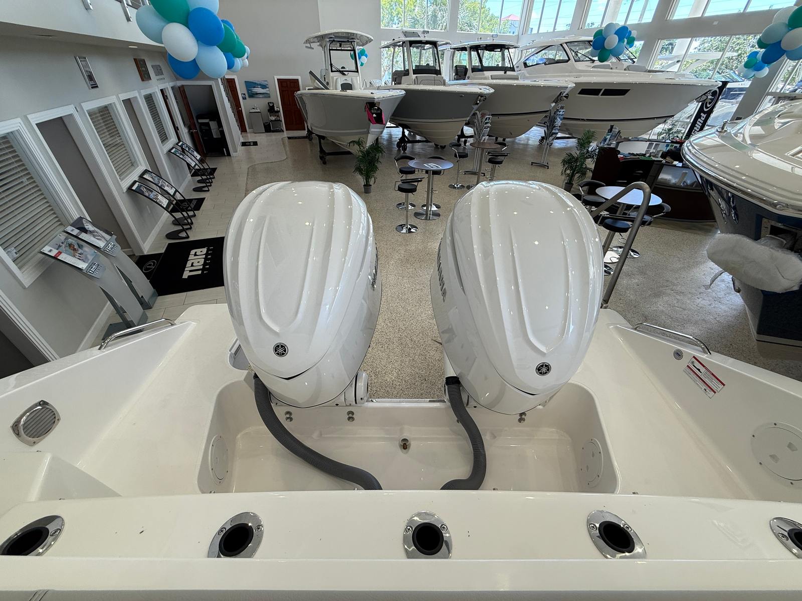 The Pursuit DC 326 is loaded with special features designed to enhance your boating experience. The twin Yamaha F350XSA2 engines provide robust performance, while the joystick control ensures effortless navigation and docking. The hull’s fresh white color, complemented by a black boot stripe with black accent, creates a timeless and elegant appearance. Inside, the helm and footrest feature a sleek carbon color, and the interior is finished in Tranquil Sea, offering a serene and inviting atmosphere.For added convenience and comfort, the DC 326 is equipped with a 110V/60HZ 5.0KW genset, providing reliable power for all your onboard systems. The 110V/60HZ cabin and bridgedeck air conditioning package ensures a cool and comfortable environment, even on the hottest days. Entertaining is a breeze with the 110V cockpit grill, perfect for preparing delicious meals while enjoying the water. The helm control hardtop-mounted LED spotlight enhances visibility and safety during nighttime excursions, giving you peace of mind wherever your adventures take you.