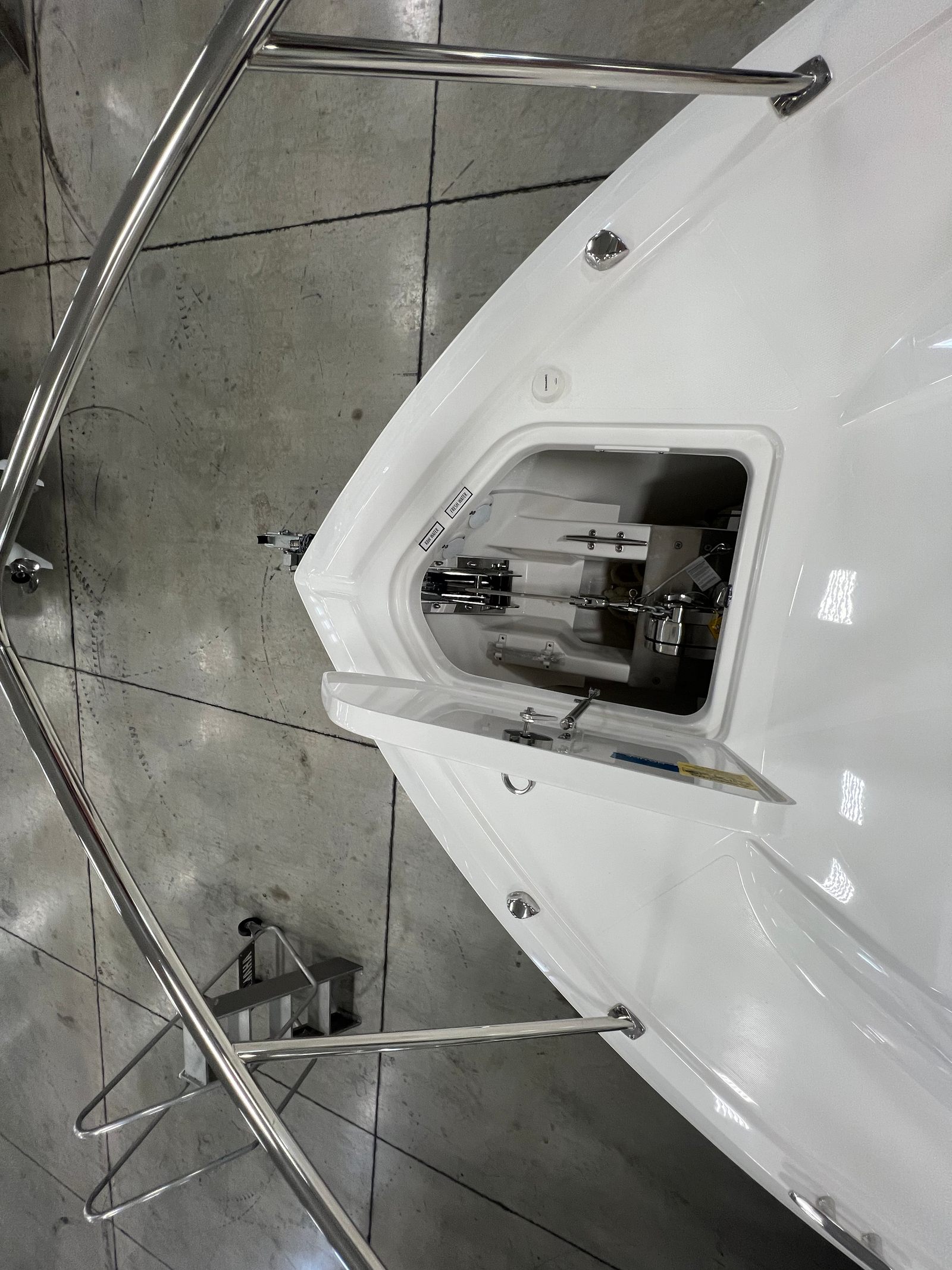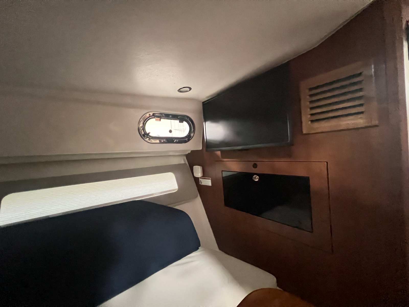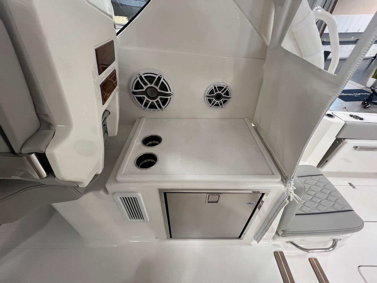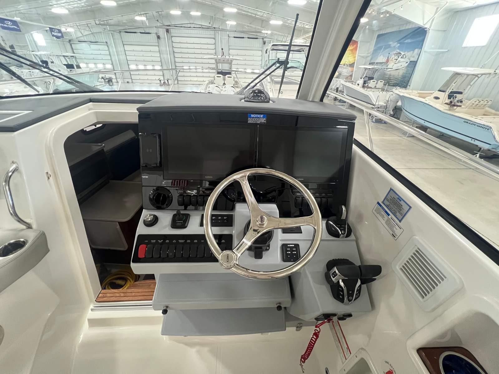 The Pursuit 325 OS is loaded with premium features designed to enhance your time on the water. For those who appreciate comfort in any climate, the cabin air conditioning with reverse cycle (10,000 BTU) and cockpit air conditioning with reverse cycle (12,000 BTU) ensure a pleasant environment, whether you are relaxing inside or entertaining guests on deck. The custom hardtop integrated electric retractable Makefast sunshade, operated with a simple one-touch mechanism, provides instant relief from the sun, allowing you to enjoy the outdoors in comfort.Aesthetically, the 325 OS is a showstopper with its black boot stripe and aft curtain, adding a touch of sophistication to its exterior. The three-piece drop curtain upgrade in white Stamoid material offers additional protection and style, ensuring you are prepared for changing weather conditions. The addition of the GMS 10 Expander for Garmin options enhances your navigation and electronics capabilities, making every journey safer and more enjoyable.Onboard, the bridgedeck teak table and fiberglass cockpit table, both with dedicated storage, offer versatile spaces for dining, socializing, or simply unwinding with a view. The folding gunwale seat on the starboard side maximizes seating options while maintaining a clean, uncluttered deck layout. These thoughtful touches make the Pursuit 325 OS a standout among cruiser boats for sale, offering both practicality and luxury.