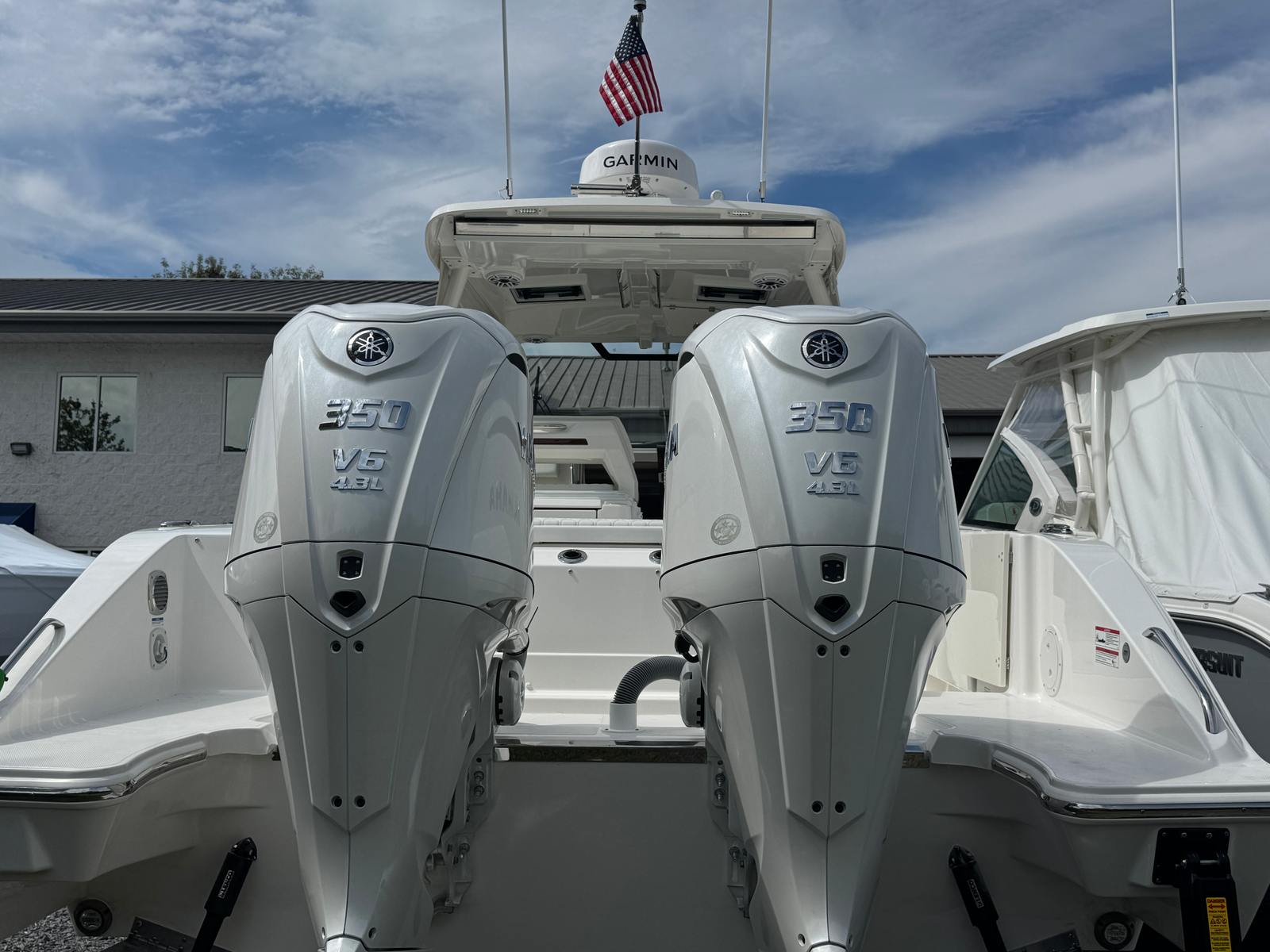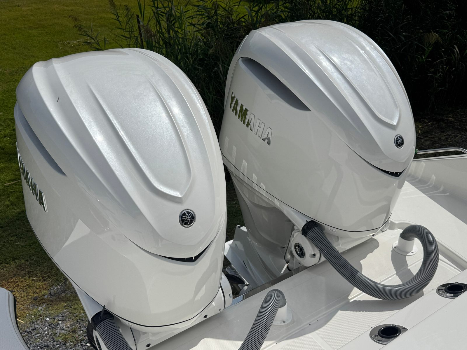 - Twin Yamaha® Digital F350 V6 Offshore (Pearlescent White) w/Integrated Digital Electric Steering (DES) and Helm Master® EX Digital Electronic Control (DEC) (does not include joystick control), Multifunction Display Interface and Manual Engine Flushing System