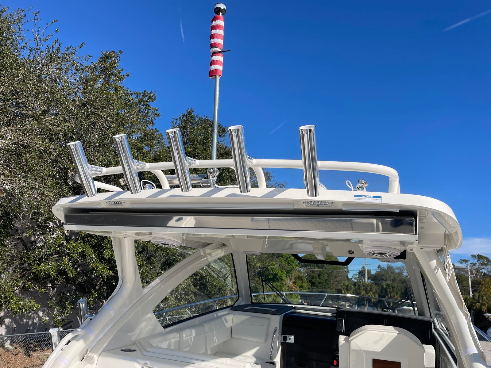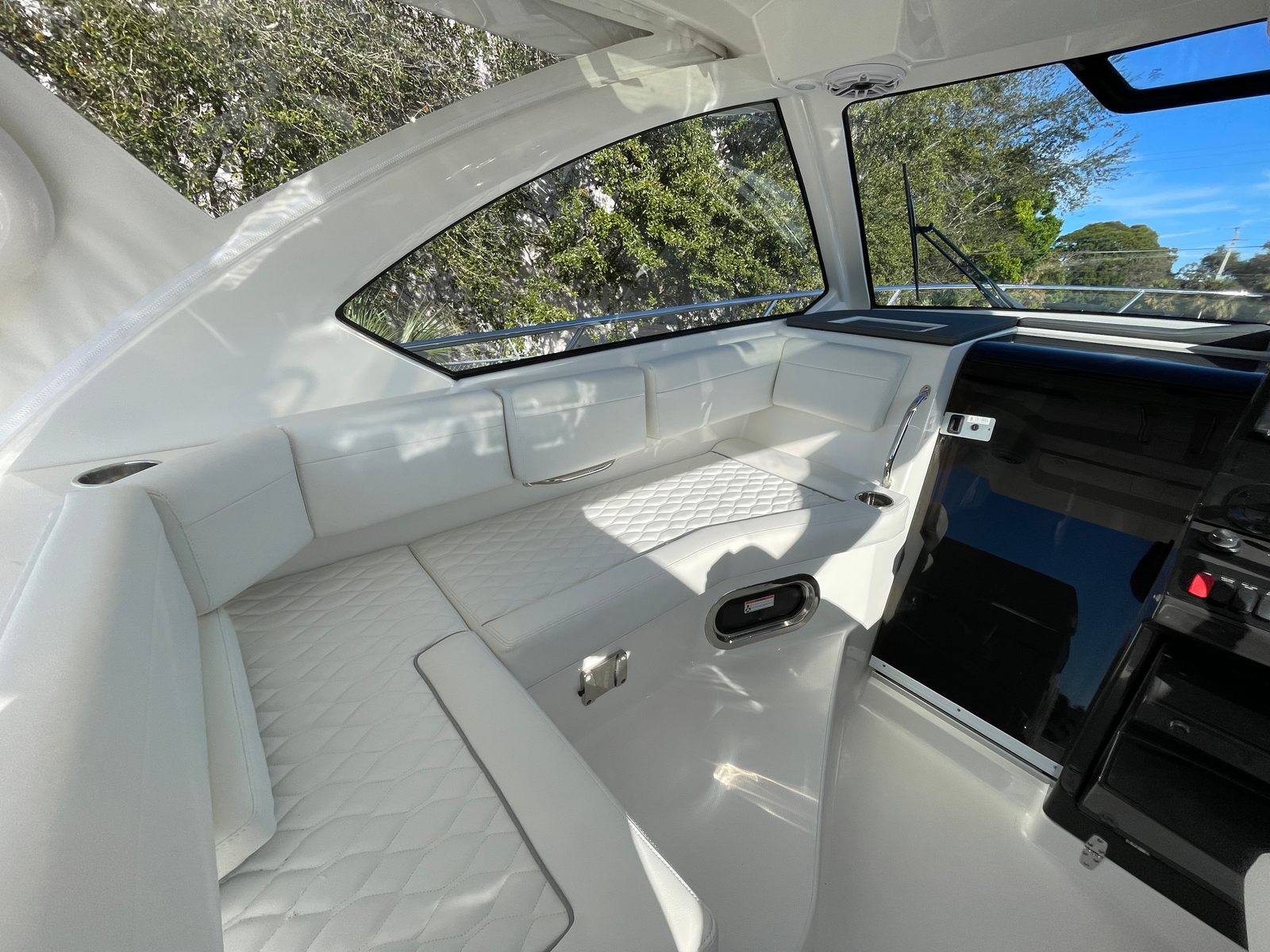 The Pursuit OS 325 is loaded with premium features that set it apart from other cruiser boats for sale. The SeaKeeper Ride 600 stabilizer enhances onboard comfort by minimizing roll, ensuring a smooth and steady experience even in choppy conditions. The helm and footrest, finished in a sophisticated carbon color, provide a modern touch and ergonomic support for long days at the wheel. Inside, the tranquil seas interior fabric and upgraded white upholstery create a serene and inviting atmosphere, perfect for relaxing after a day on the water.For those who value comfort and convenience, the OS 325 is equipped with a generator and a 16-gallon diesel tank, ensuring reliable power for extended trips. The cabin air conditioning with reverse cycle 110v/60Hz keeps the interior climate-controlled, offering respite from the summer heat or chilly evenings. Every detail, from the hull’s fresh white finish to the navy bootstripe, reflects Pursuit’s commitment to quality and style.