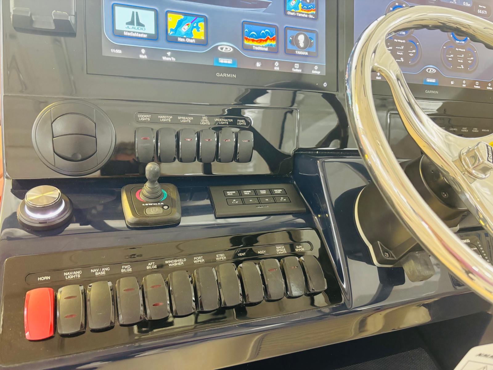 Power and precision are at the heart of the Pursuit OS 325. Equipped with twin Yamaha Digital F350 V6 Offshore engines in a stunning Pearlescent White finish, this cruiser delivers a combined 700 horsepower for exhilarating acceleration and smooth cruising. The integrated Digital Electric Steering (DES) ensures responsive handling, while the Helm Master EX Digital Electronic Control (DEC) system provides seamless throttle and shift operations. The advanced Yamaha Joystick Control, featuring full maneuverability with Set Point and Autopilot functions, offers effortless docking and precise navigation, making every journey as enjoyable as the destination. The Multifunction Display Interface keeps you informed and in control, enhancing your confidence on the water.
