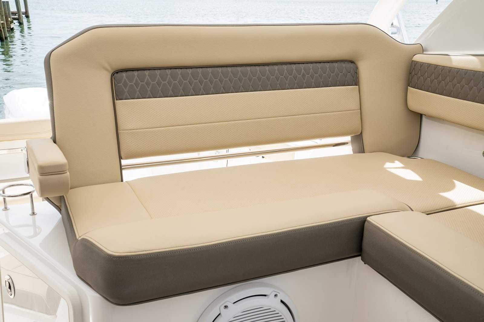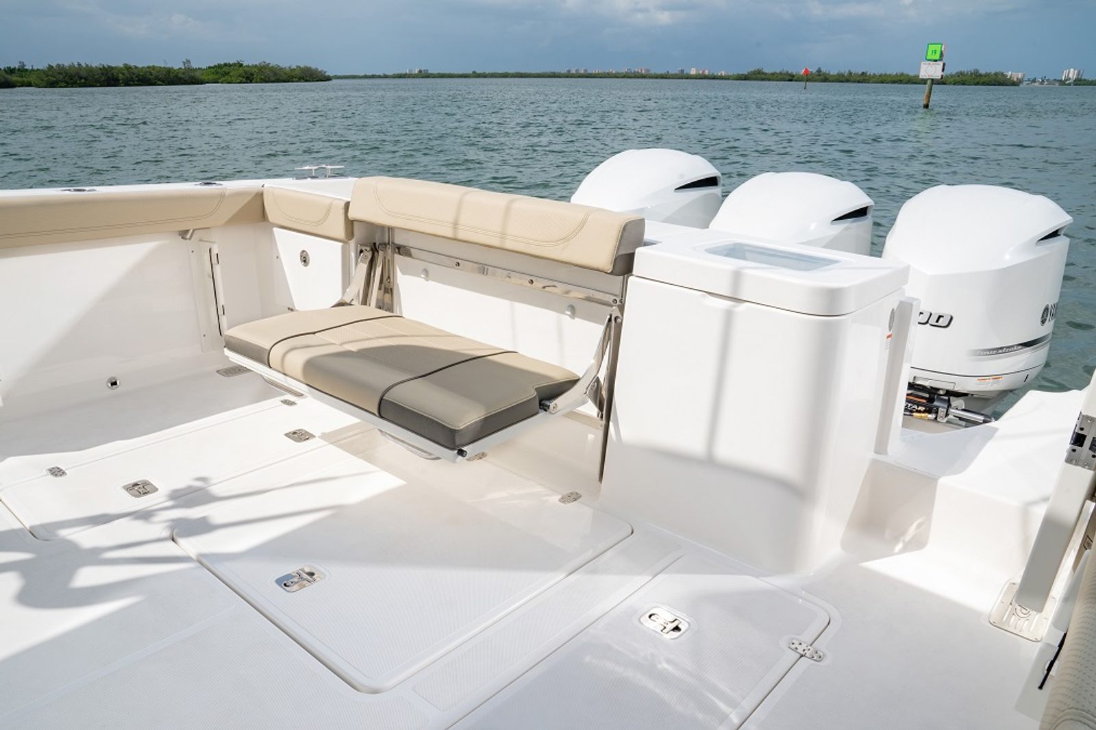 The Pursuit OS 355 is as practical as it is luxurious. The triple engine setup provides ample power for a variety of activities, from leisurely cruises to offshore adventures. The ergonomic helm and advanced spotlight system make navigation and docking easier, even in challenging conditions. The folding gunwale seat offers flexible seating options, allowing you to customize the cockpit layout to suit your needs.Storage is thoughtfully integrated throughout the boat, making it easy to stow gear, water toys, and personal items for longer trips. The forward deck sunpad is perfect for sunbathing or relaxing with a good book, while the spacious cockpit accommodates everything from fishing gear to picnic supplies. With its combination of power, comfort, and versatility, the OS 355 is designed to make every outing enjoyable and stress-free.