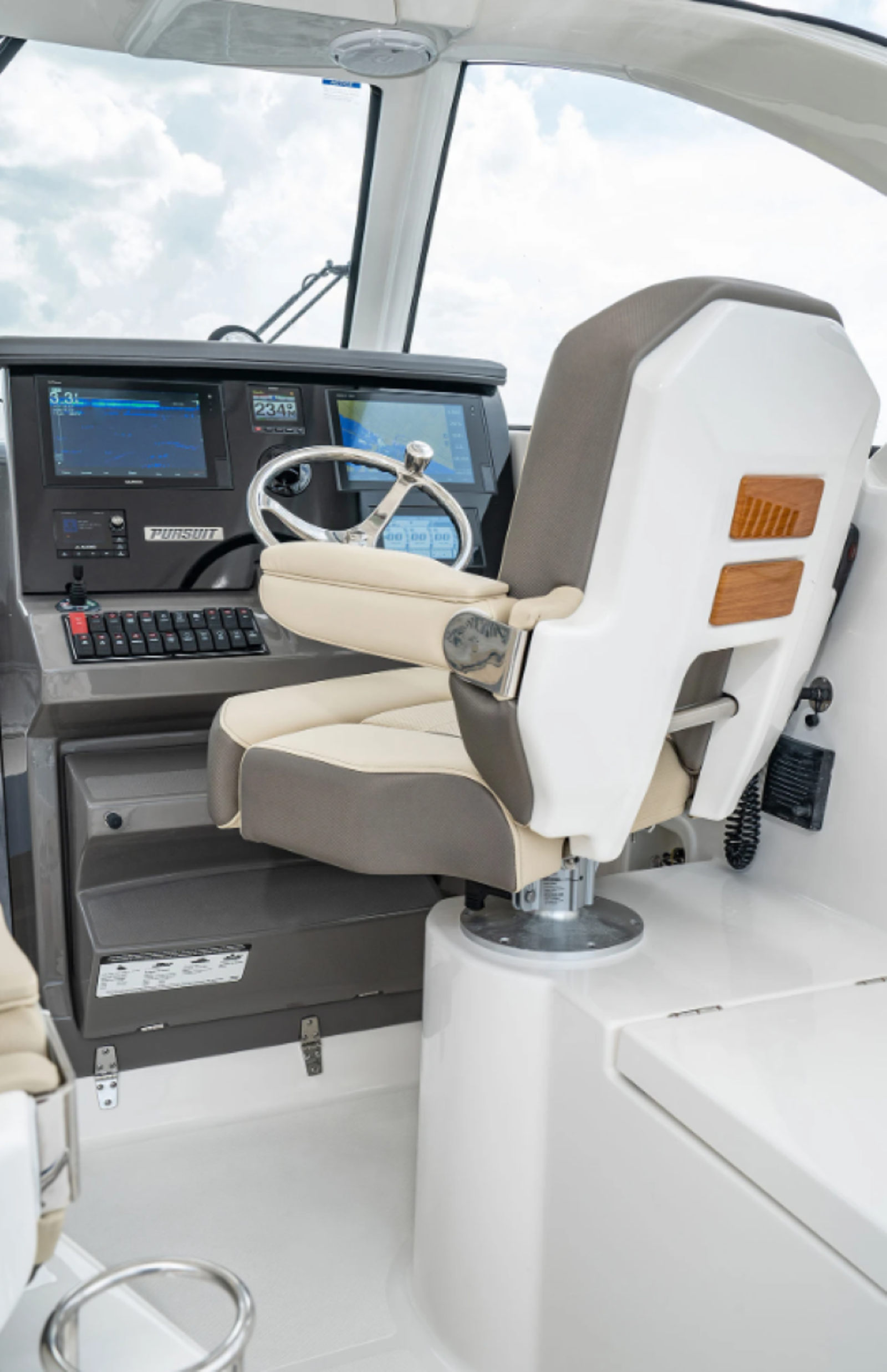Practicality meets luxury in the Pursuit OS 355. The efficient triple Yamaha engines not only deliver impressive power but also contribute to smooth docking and maneuvering, making this cruiser easy to handle in a variety of conditions. The ample storage ensures that all your gear, from fishing equipment to picnic supplies, is organized and within reach.The dedicated storage for both the bridgedeck teak table and the fiberglass cockpit table means you can quickly set up or stow away your entertaining spaces, maximizing usability and keeping the deck clear. The folding gunwale seat is perfect for accommodating extra guests or providing a comfortable spot to relax while underway.The integrated cockpit air conditioning and heating system allows you to extend your boating season, enjoying the water in comfort from early spring through late fall. The custom hardtop sunshade not only adds a touch of luxury but also protects you and your guests from the elements, ensuring that every outing is as enjoyable as possible.