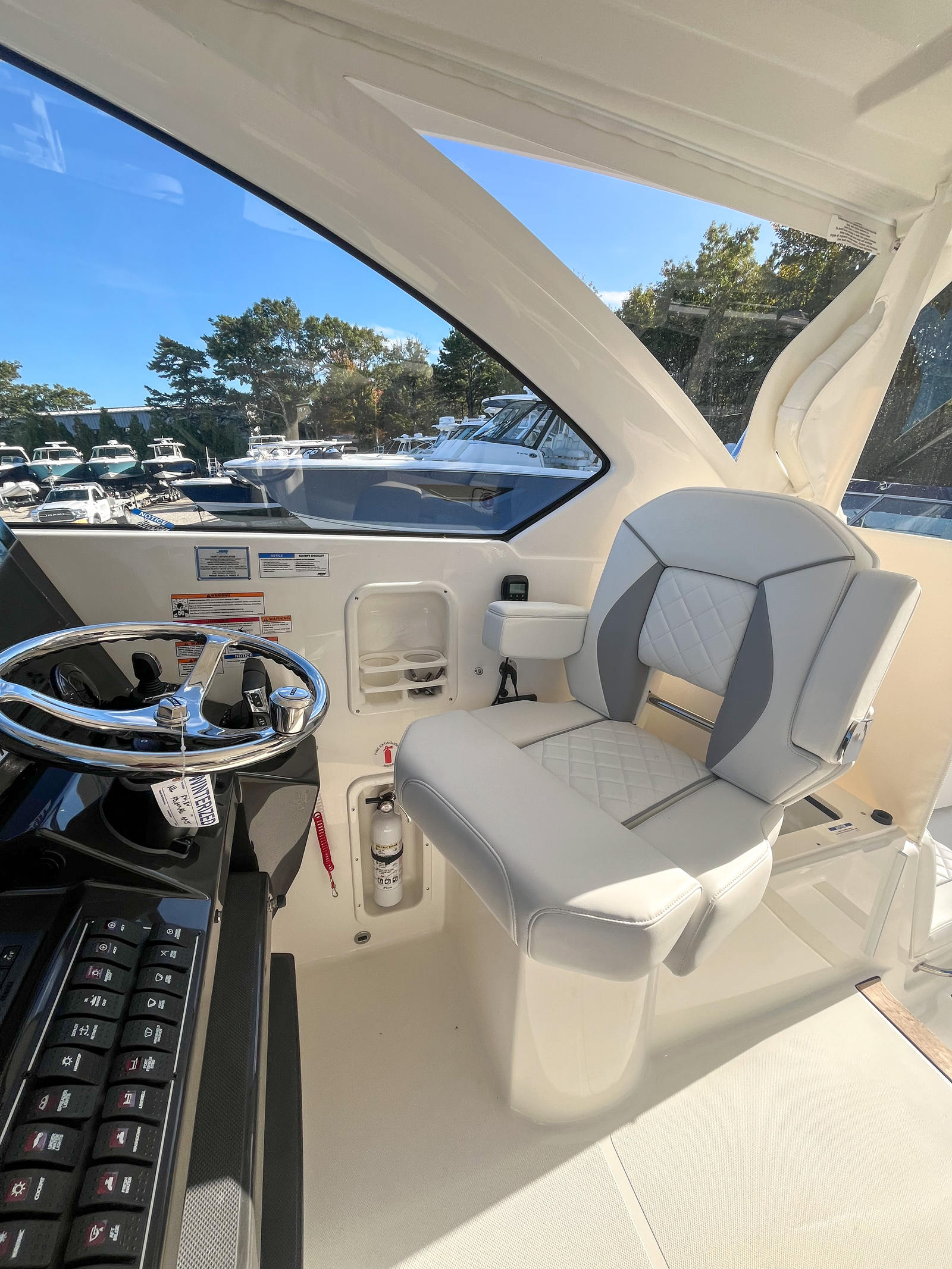 Power and precision come standard on the Pursuit OS 355. Equipped with three high-performance engines delivering a combined 1,050 horsepower, this cruiser boat for sale is built to impress. The triple-engine setup ensures smooth acceleration, responsive handling, and the ability to tackle a variety of water conditions with ease. Whether you’re cruising along the coastline or heading out for offshore adventures, the Pursuit OS 355 offers exhilarating speed and reliable performance. The advanced helm, featuring a carbon finish, puts you in complete control, allowing for effortless navigation and maneuverability.