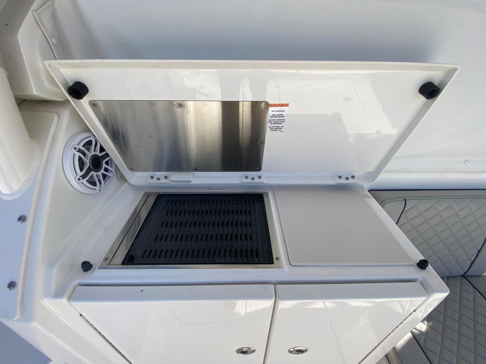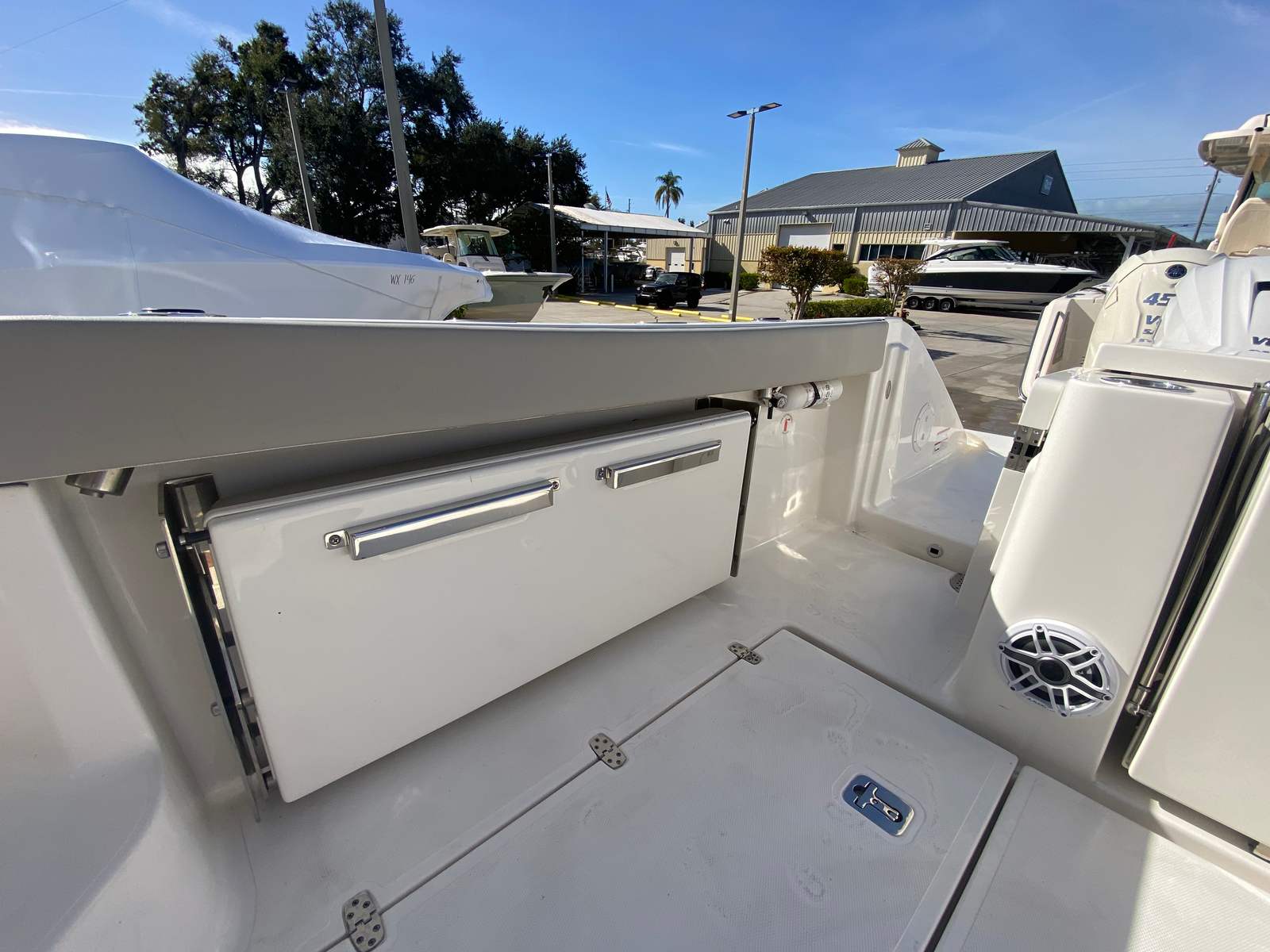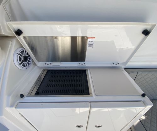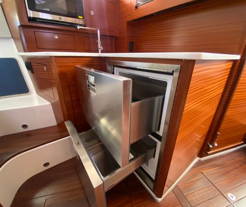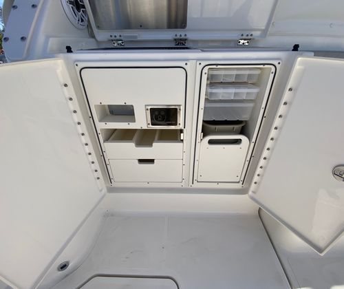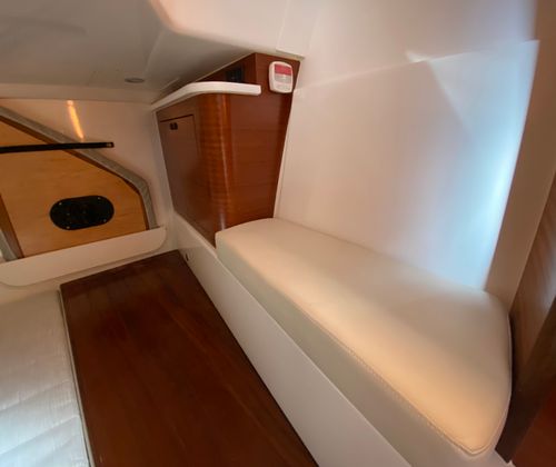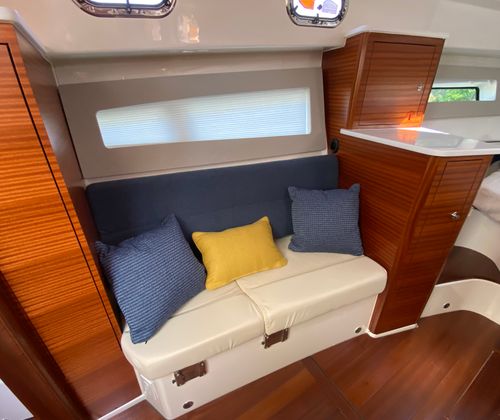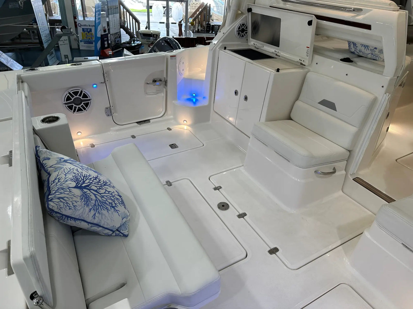 Practicality meets elegance in the Pursuit OS 405. The thoughtfully designed cockpit and helm area make docking and maneuvering straightforward, even in busy marinas or tight spaces. The advanced Garmin electronics suite simplifies navigation and enhances safety, while the aft-facing camera provides added visibility when backing into slips or monitoring activity on the swim platform.Storage is abundant throughout the vessel, allowing you to bring along all the gear, supplies, and personal items you need for extended trips. The efficient triple-engine configuration not only delivers impressive speed but also optimizes fuel consumption, making longer journeys more economical. The retractable cockpit sunshade and protective side curtains ensure you can make the most of your time on the water, regardless of the weather.