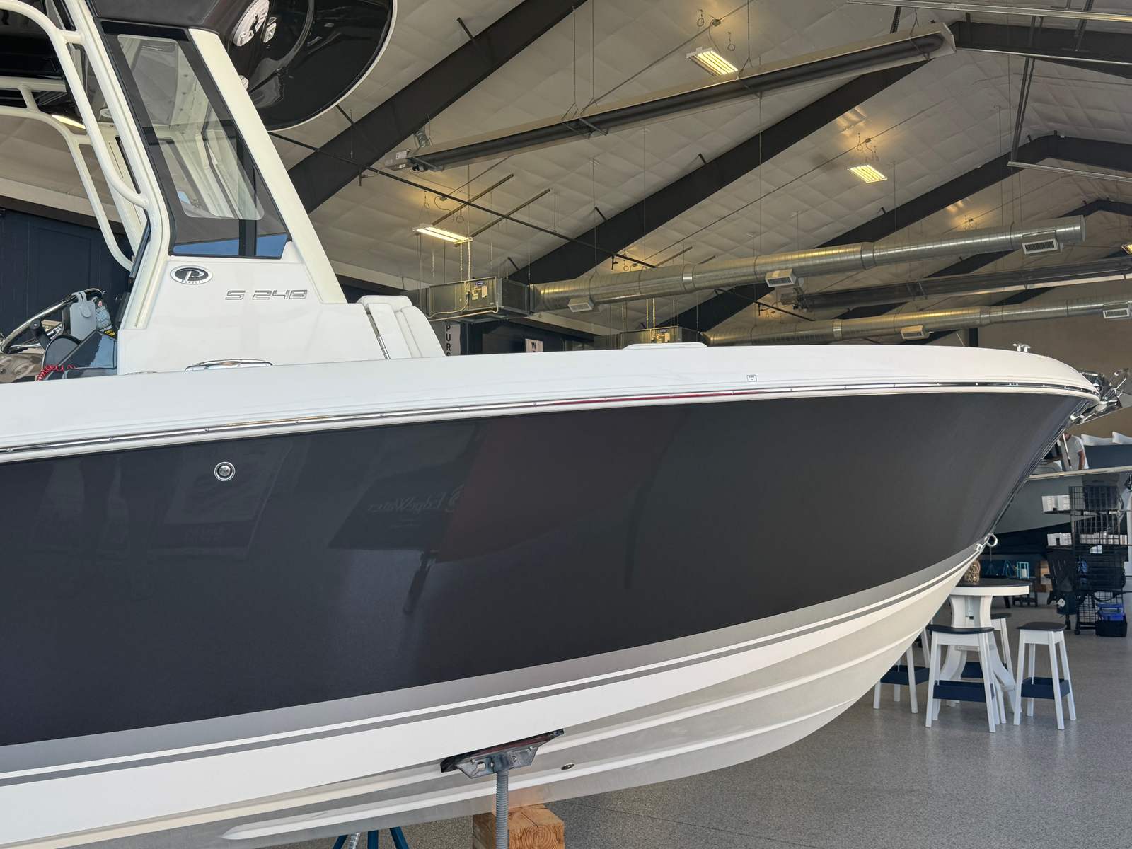 The Pursuit S 248 is loaded with premium features designed to enhance your time on the water. The hull, helm, and hardtop liner are finished in a sophisticated Carbon color, complemented by a Platinum bootstripe for a modern, upscale look. The upgraded white and gray upholstery not only adds a touch of elegance but also provides superior comfort for you and your guests.For those who value convenience and ease of use, the windlass anchor system with remote allows for effortless anchoring, while the electric freshwater head with a 6-gallon holding tank (requires the Fresh Water System option) adds a level of comfort and privacy rarely found in boats of this size. When the sun sets, the Pursuit S 248 transforms into a dazzling spectacle with three all-color Sea Blaze Quattro Spectrum underwater lights and four mid-level cockpit accent lights in LED blue, creating an inviting and vibrant atmosphere for evening cruises or dockside gatherings.