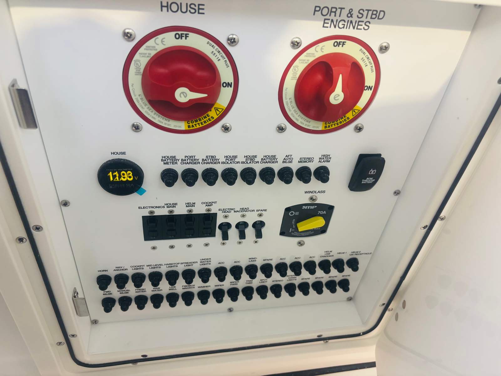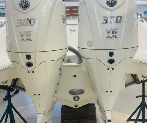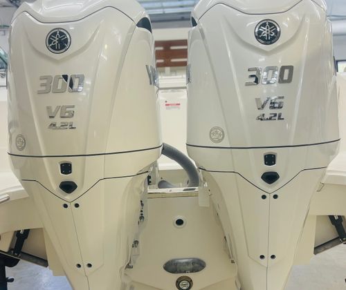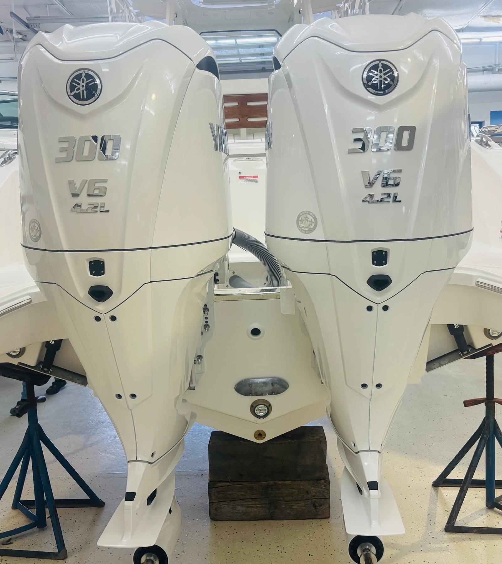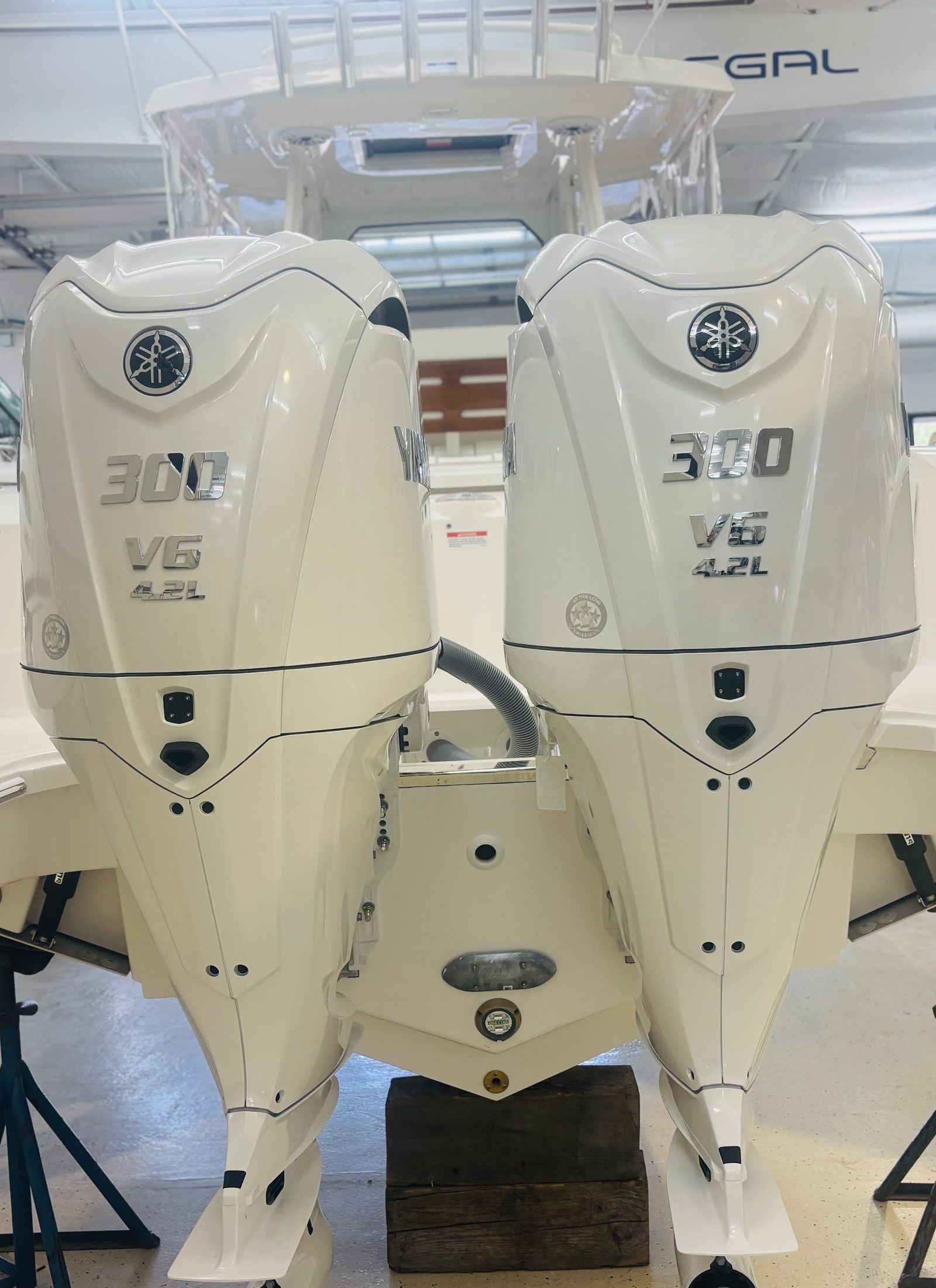 - Twin Yamaha® Digital F300 V6 Offshore (Pearlescent White) w/Integrated Digital Electric Steering (DES) and Helm Master® EX Digital Electronic Control (DEC) (does not include joystick control), Multifunction Display Interface and Manual Engine Flushing System