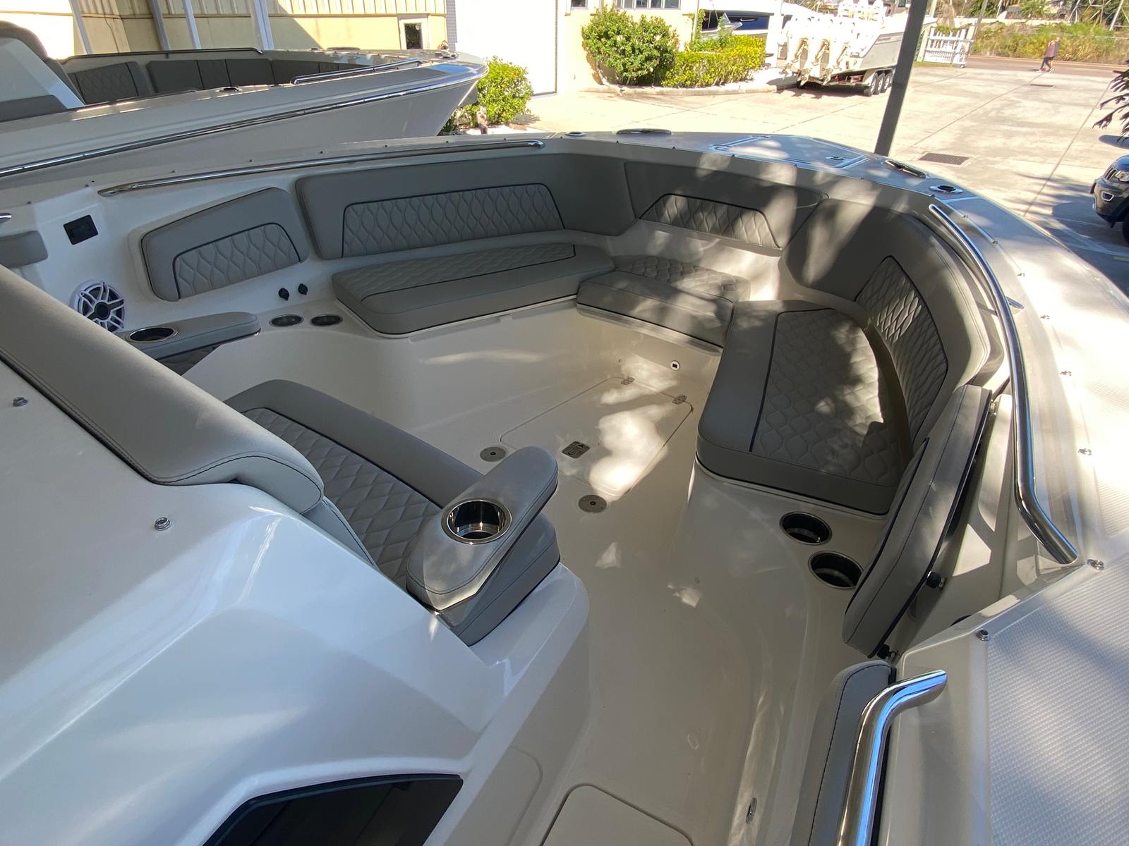 The 2026 Pursuit S 328 Center Console is a remarkable vessel that measures an impressive 34.5 feet in length, offering ample space for passengers and gear. As a new boat, it boasts pristine condition and the latest advancements in marine technology. Pursuit’s reputation for quality craftsmanship is evident in every detail, from the sleek hull color in Fresh White to the elegant Bootstripe in Platinum. The helm features sophisticated Carbon colors, while the interior fabric in Tranquil Sea creates a serene and inviting atmosphere. This Center Console boat for sale is engineered to provide both style and substance, making it a standout choice for discerning buyers.