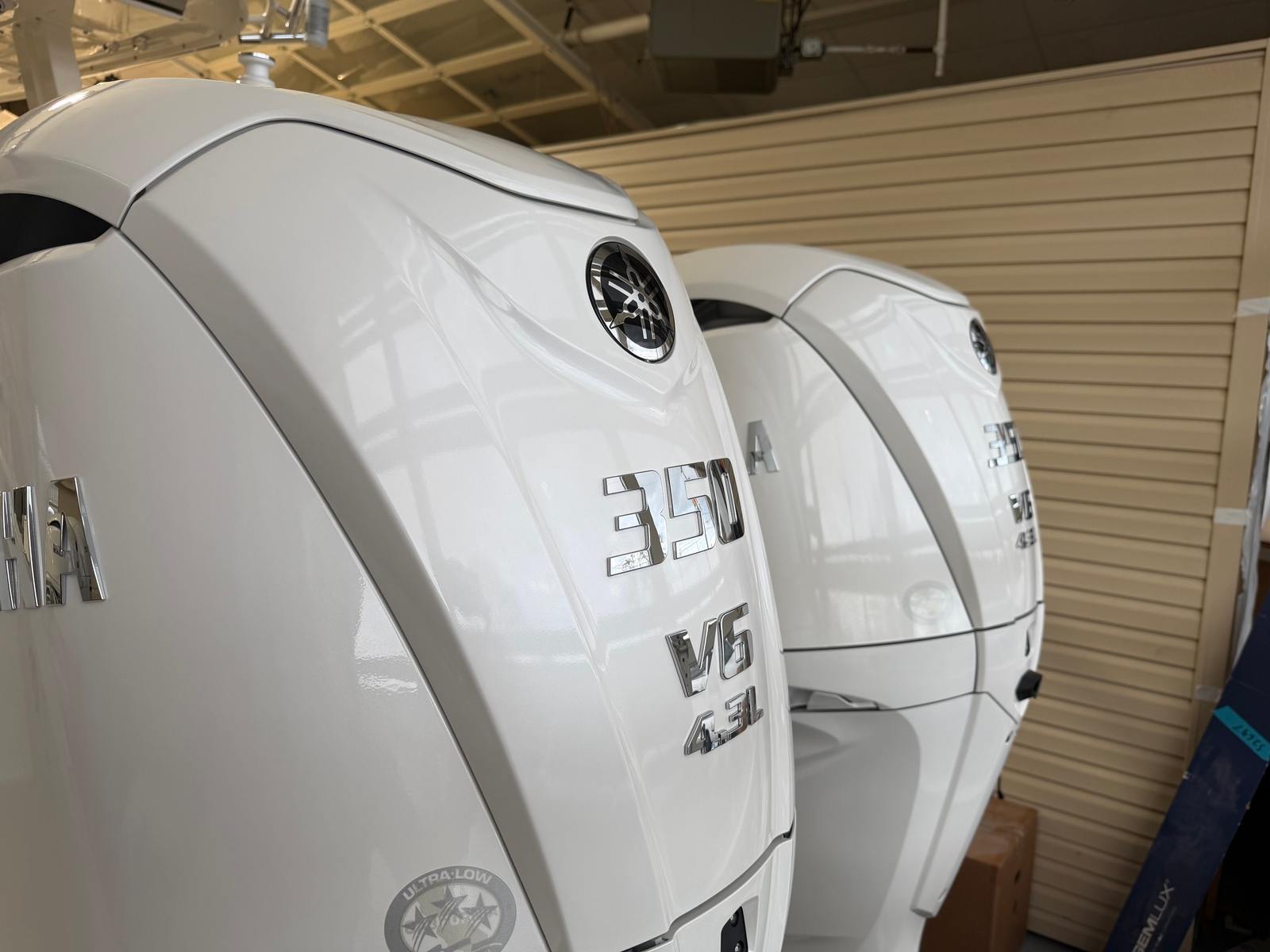 - Twin Yamaha Digital F350 V6 Offshore (Pearlescent White) w/Integrated Digital Electric Steering (DES) and Helm Master EX Digital Electronic Control (DEC) (does not include joystick control), Multifunction Display Interface and Manual Engine Flushing System