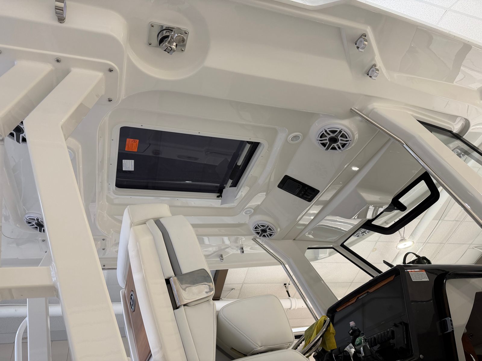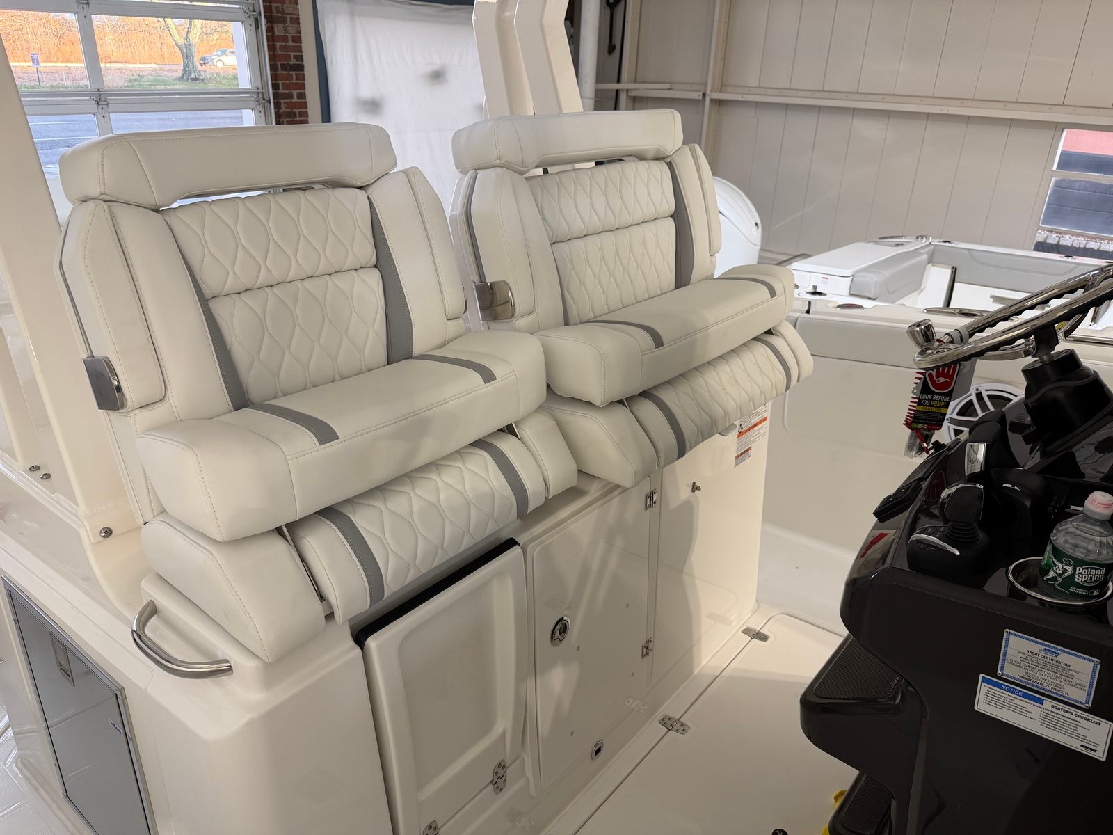 The Pursuit S 328 center console boat for sale is loaded with premium features designed to enhance your time on the water. The Multifunction Display Interface provides intuitive access to navigation, engine data, and entertainment controls, keeping you informed and in command at all times. The manual engine flushing system simplifies maintenance, helping you keep your investment in top condition.Anglers will appreciate the four bow rod holders, six hardtop corner-mounted rod holders, two kingfish rod holders, and Gemlux Deluxe 18’ Hybrid carbon fiber outriggers with a double rigging kit and gunwale line tensioners. These features make the S 328 a formidable fishing platform, ready for serious offshore action.For those who value comfort and convenience, the cockpit refrigerator with 12v temperature control replaces standard tackle storage, offering a perfect spot to keep drinks and snacks chilled. The custom retractable Makefast sunshade with one-touch operation provides instant relief from the sun, allowing you to create a cool, shaded oasis at the touch of a button.The SeaKeeper Ride 600 system replaces traditional trim tabs, delivering superior stability and ride comfort, even in choppy conditions. Entertainment is elevated with a premium stereo upgrade featuring M6 Sport speakers and a subwoofer with full spectrum backlighting, a custom-tuned 8-channel DSP amp, and a Sirius receiver with a three-month subscription. Whether you’re relaxing at anchor or cruising along the coast, your favorite music will sound incredible.A removable transom-mount ski tow adds versatility, making it easy to enjoy watersports with family and friends.