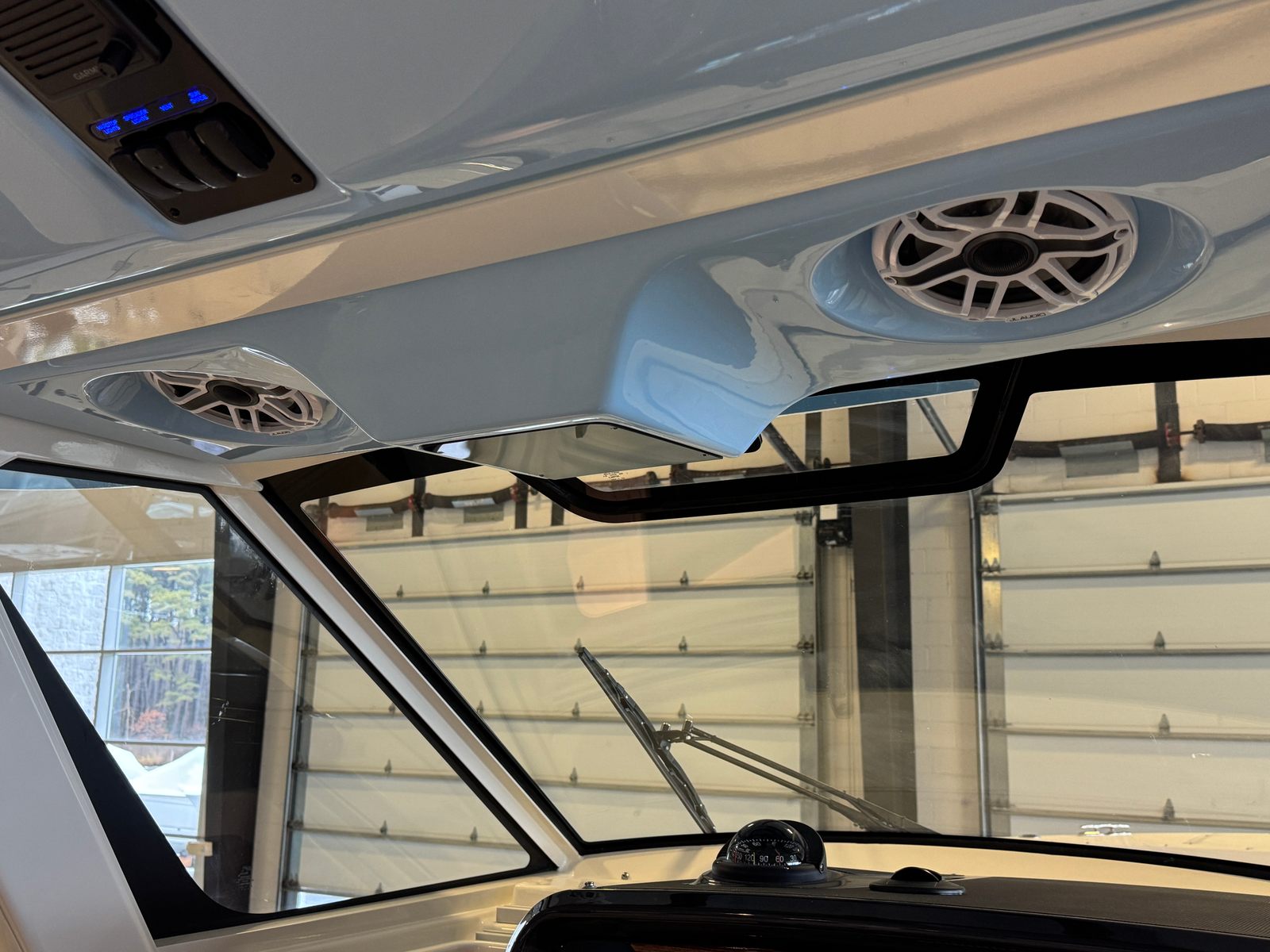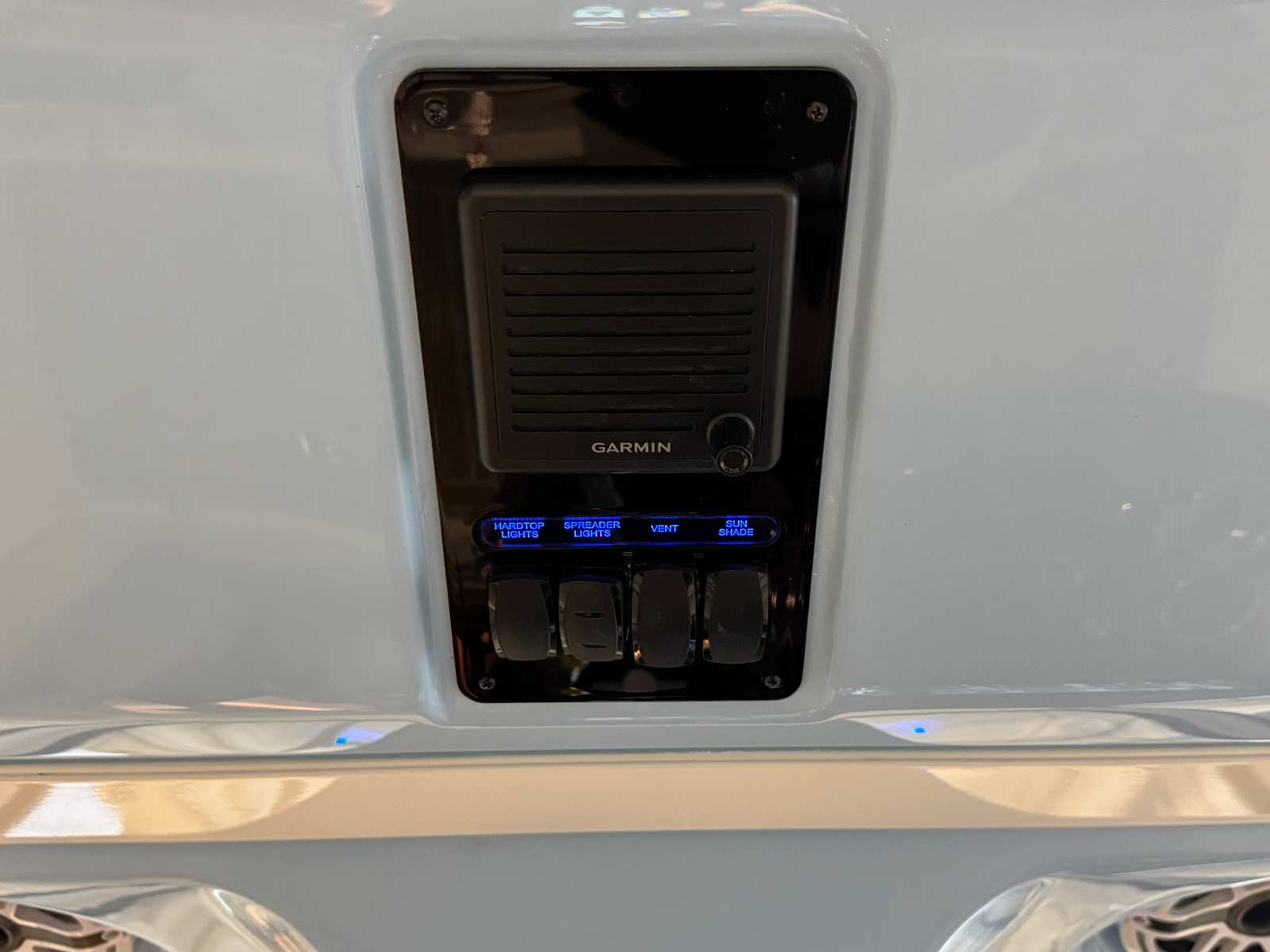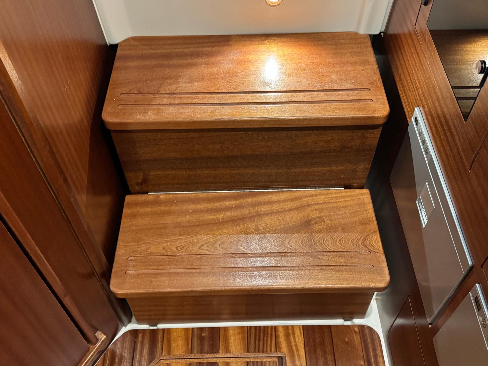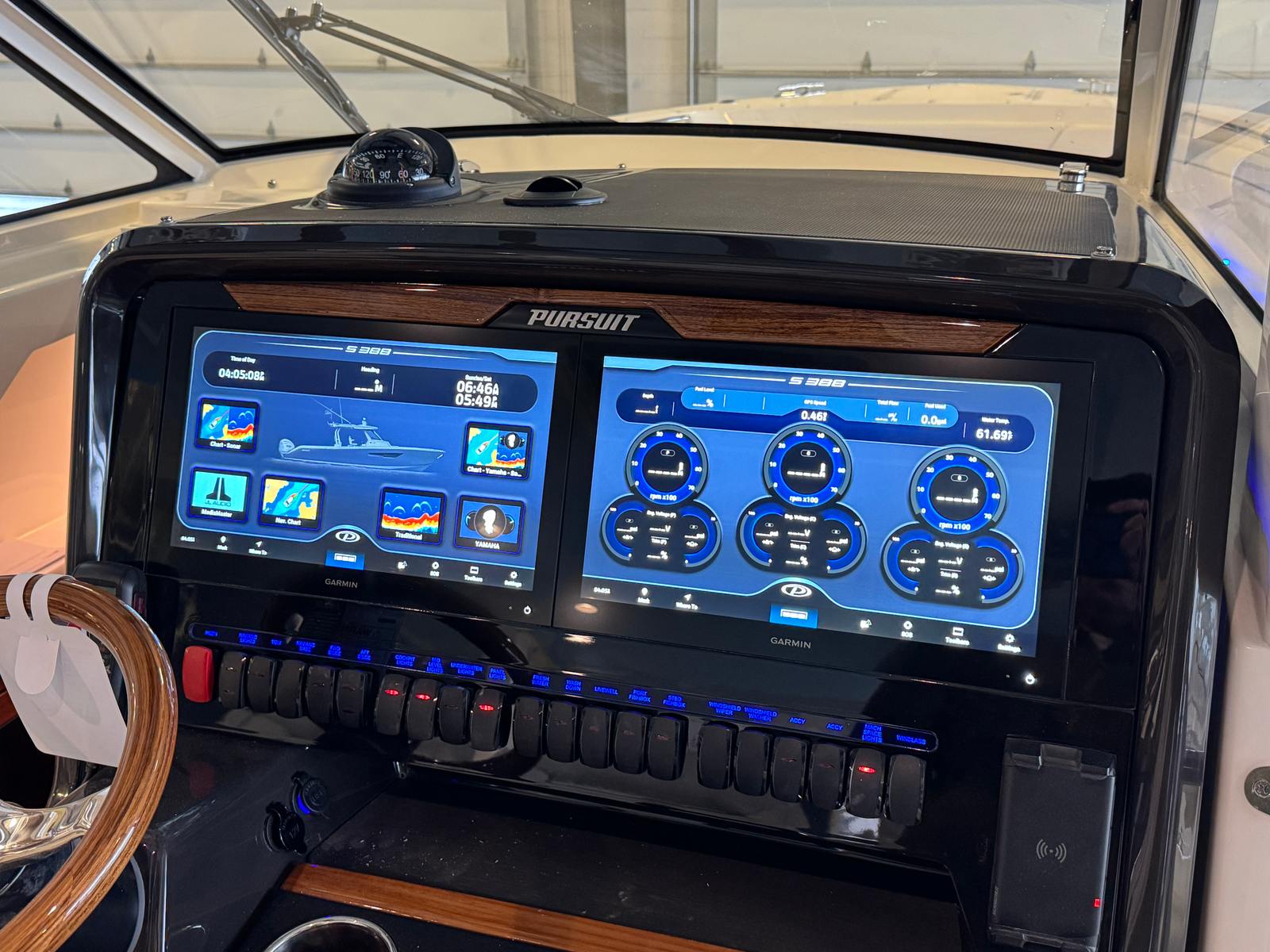 - Helm - Premium Upgrade: Edson Solid Teak Steering Wheel with Power Knob, Leather-Wrapped Dash Pad (Black), Synthetic Teak Flooring on Helm Footrest Treads and Teak Accents on Dash Storage Pockets and Entertainment Center. Select Color: (Biscuit or Smoke) (Color must match Helm and Entertainment Area Flooring if selected)