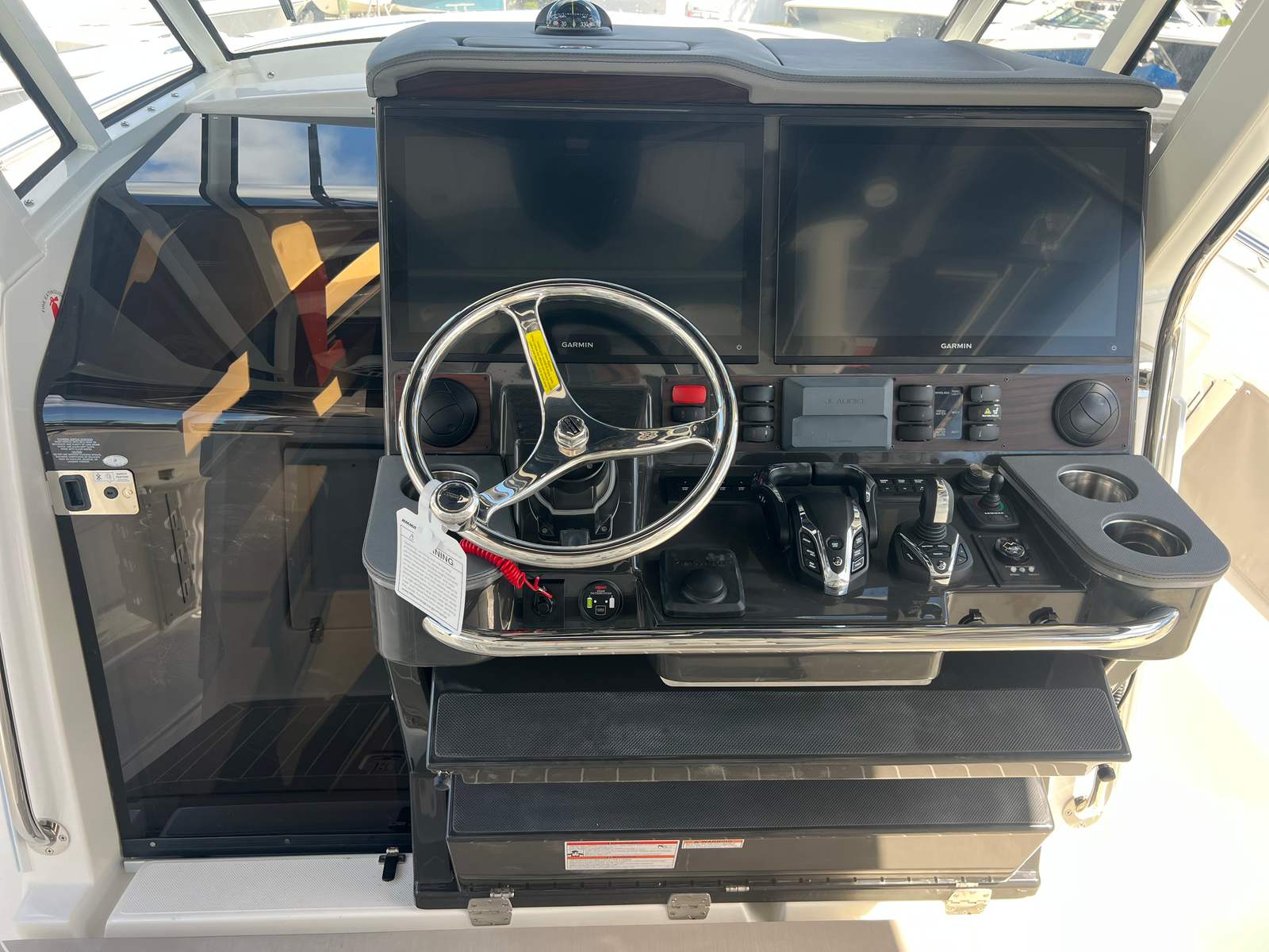 The Pursuit S 428 is loaded with premium features that elevate your boating experience to new heights. The fresh white hullside (standard) and the hardtop underside in Flag Blue create a striking visual appeal, while the custom hardtop integrates a stainless steel electric retractable Makefast sunshade with one-touch operation, offering instant relief from the sun at the touch of a button. The hardtop also features six rod holders, perfect for keeping your fishing gear organized and within reach.For serious anglers, the S 428 comes equipped with outriggers and Gemlux Deluxe 18’ Hybrid carbon fiber outrigger poles, complete with a double rigging kit, ensuring you are ready for any offshore fishing adventure. The starboard in-floor fish box refrigerator/freezer with temperature control keeps your catch fresh or your beverages chilled, adding a layer of convenience and luxury to your outings.Comfort is paramount on the S 428, with a cockpit air conditioning system (16,000 BTU) and a high-volume fan, ensuring a cool and inviting environment even on the hottest days (requires a 3-sided enclosure). The helm area is adorned with synthetic teak flooring, providing both style and durability underfoot.Entertainment is taken to the next level with the premium stereo upgrade, featuring M6 Sport speakers with full-spectrum backlighting (controlled through the MFDs, excluding speakers over the dash), and a Sirius receiver with a three-month subscription included. Whether you are hosting a party or enjoying a relaxing cruise, the sound quality and ambiance are second to none.For added safety and convenience, the S 428 is equipped with a Spot Light ACR RCL-100 LED, complete with remote control at the helm, ensuring clear visibility during nighttime navigation or when docking after sunset.