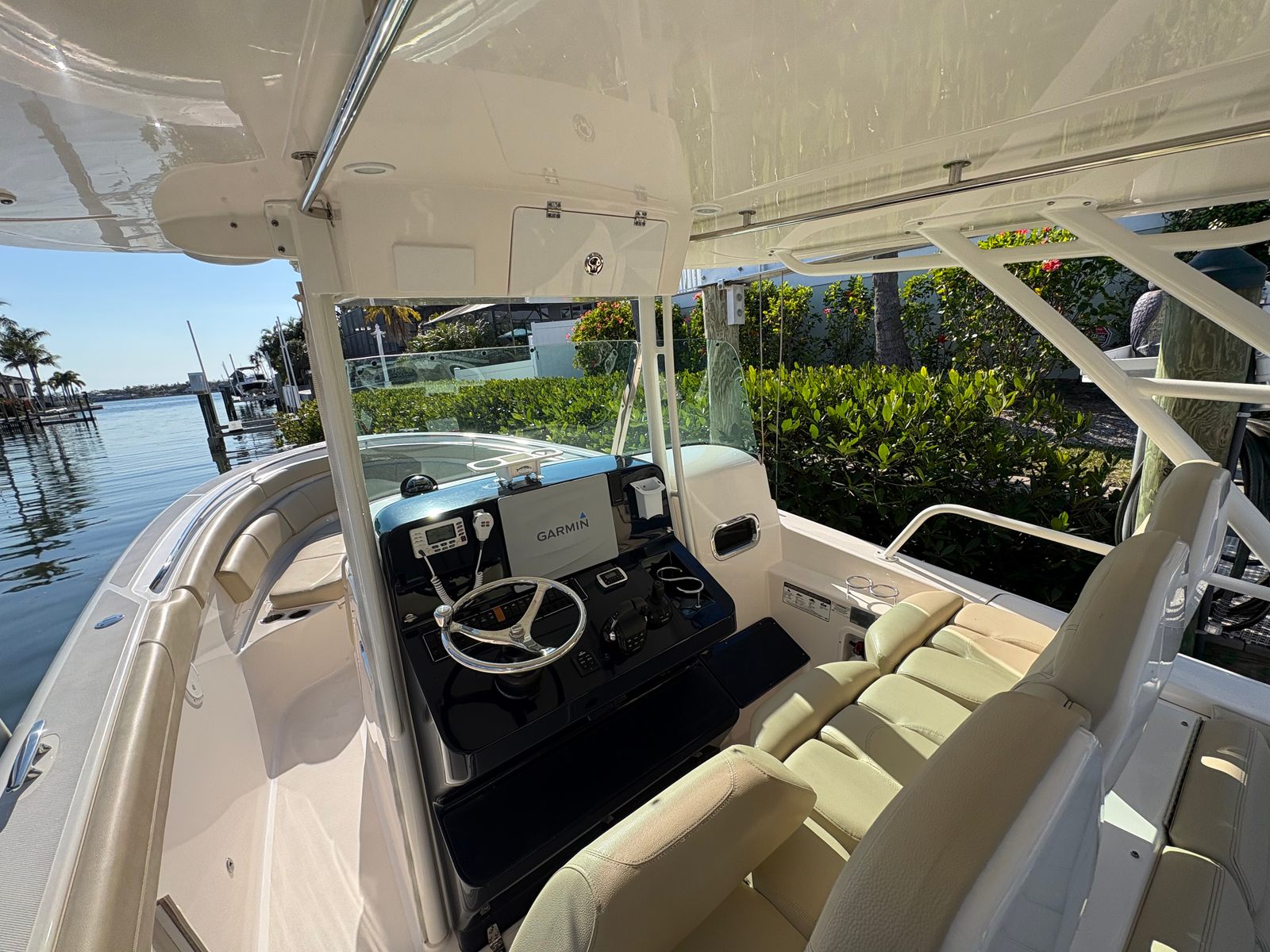 The helm is equipped with a large Garmin display, Garmin radar, and VHF radio, all protected by an optional full helm enclosure for comfort in any weather. The hardtop adds shade and features overhead rod holders for the anglers onboard.