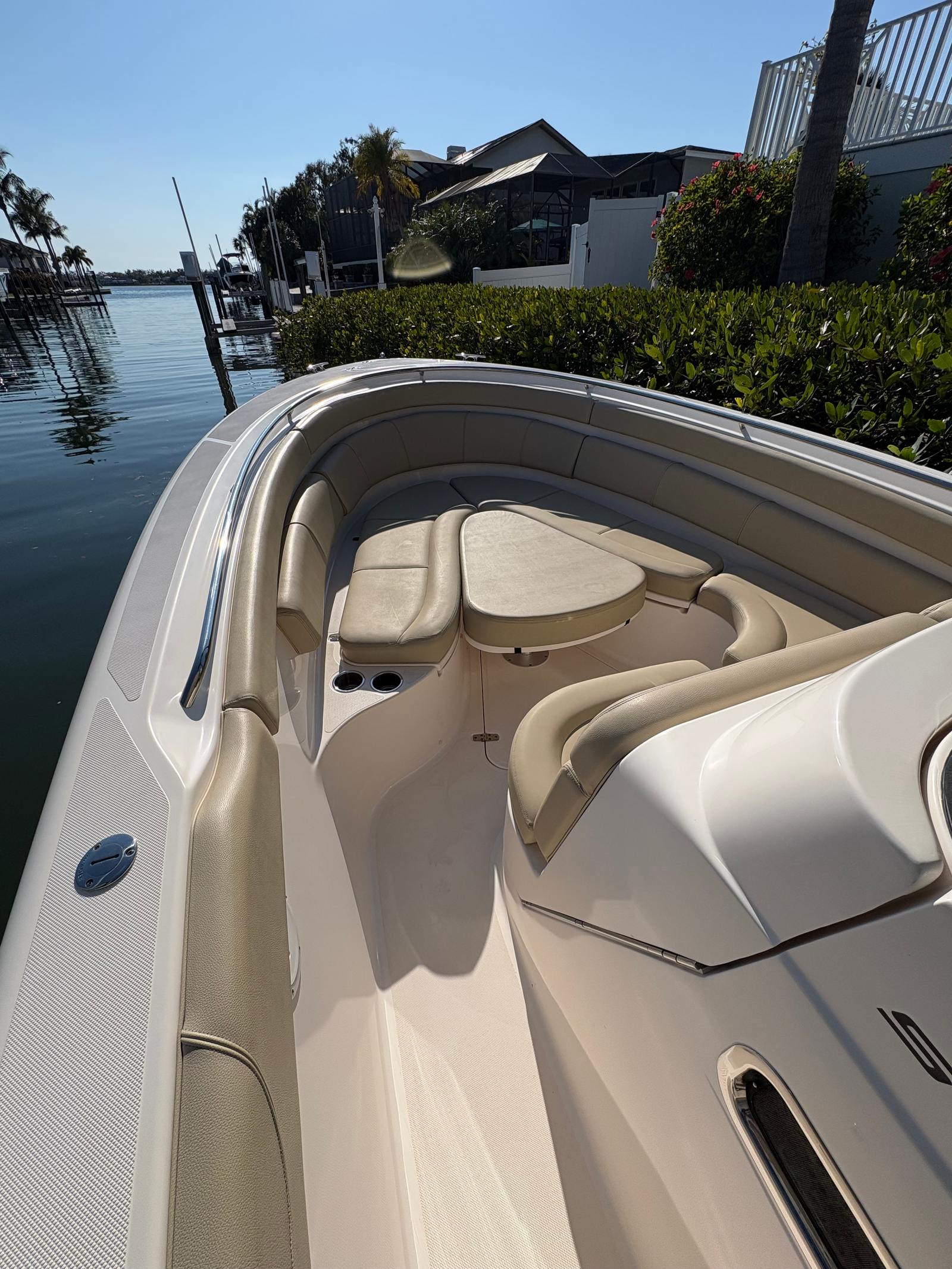 Forward, the bow becomes an inviting entertainment zone with a beautiful teak table. Insert the bow filler cushion and you’ve got a spacious sun pad perfect for relaxing at the sandbar.