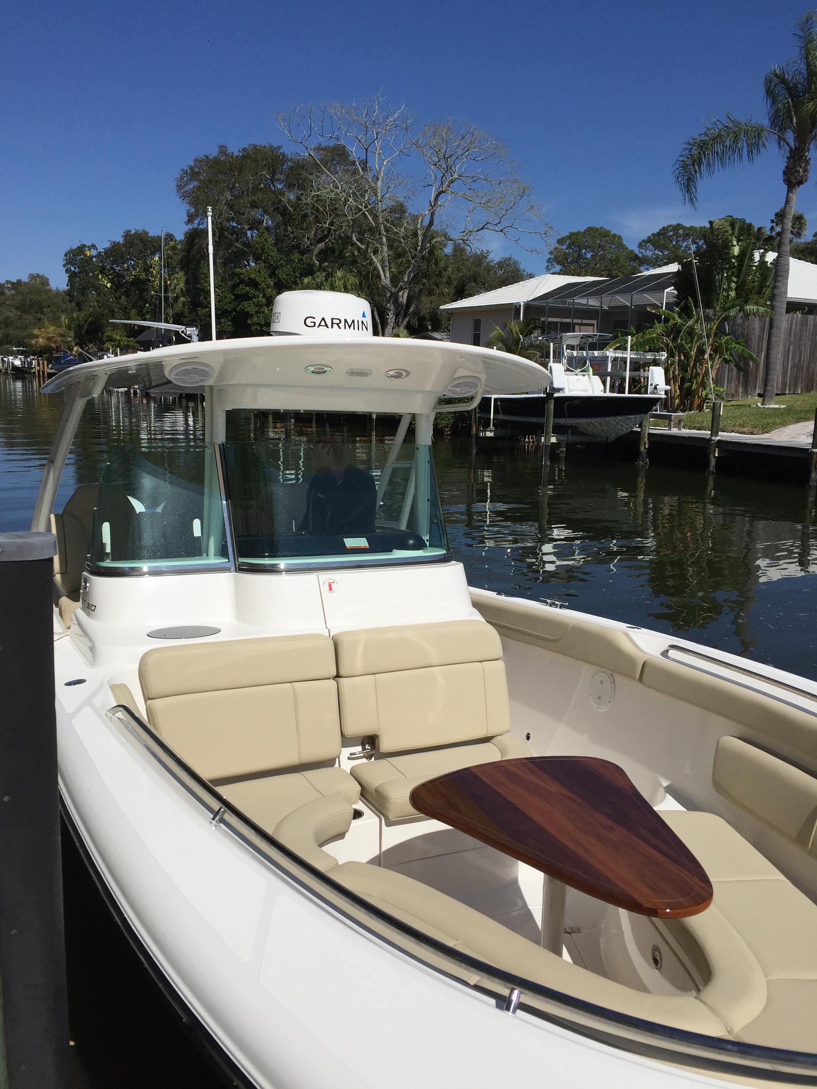 Inside the console, you’ll find a freshwater head and sink, giving you the convenience needed for longer days on the water. The Polk audio system provides excellent sound whether you’re underway or at anchor.