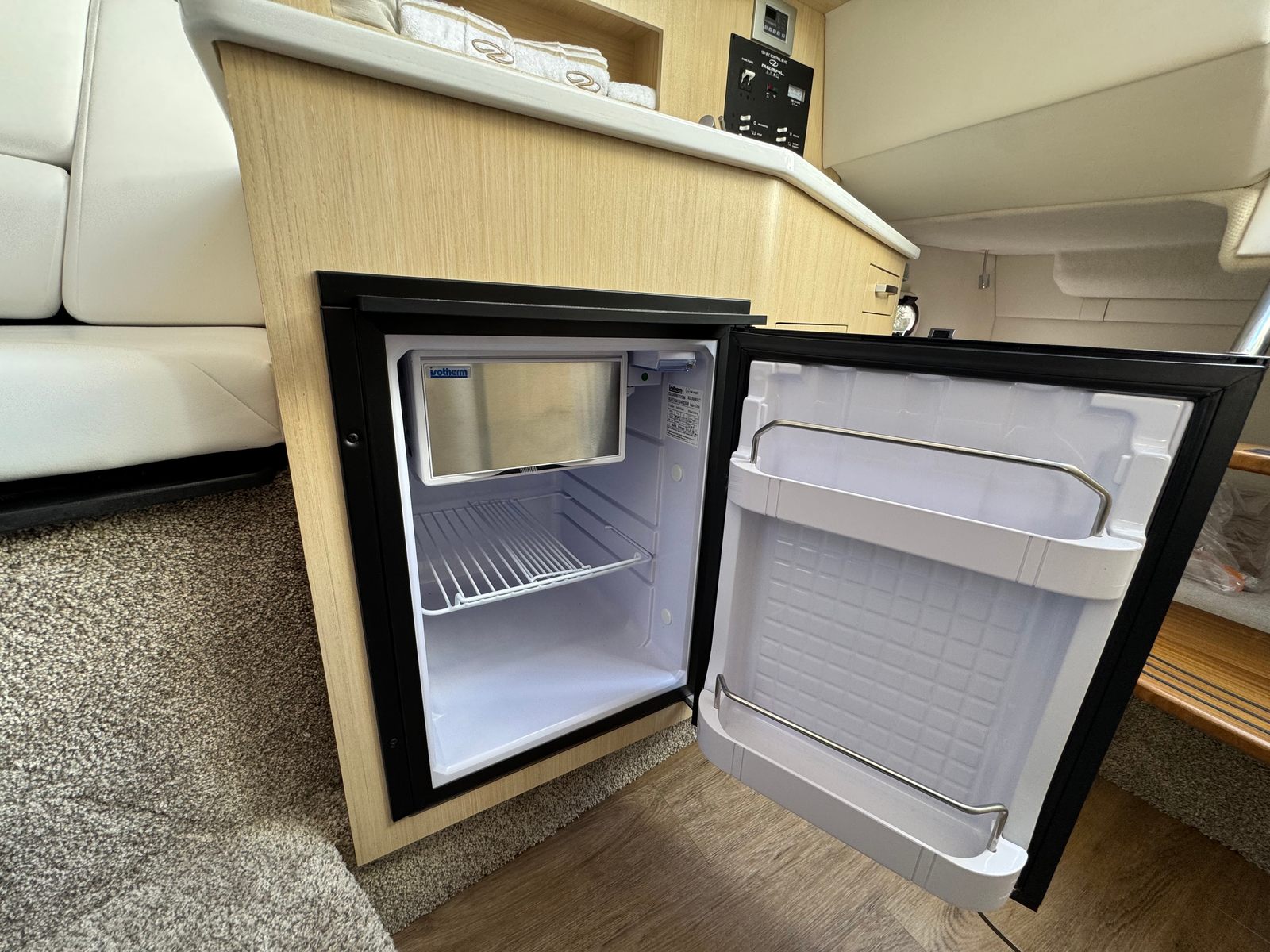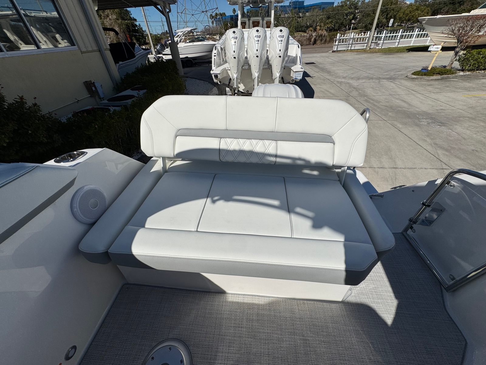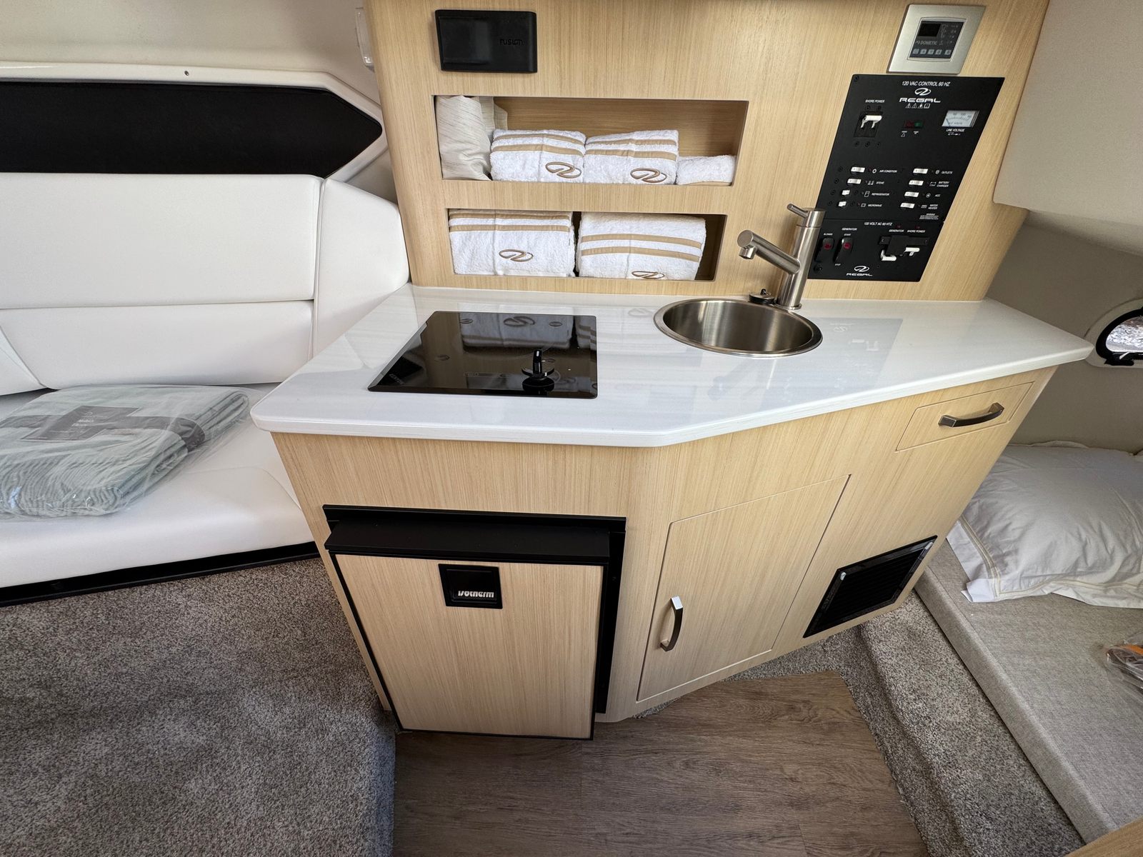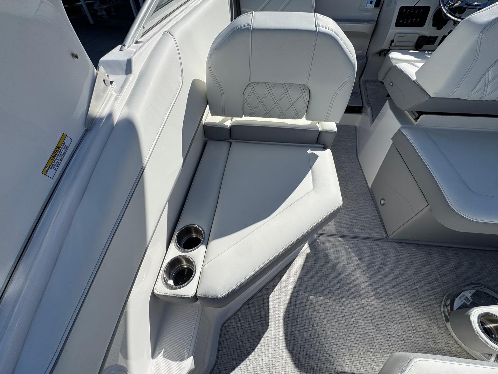 The Regal 26 XO is packed with special features that elevate your time on the water. The hull’s Tahiti Beach White color, paired with the Mediterranean Blue bootstripe and canvas, creates a striking visual appeal that turns heads at every marina. The bottom color matches the hull for a cohesive look, while the aft vent continues the elegant theme. Inside, the Titanium upholstery provides both style and comfort, making every journey a pleasure.For added convenience and protection, this cruiser comes equipped with a cockpit cover and a full enclosure, allowing you to enjoy boating in various weather conditions. The Mediterranean Blue canvas adds a touch of sophistication, while the cockpit seagrass mat enhances comfort underfoot. The Snowcap feature further accentuates the boat’s luxurious feel, ensuring that every detail is designed with your enjoyment in mind.