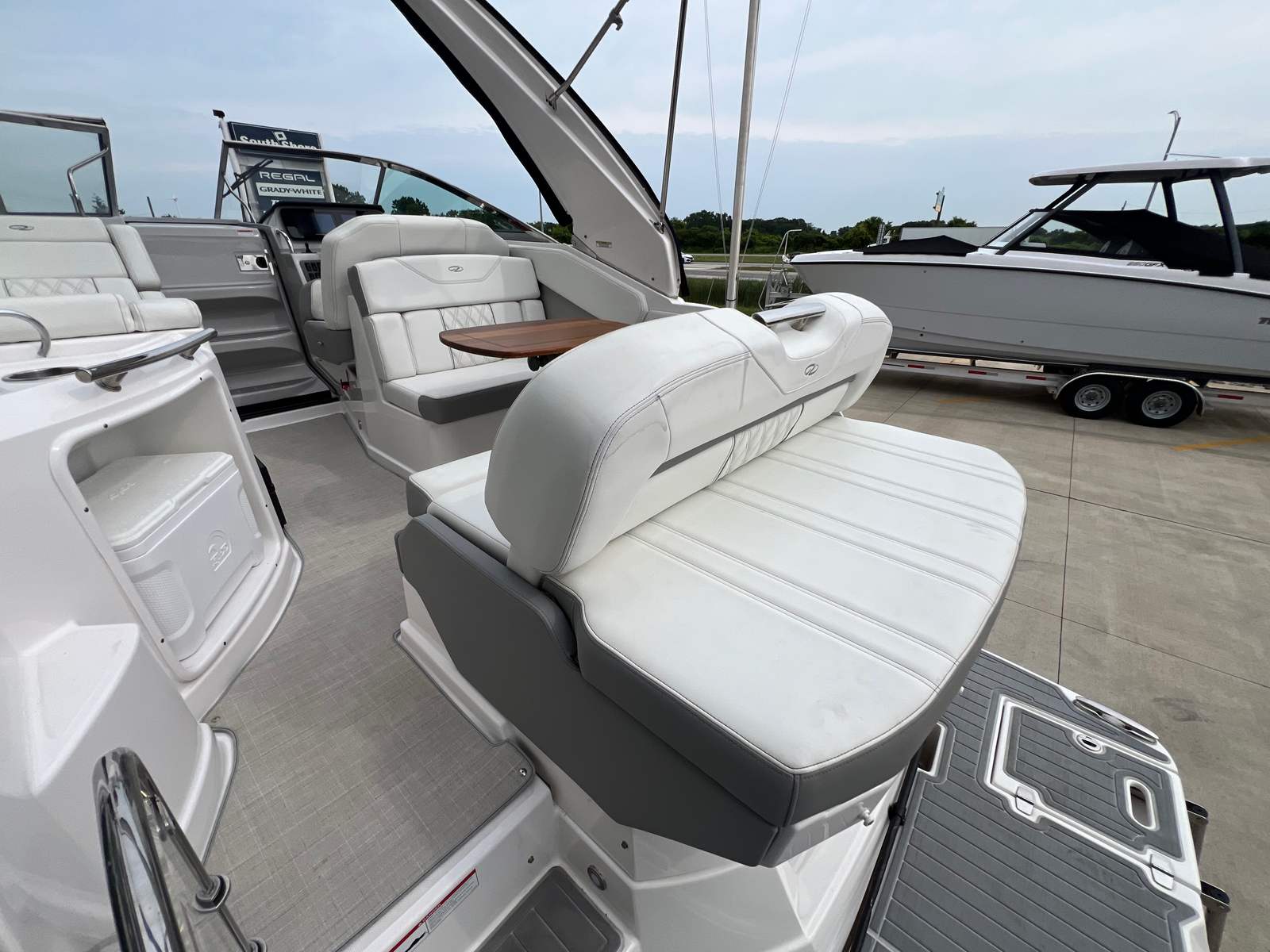 This Regal boat for sale is loaded with features that enhance both functionality and enjoyment. The dual 9-inch glass cockpit displays provide clear, intuitive navigation and system monitoring, making piloting the boat a breeze. The Garmin GSD24 and B60 transducer, along with the Garmin VHF 110, ensure you have the latest in marine electronics for safe and efficient travel. For music lovers, the stereo system comes equipped with a satellite tuner and antenna, so you can enjoy your favorite tunes wherever your journey takes you.The DeaDek from the swim platform is color-matched to the hull, offering both style and comfort underfoot. The white power tower adds a modern touch and provides shade and support for water sports activities. Blue underwater lighting creates a captivating ambiance during evening cruises, making every outing feel special. The anchor windlass with an all-chain setup simplifies anchoring, giving you peace of mind and convenience when you want to stop and enjoy the scenery.