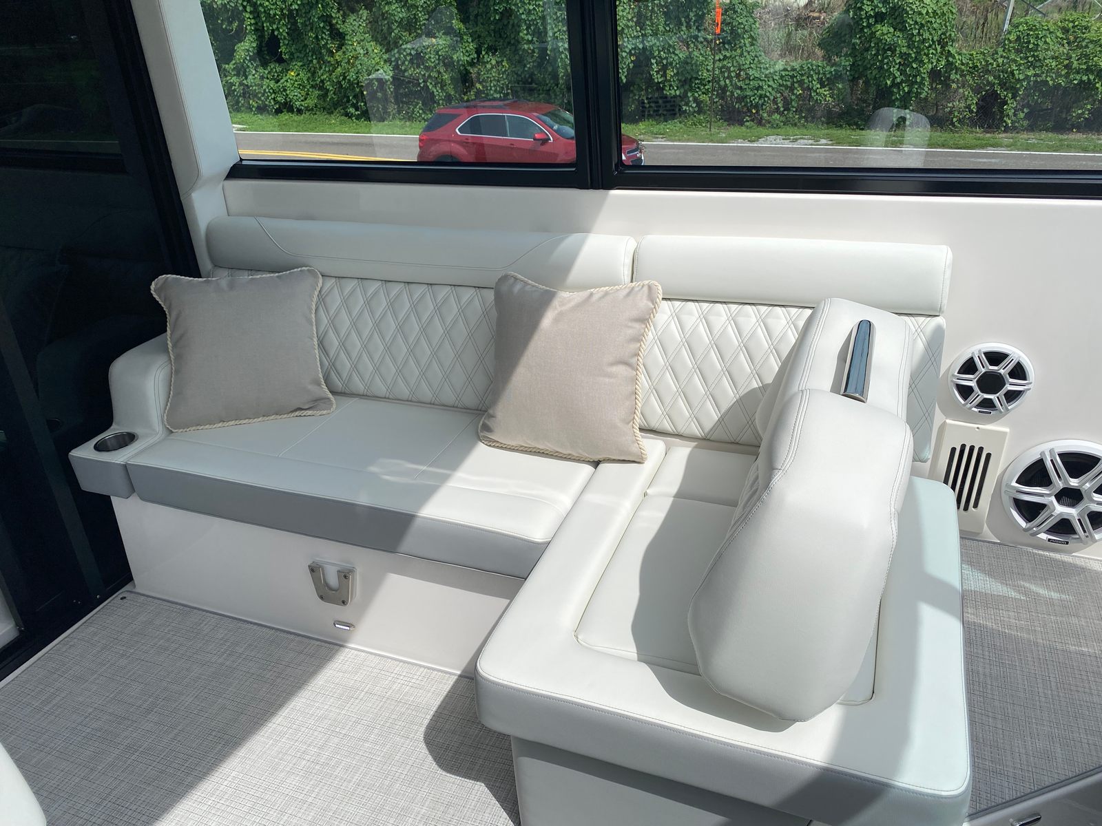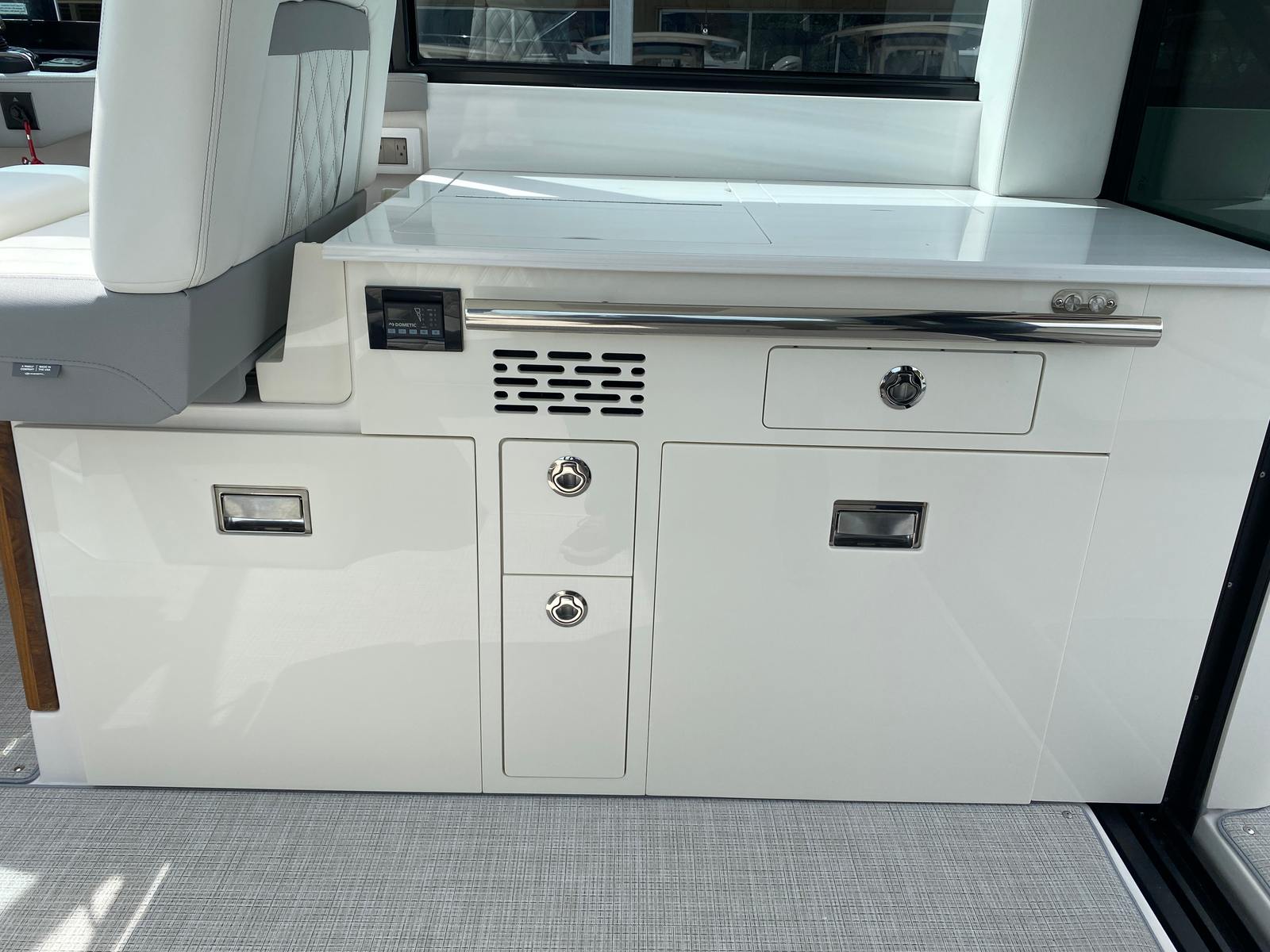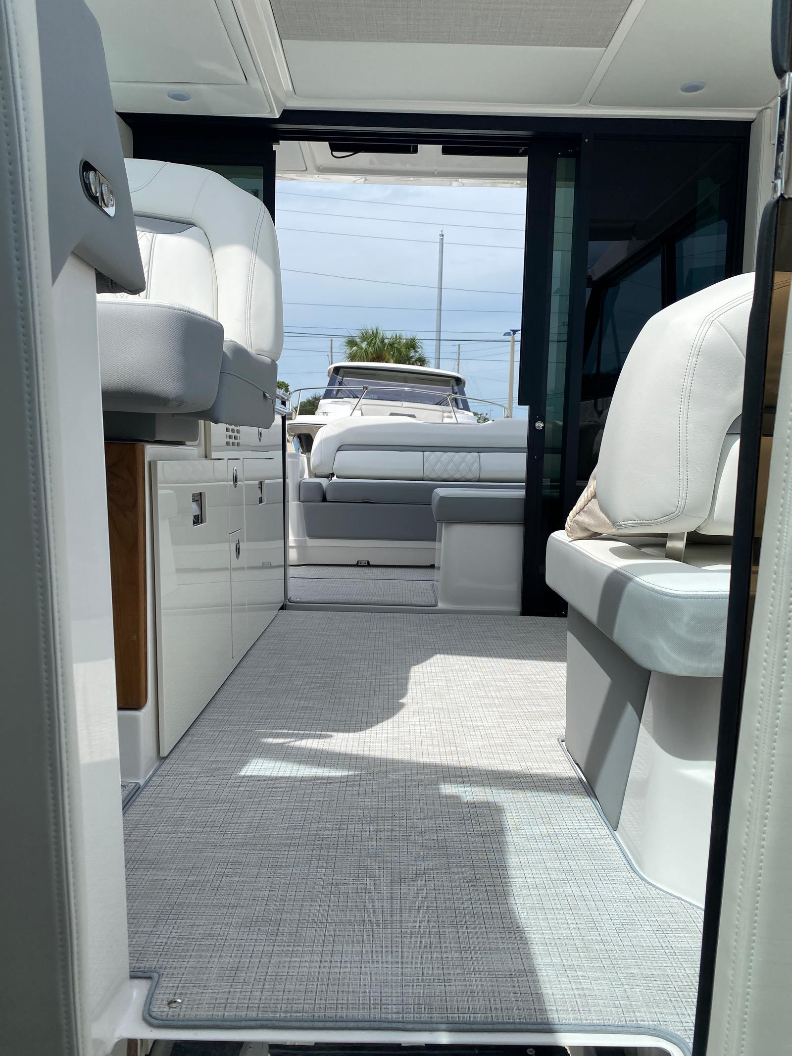 Practicality meets luxury in the Regal 36 XO. The yacht’s thoughtful design includes ample storage for gear, supplies, and personal items, making it easy to keep your space organized and clutter-free. Docking is a breeze thanks to the responsive twin engines, allowing you to navigate marinas and harbors with confidence. The yacht’s efficient performance also means you can enjoy longer trips without worrying about excessive fuel consumption.The cockpit seagrass mat provides a non-slip surface, enhancing safety while adding a touch of sophistication. The Strato Wind countertops are both durable and stylish, making them perfect for preparing meals or serving drinks during gatherings. Every detail of the Regal 36 XO is designed to make ownership easy and enjoyable, so you can focus on making memories with your loved ones.