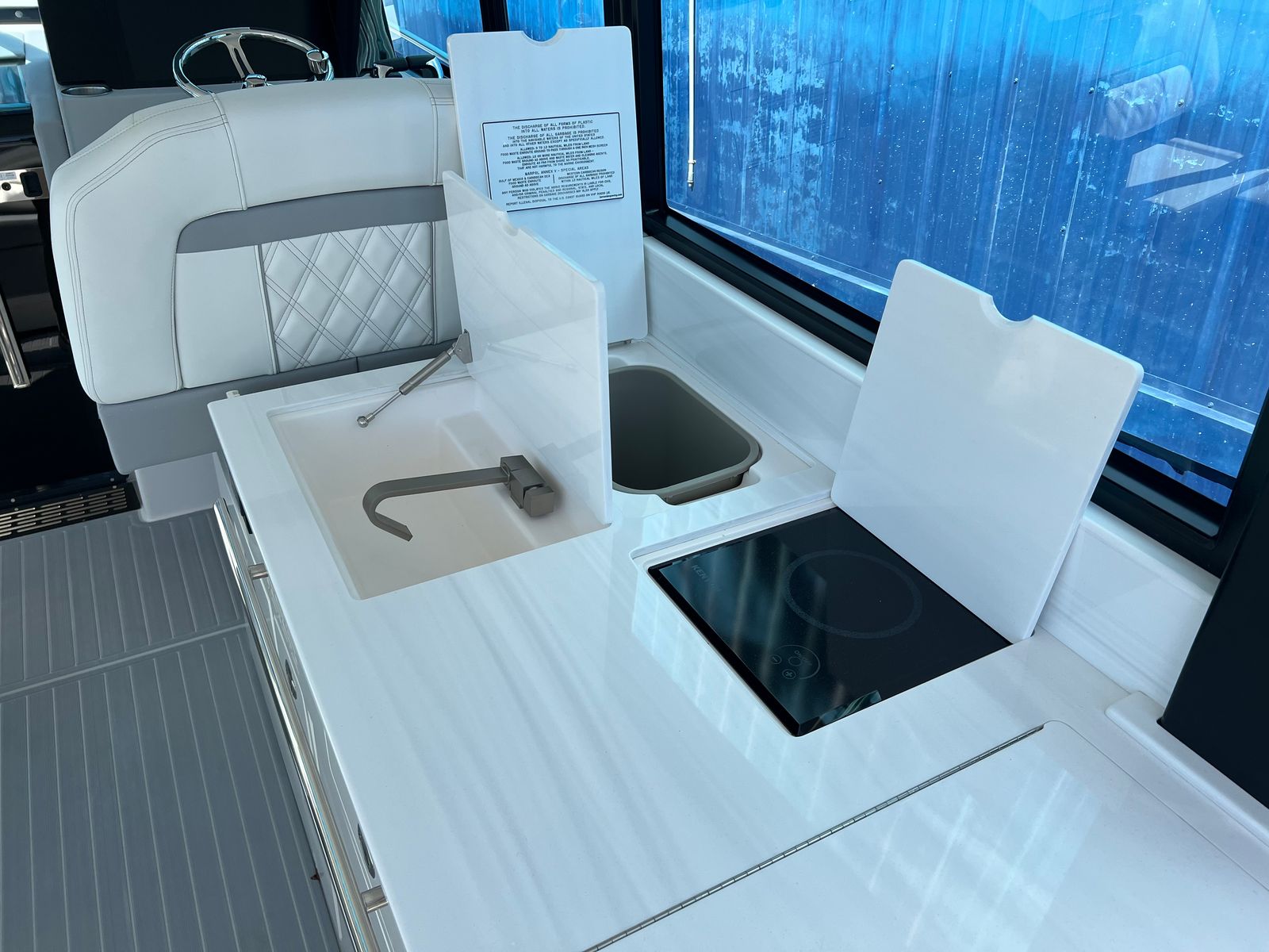 The 2026 Regal 36 XO is loaded with features designed to enhance your time on the water. The yacht’s exterior is a visual masterpiece, featuring a graphite hull, Belle Isle Blue bootstripe, and graphite bottom color that ensure you turn heads wherever you go. The Titanium interior offers a modern, luxurious environment, perfect for relaxing or entertaining guests. For those sunny days, the manual bow sunshade system provides welcome relief, allowing you to enjoy the outdoors in comfort. The Makrolon salon enclosure offers protection from the elements while maintaining clear views and an open feel. Transom seat covers in black canvas add a touch of elegance and help protect your seating when not in use. Notably, this yacht comes with no bottom paint, preserving the clean, sleek look of the hull.
