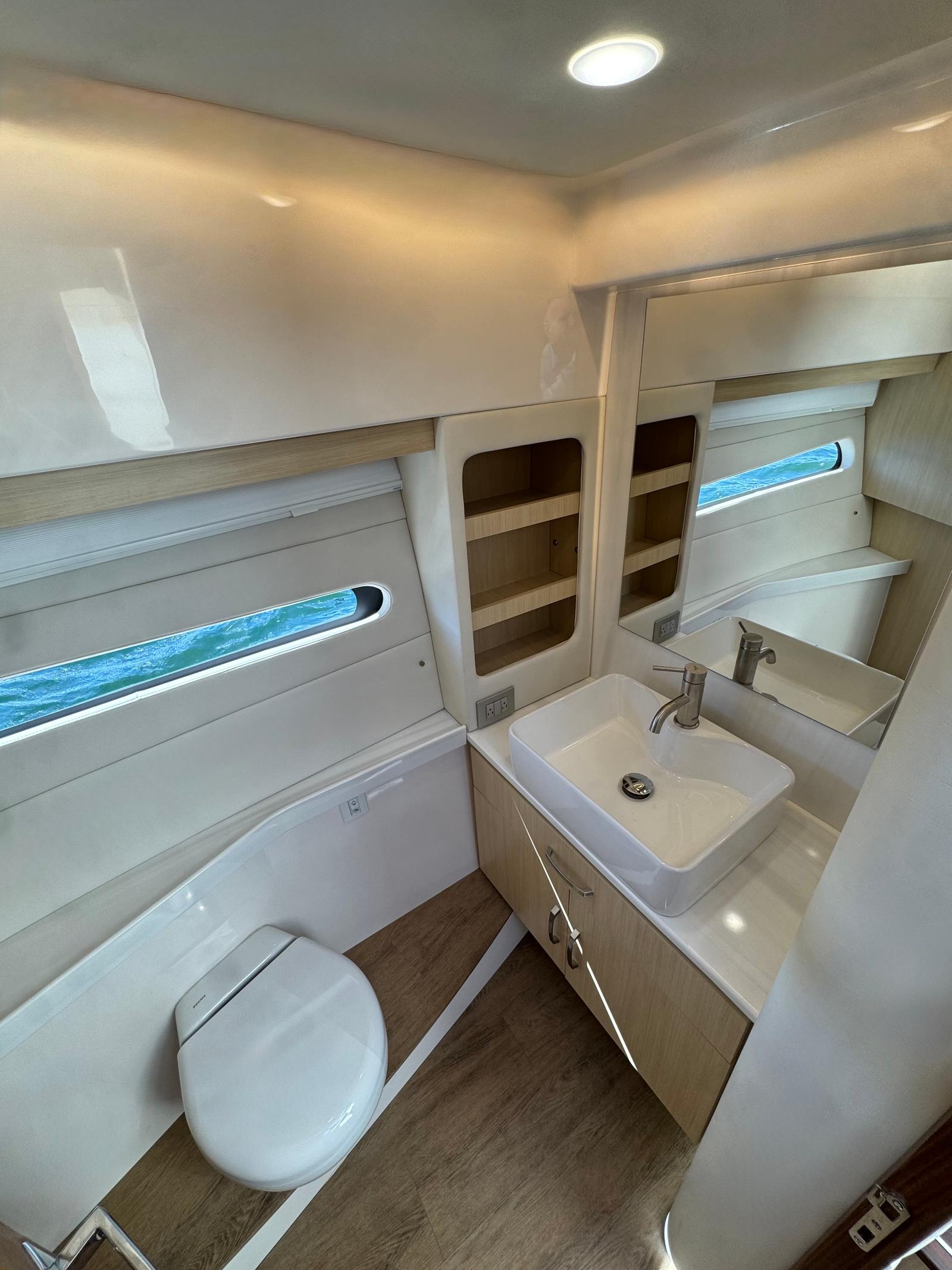 The galley, combined with the outdoor refreshment center, offers a versatile space perfect for meal prep and entertaining guests, making it easy to create the ideal dining experience on the water.