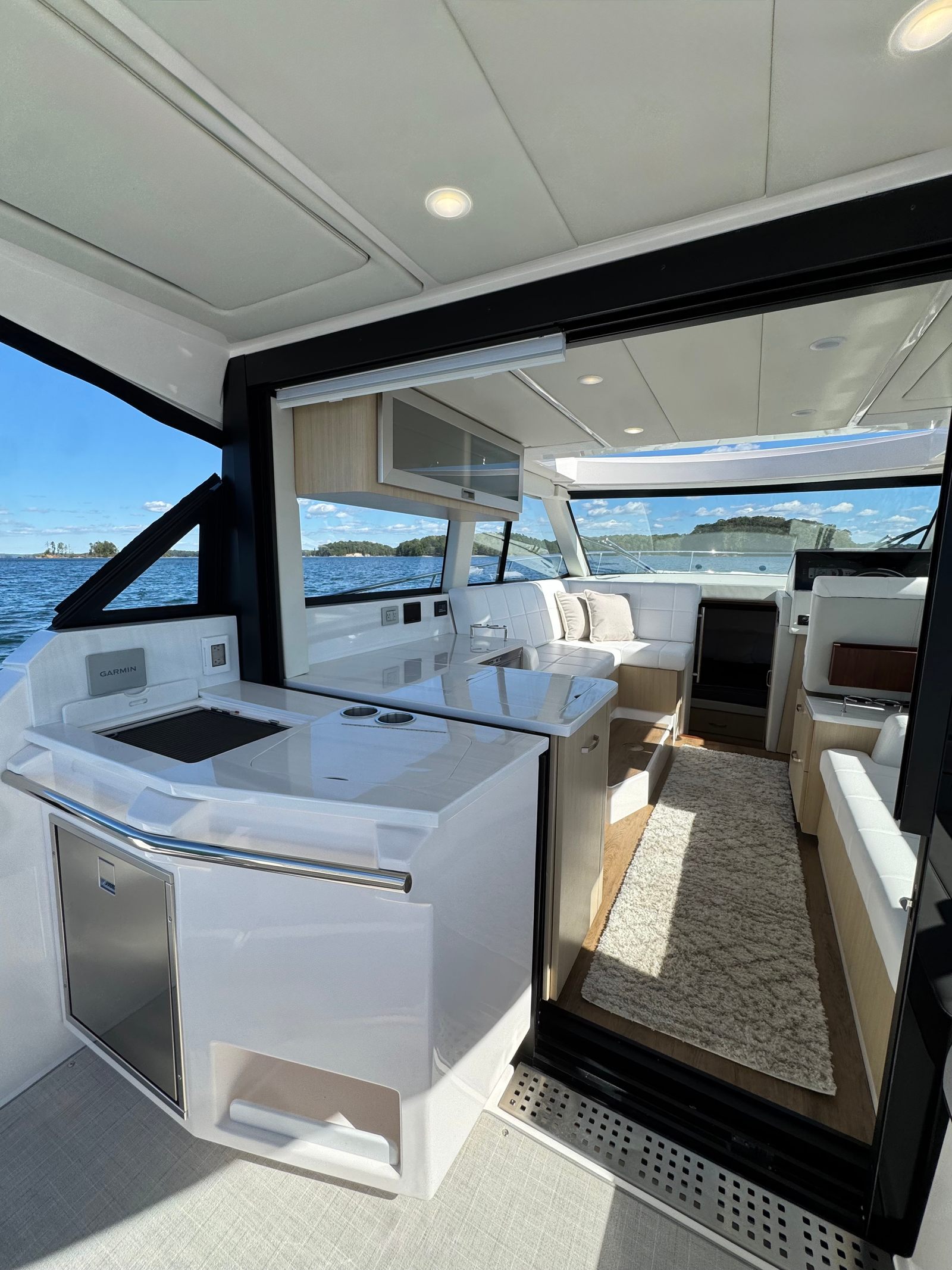 With the push of a button, lower the large window and slide open the enclosure doors to effortlessly connect the cockpit with the salon, creating a seamless transition between indoor and outdoor living spaces.