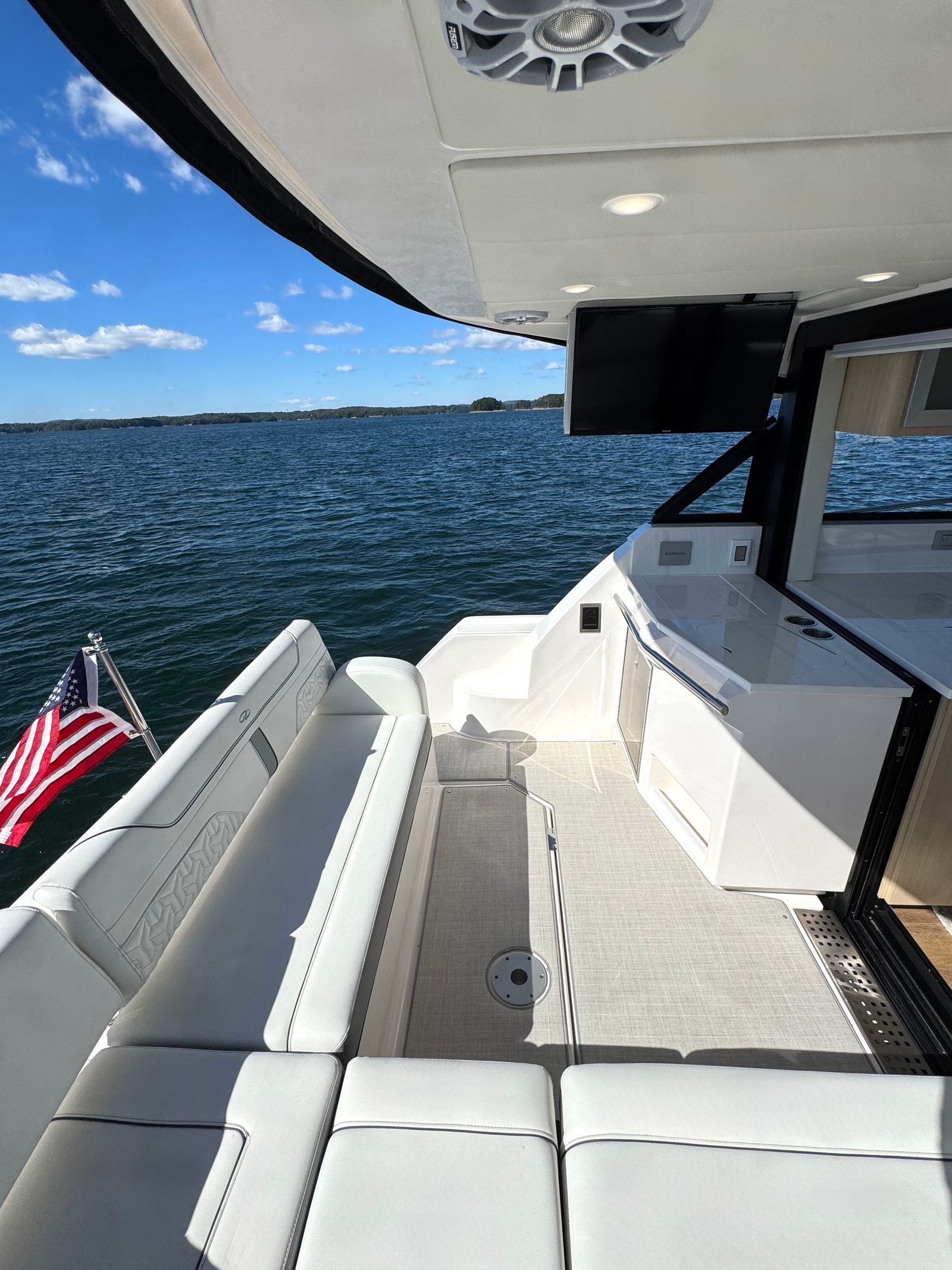 The vinyl-wrapped helm with hand-stitched accents exudes true luxury, while the dual 16” Garmin displays, joystick, and autopilot enhance the boating experience, ensuring ease of control and precision.