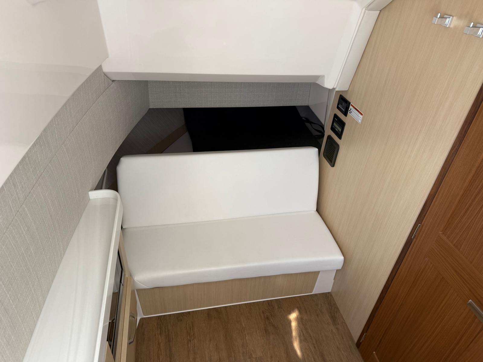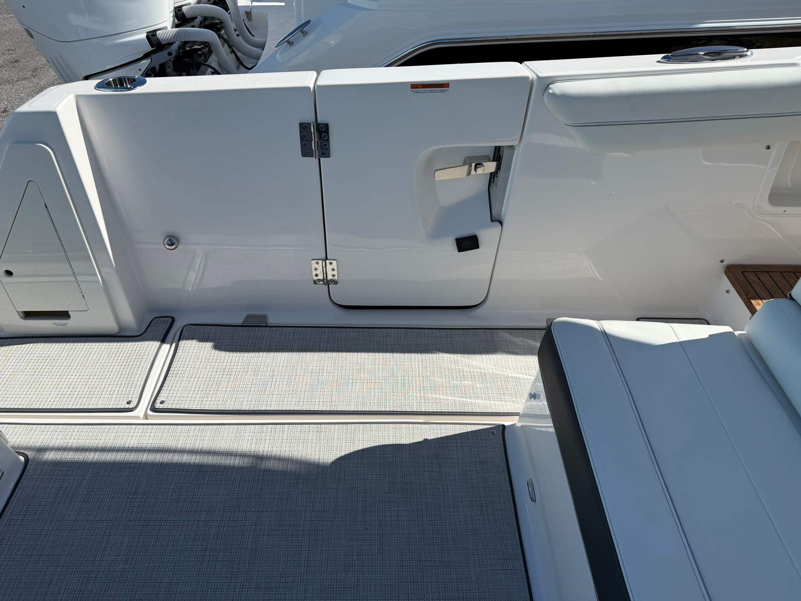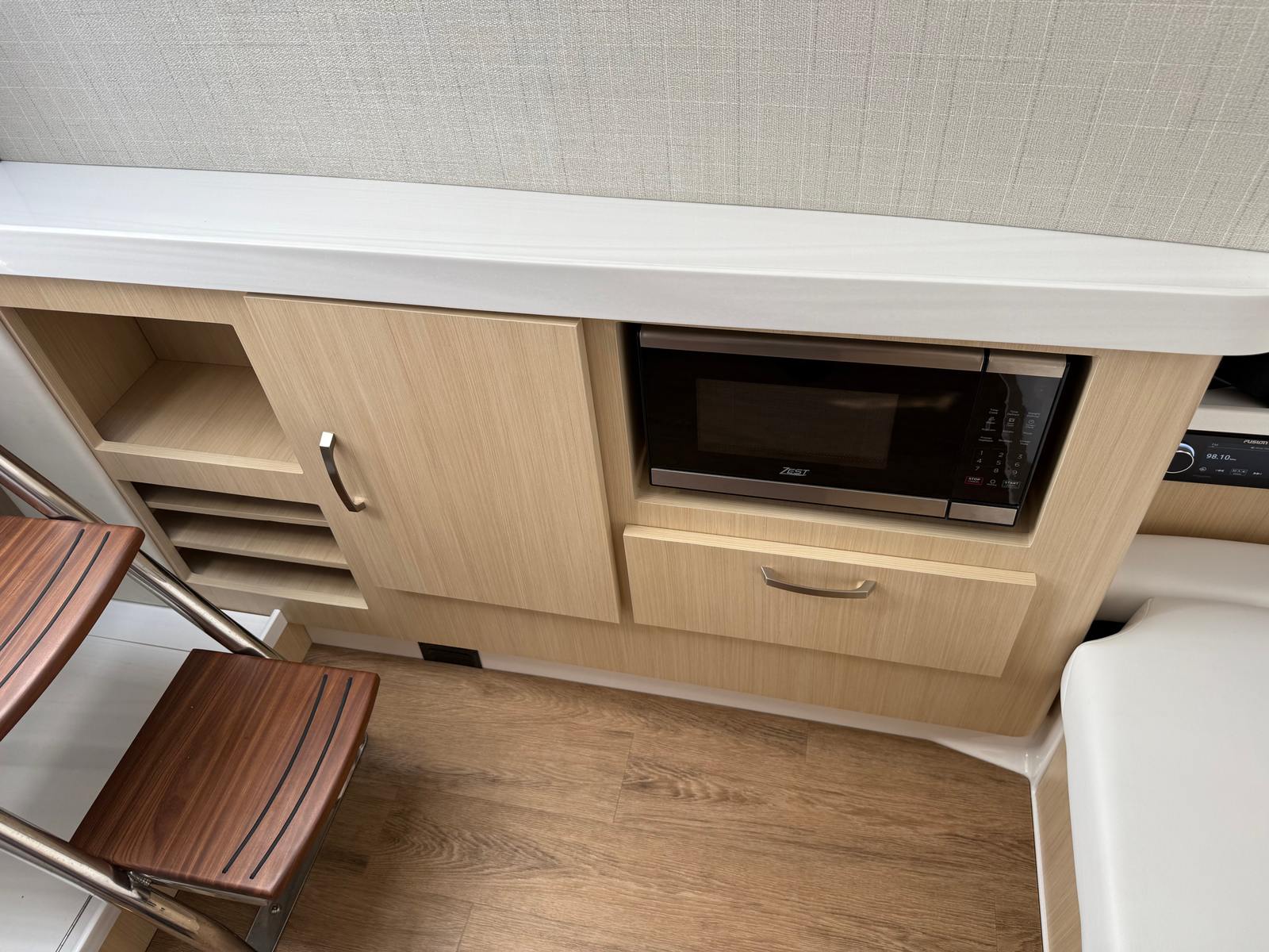 The Regal 38 SAV is packed with special features that elevate your boating experience to new heights. The triple Yamaha F300NSB2 engines provide unmatched power and efficiency, while the integrated steering system ensures precise control. The hull’s Steel Grey finish, Graphite bootstripe, and Tahiti Beach White bottom create a visually stunning exterior that reflects Regal’s commitment to quality and style. The multi-zone color scheme, featuring Pure White, Graphite, Lunar Grey, and Graphite Grey, adds depth and character to the yacht’s appearance, making it a true standout on the water. Every detail of the Regal 38 SAV is crafted to enhance both aesthetics and functionality, ensuring you enjoy every moment aboard.