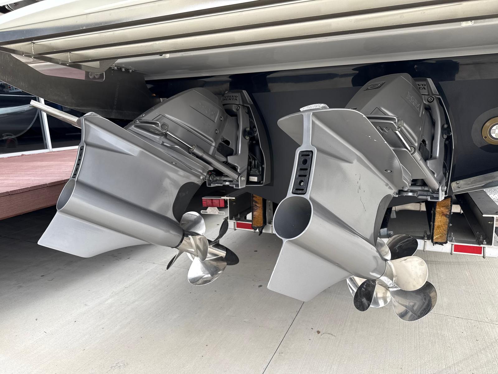 This Regal 38 Surf is loaded with special features that elevate your boating experience. The striking Steel Gray hull color, paired with the black boot stripe and bottom paint, gives the boat a modern, sporty look that’s sure to impress. Inside, the Saddle Brown base color is complemented by Z3SBC Saddle Brown, Z2DCS Denim Cement, and Z6GG Graphite Grey accents, creating a warm and inviting space for you and your guests. The PowerShade feature offers convenient sun protection, allowing you to enjoy long days on the water in comfort. The twin Volvo V8 engines with joystick control provide not only power but also ease of operation, making this bowrider ideal for both seasoned boaters and newcomers alike.
