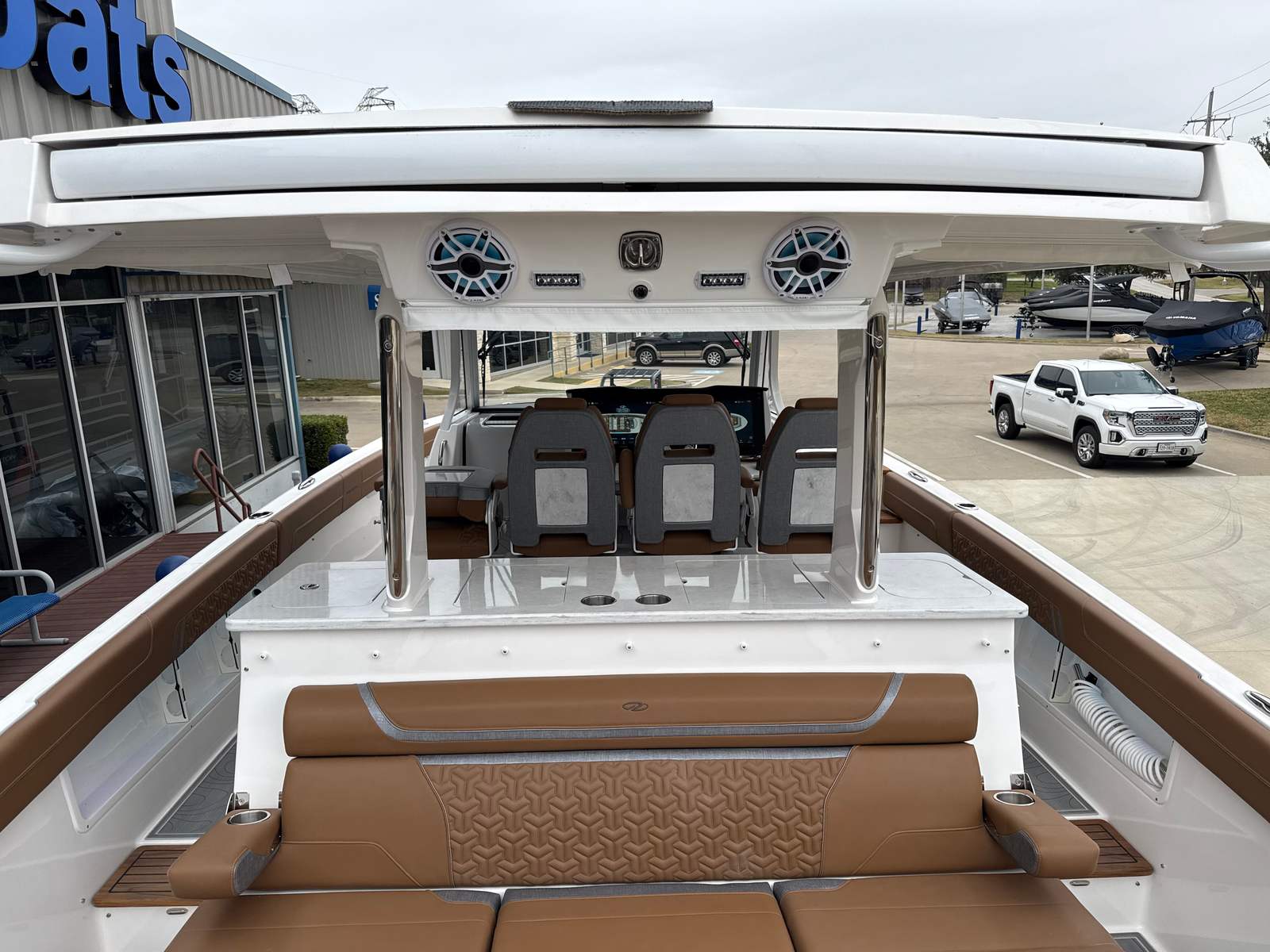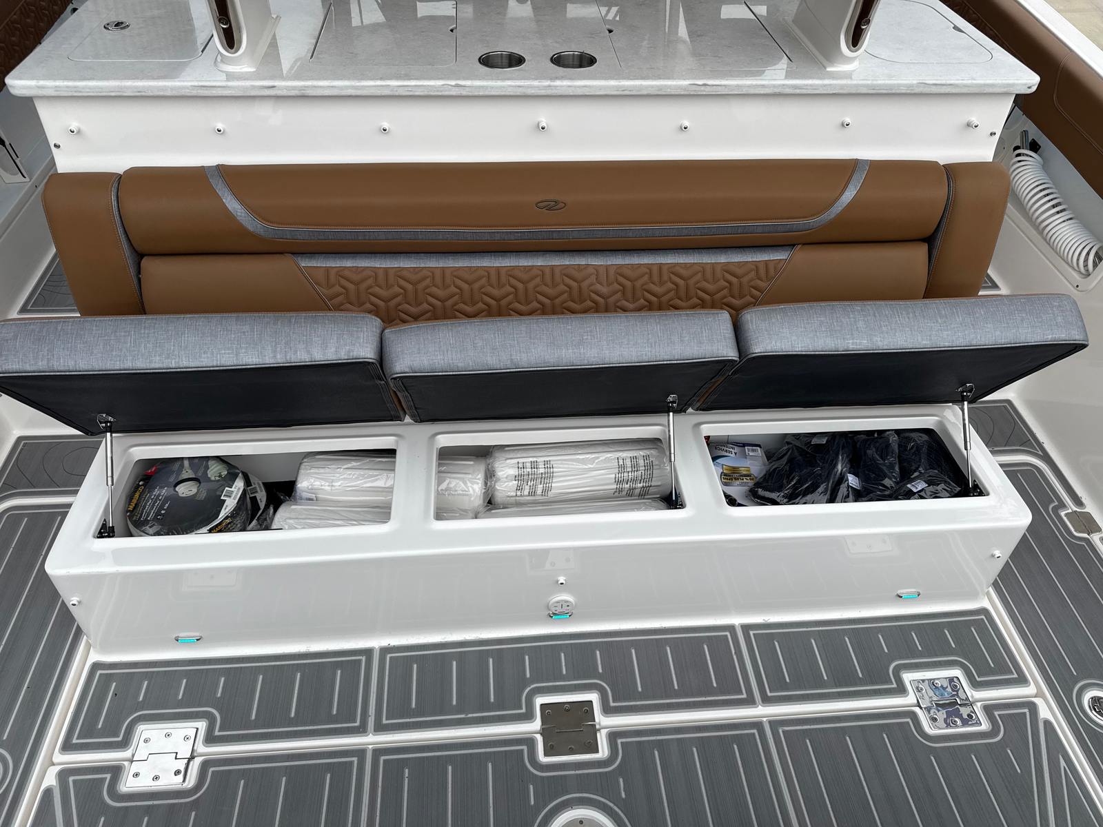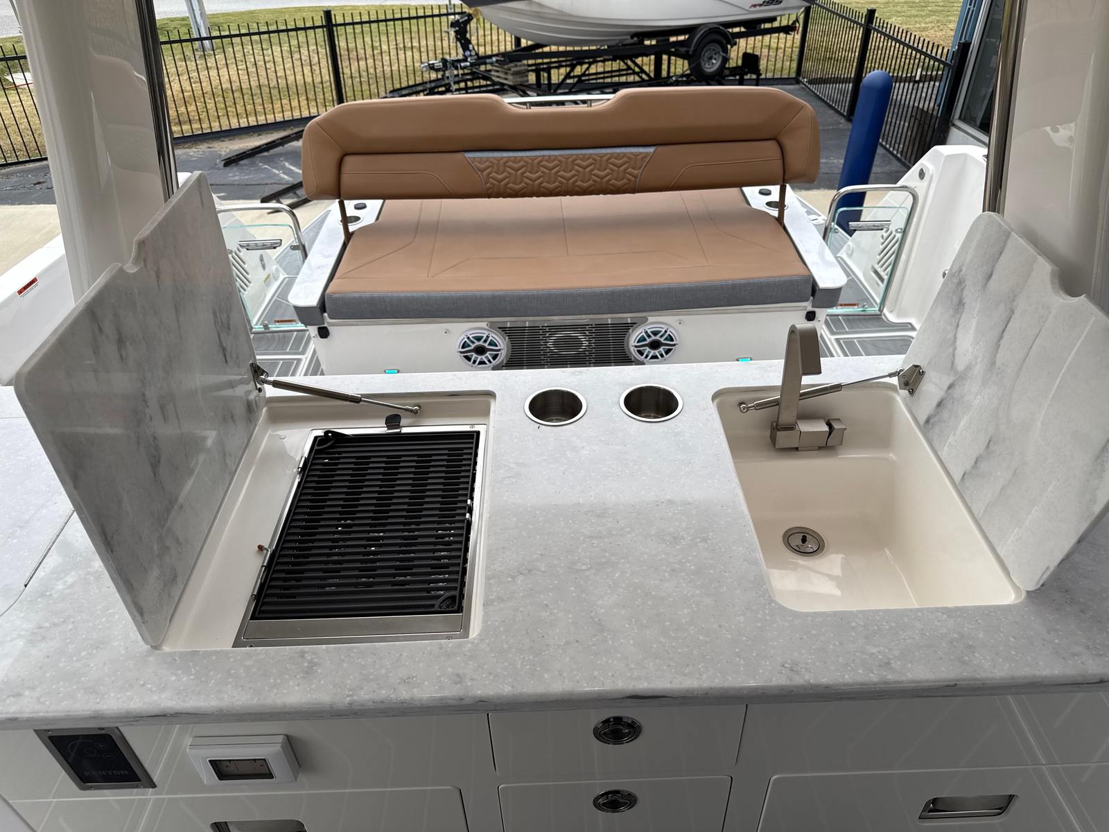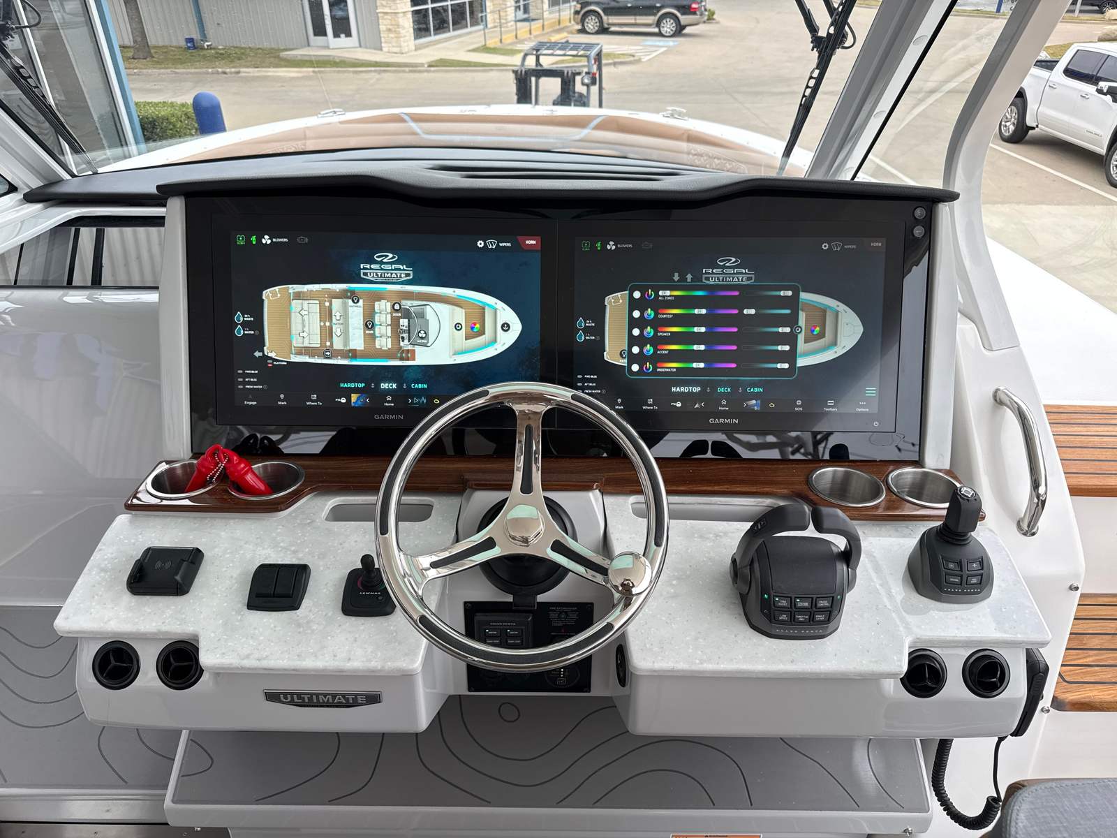 The Regal 38 Surf is designed with practicality in mind, making ownership as enjoyable as it is exciting. The intuitive joystick control system simplifies docking and maneuvering, reducing stress and making every trip more enjoyable. The ample storage options throughout the boat ensure that all your gear, water toys, and essentials are easily accessible and neatly stowed. The PowerShade feature provides adjustable sun protection, allowing you to stay cool and comfortable during long days on the water. The durable bottom paint and high-quality materials ensure that your investment remains protected and looking great for years to come.