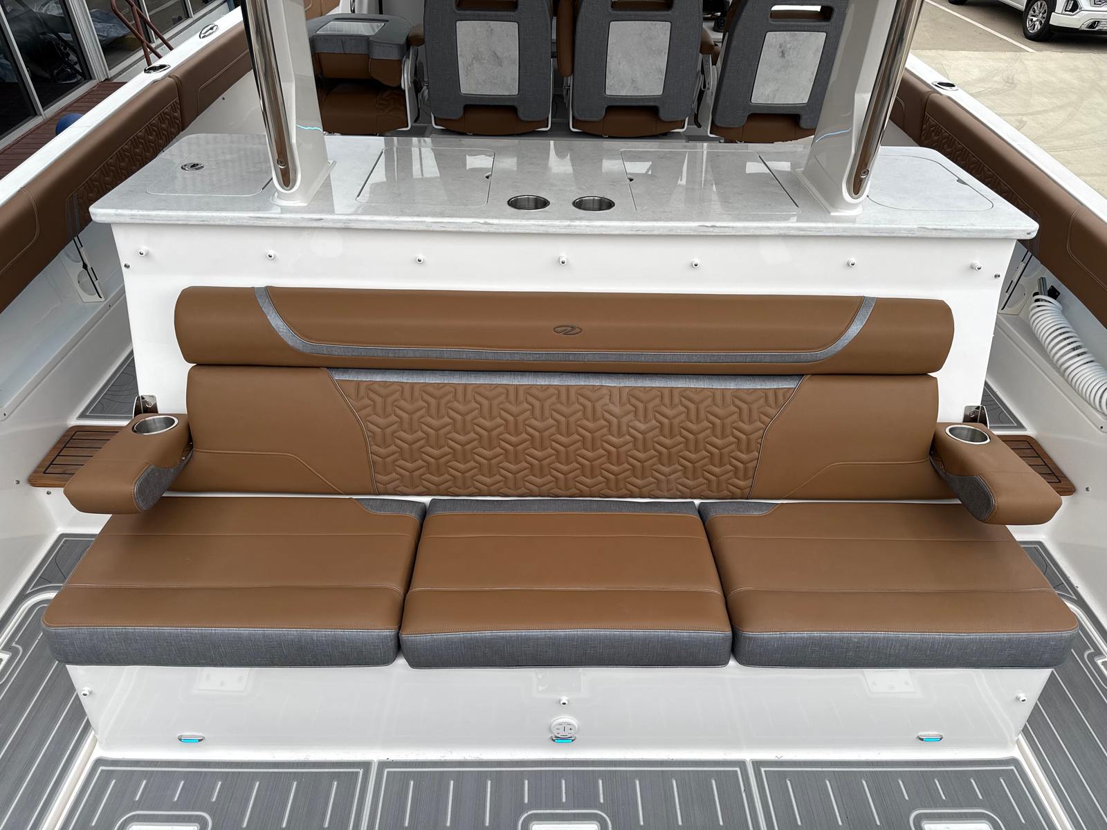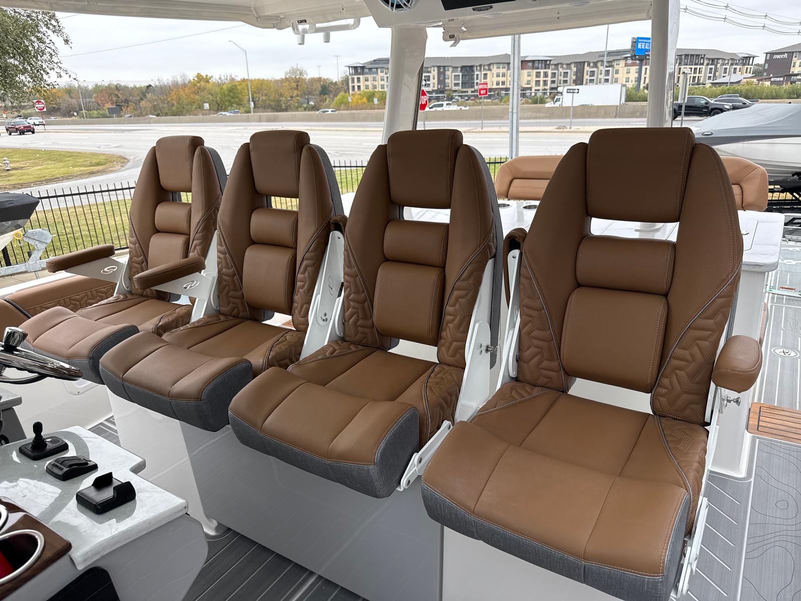 The 2026 Regal 38 Surf stands out as a premier bowrider boat for sale, boasting a generous length of 39.17 feet. Its sleek, modern profile is accentuated by a sophisticated Steel Gray hull, complemented by a bold black boot stripe and bottom paint. The Saddle Brown interior base color, paired with Z3SBC Saddle Brown, Z2DCS Denim Cement, and Z6GG Graphite Grey accents, creates an inviting and upscale atmosphere that’s perfect for entertaining or relaxing. As a brand-new model, this Regal boat for sale offers the latest in design innovation and craftsmanship, ensuring you’ll turn heads at every marina and on every waterway.