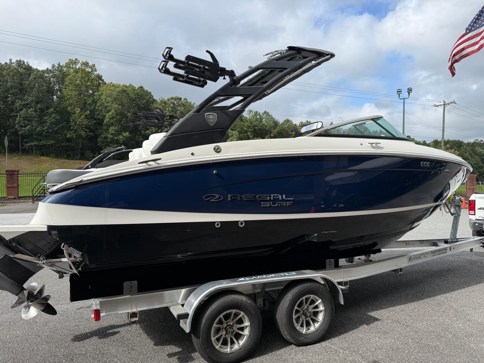 The LS4 Surf is packed with special features that set it apart from other Bowrider boats for sale. The Mediterranean Blue hull color is complemented by a striking Tahiti Beach White bootstripe, creating a sophisticated and eye-catching profile. Fender clips offer convenient docking and protection, while the watersport mirror ensures optimal visibility for drivers and spotters during active sessions. The SeaDek cockpit sole and SeaDek swim platform provide a soft, non-slip surface for added comfort and safety, whether you’re lounging or preparing for watersports.Bow walk-thru doors make moving between the bow and cockpit effortless, enhancing both safety and convenience. The stainless steel flag pole with a U.S. flag adds a touch of patriotic flair and elegance, while the black bottom color completes the boat’s modern aesthetic. Every detail of the LS4 Surf is designed to maximize enjoyment and usability, making it a standout choice for anyone seeking a Regal boat for sale with premium features.