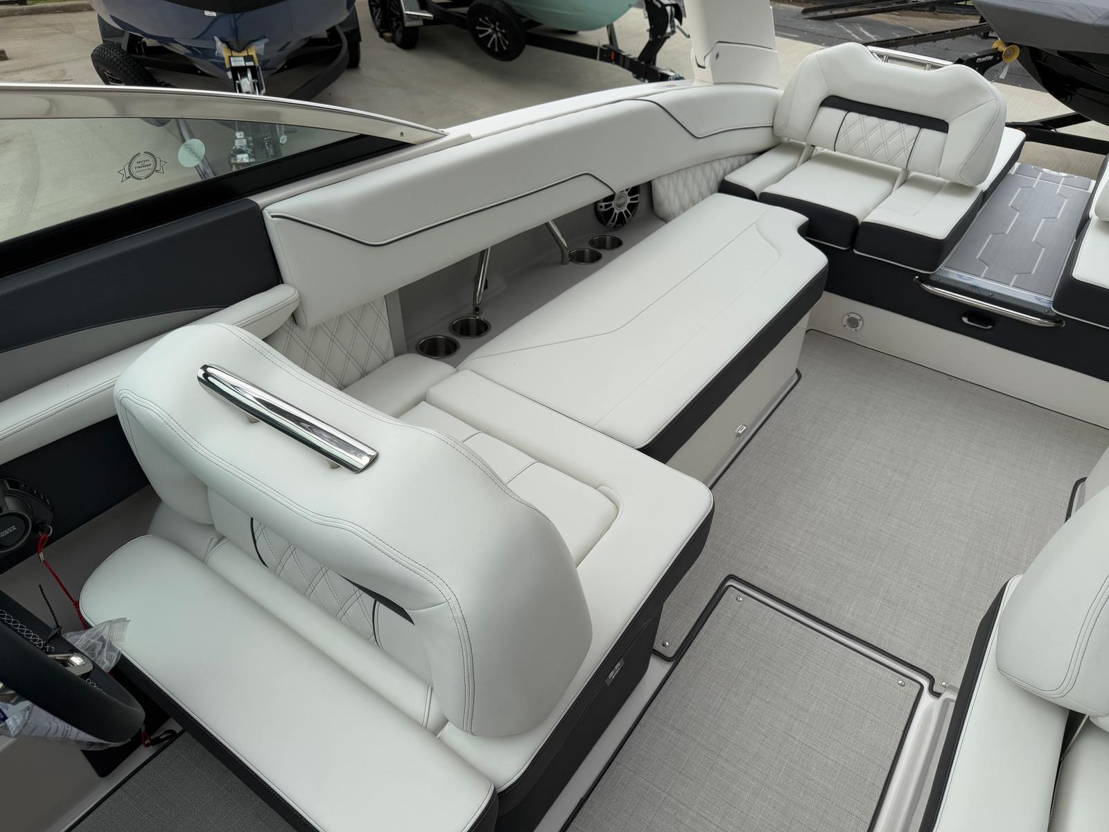Step aboard the Regal LS6 and discover a world of comfort and convenience. The boat’s special features are designed to enhance every aspect of your boating experience. The cockpit is adorned with a luxurious Seagrass Mat, offering a soft and stylish surface that’s both comfortable and easy to maintain. The SeaDek Swim Platform provides a safe and slip-resistant area for swimming, sunbathing, or preparing for water sports, ensuring everyone on board can enjoy the water with confidence.For added protection and peace of mind, the LS6 comes equipped with a travel storage cover in black, keeping your investment safe from the elements when not in use. The black canvas adds a touch of elegance while providing shade and shelter during sunny days. Practicality meets innovation with the dual battery switch, tray, and cables, allowing for seamless power management and extended time on the water. The onboard battery charger ensures your boat is always ready for adventure, minimizing downtime and maximizing fun.