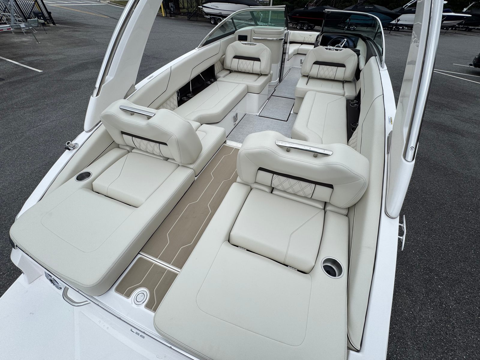 The Regal LS6 Bowrider is as practical as it is luxurious. Its generous length provides ample storage for gear, water toys, and personal items, keeping the deck clutter-free and organized. The PowerTower makes docking and storing the boat easier, while the dual battery system ensures you have reliable power for extended outings. The efficient Volvo V8 engine offers excellent fuel economy, so you can spend more time enjoying the water and less time refueling.The Cockpit Seagrass Mat not only adds comfort but is also easy to clean, making maintenance a breeze. The boat’s thoughtful layout allows for easy movement and access to all areas, so you can focus on having fun without worrying about logistics. Whether you’re planning a day trip or a weekend adventure, the LS6 is equipped to handle your needs with style and ease.